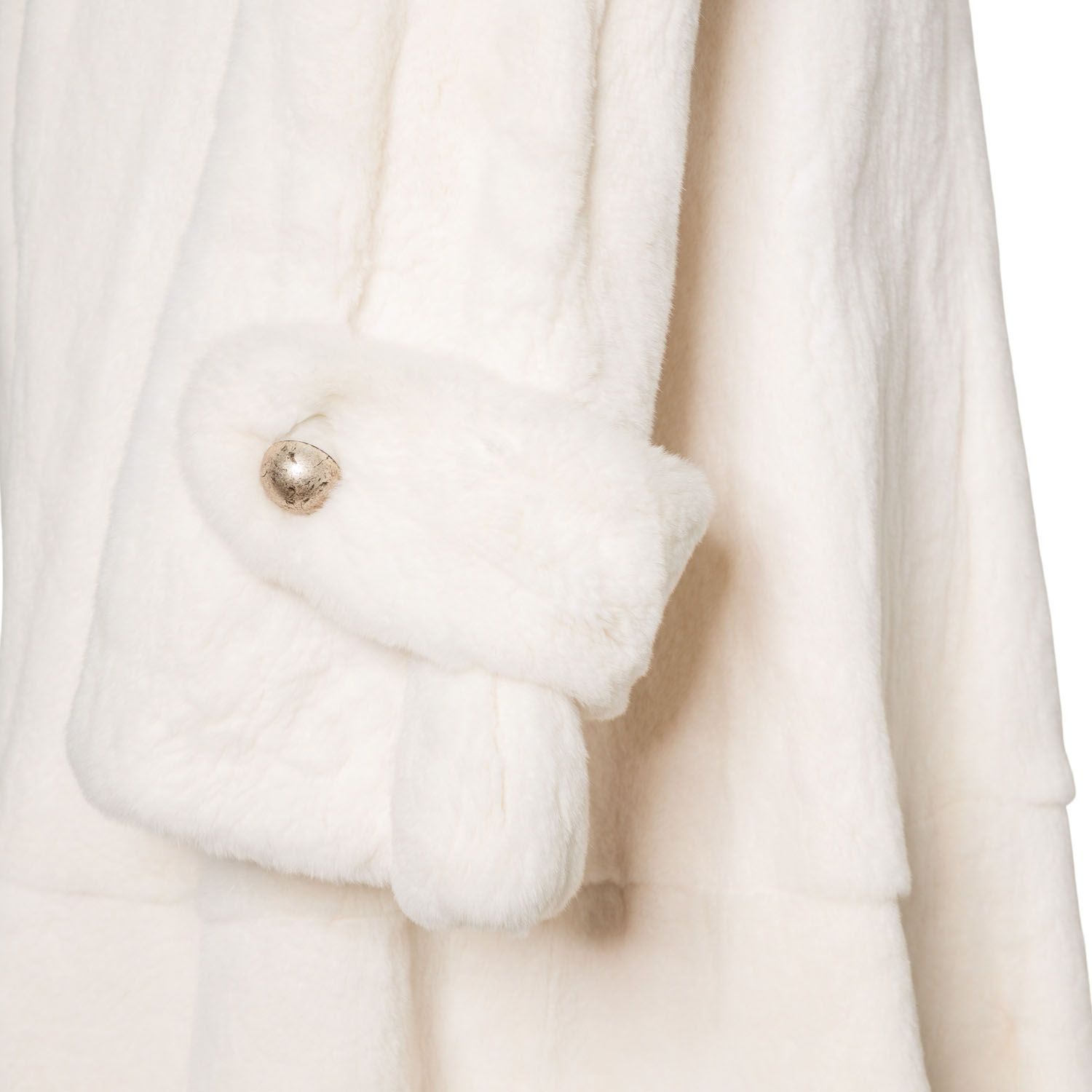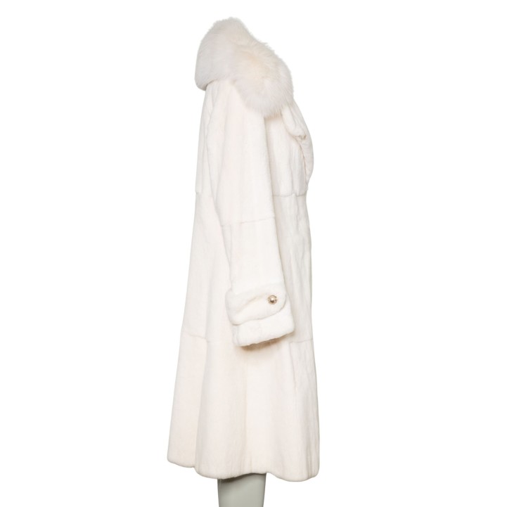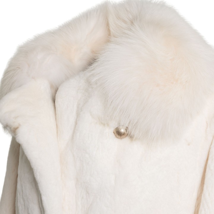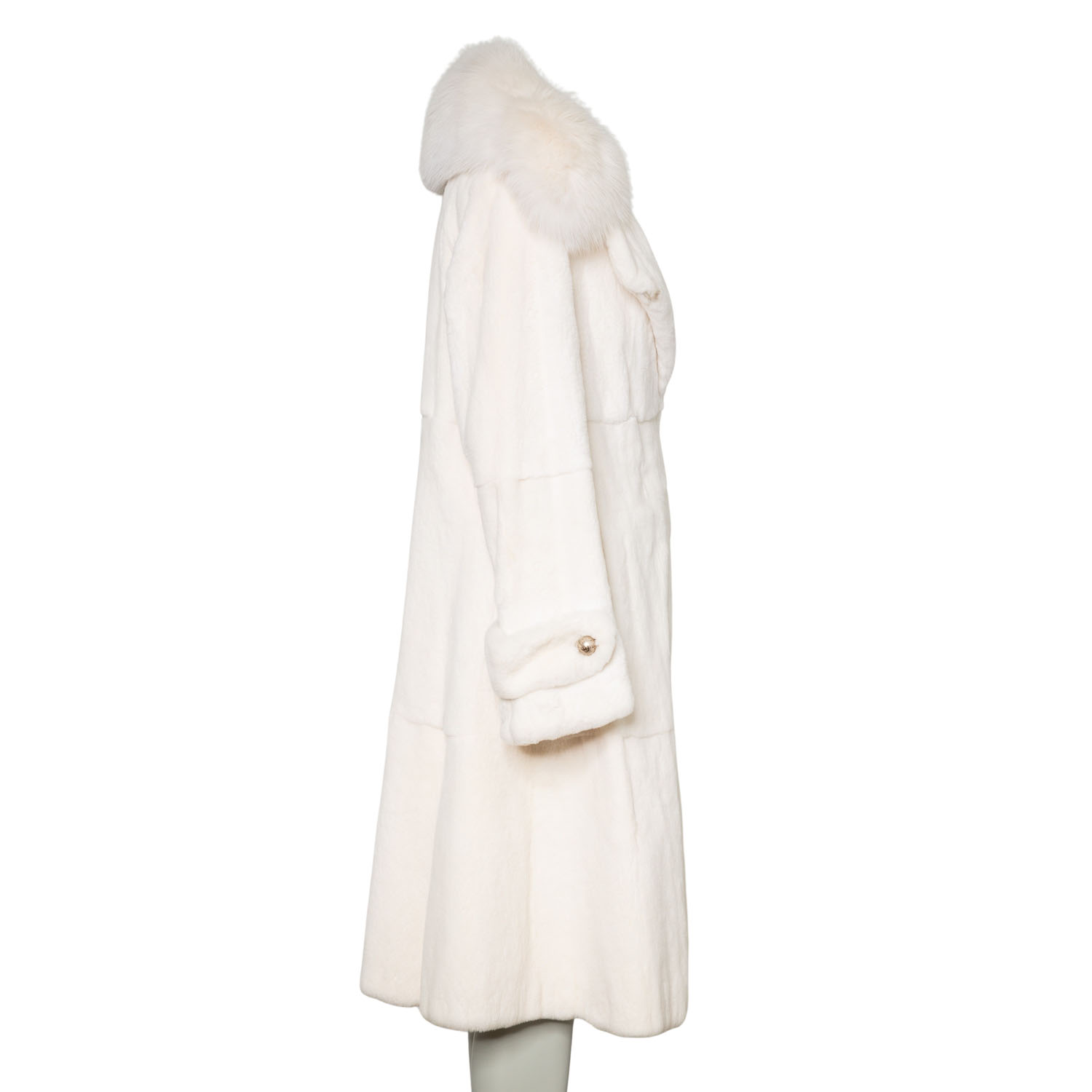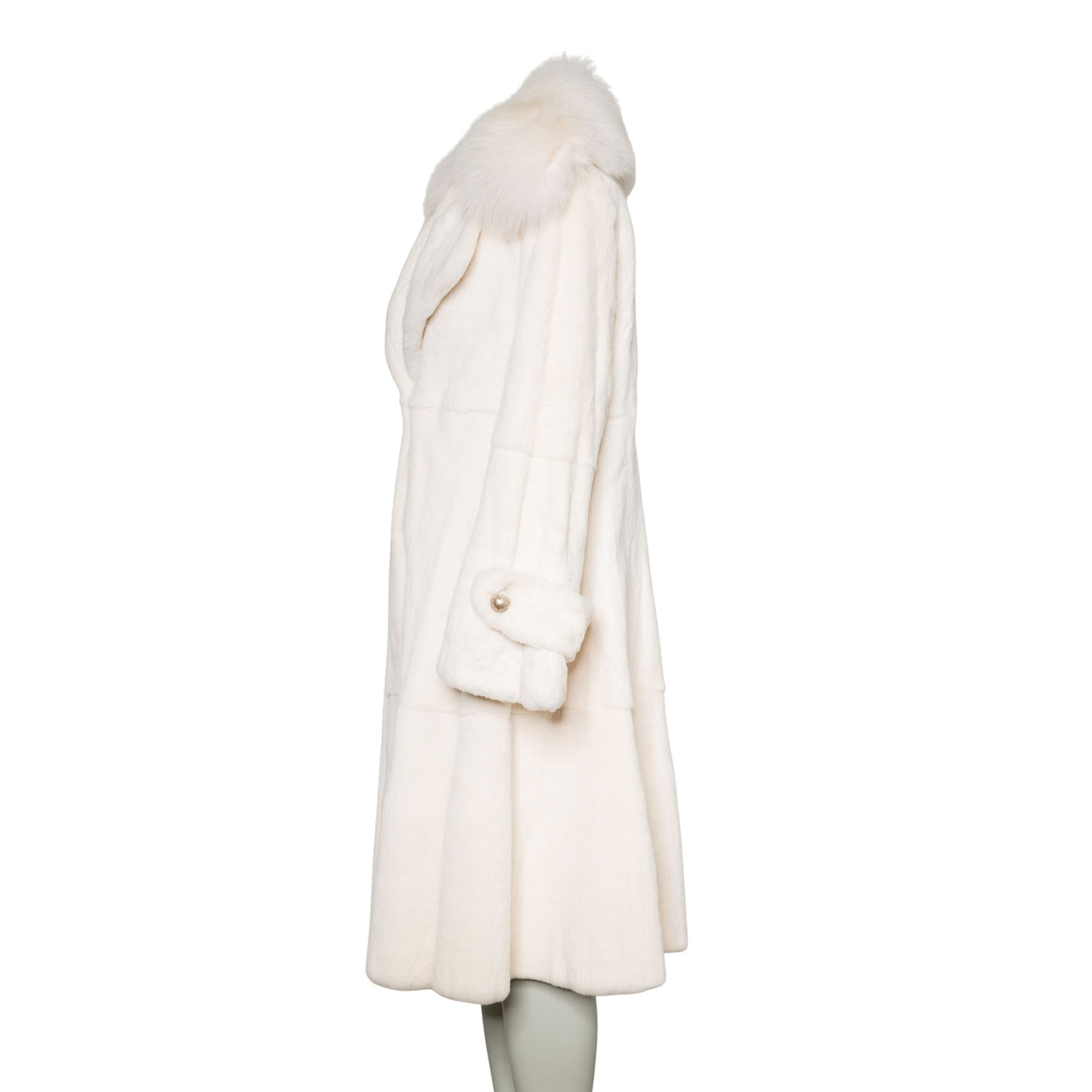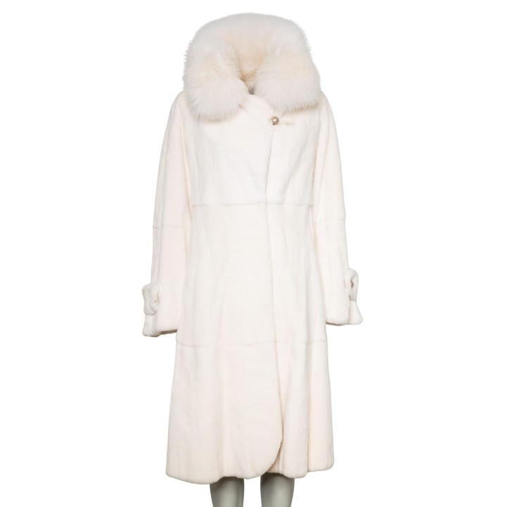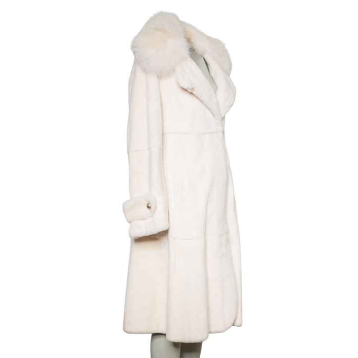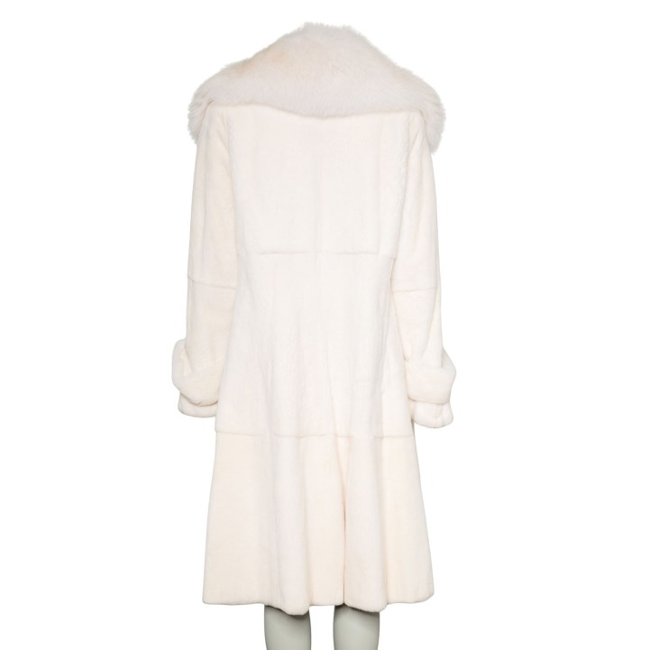 Geschorene Felle in Cremefarben mit Riemen an den Ärmelsäumen, Fuchskragen, Eingrifftaschen sowie Haken- und Ösenverschluss. Tragespuren vorhanden.
