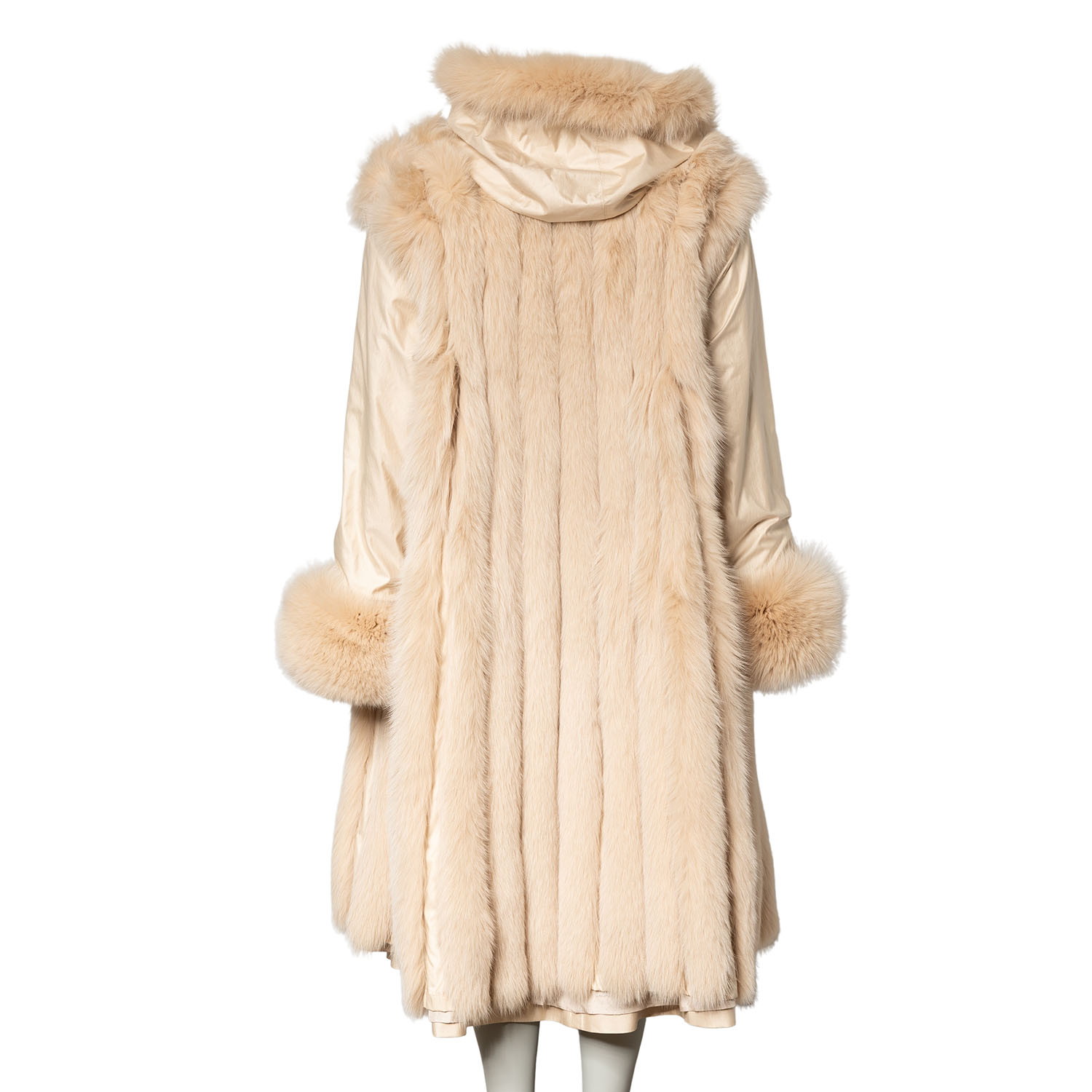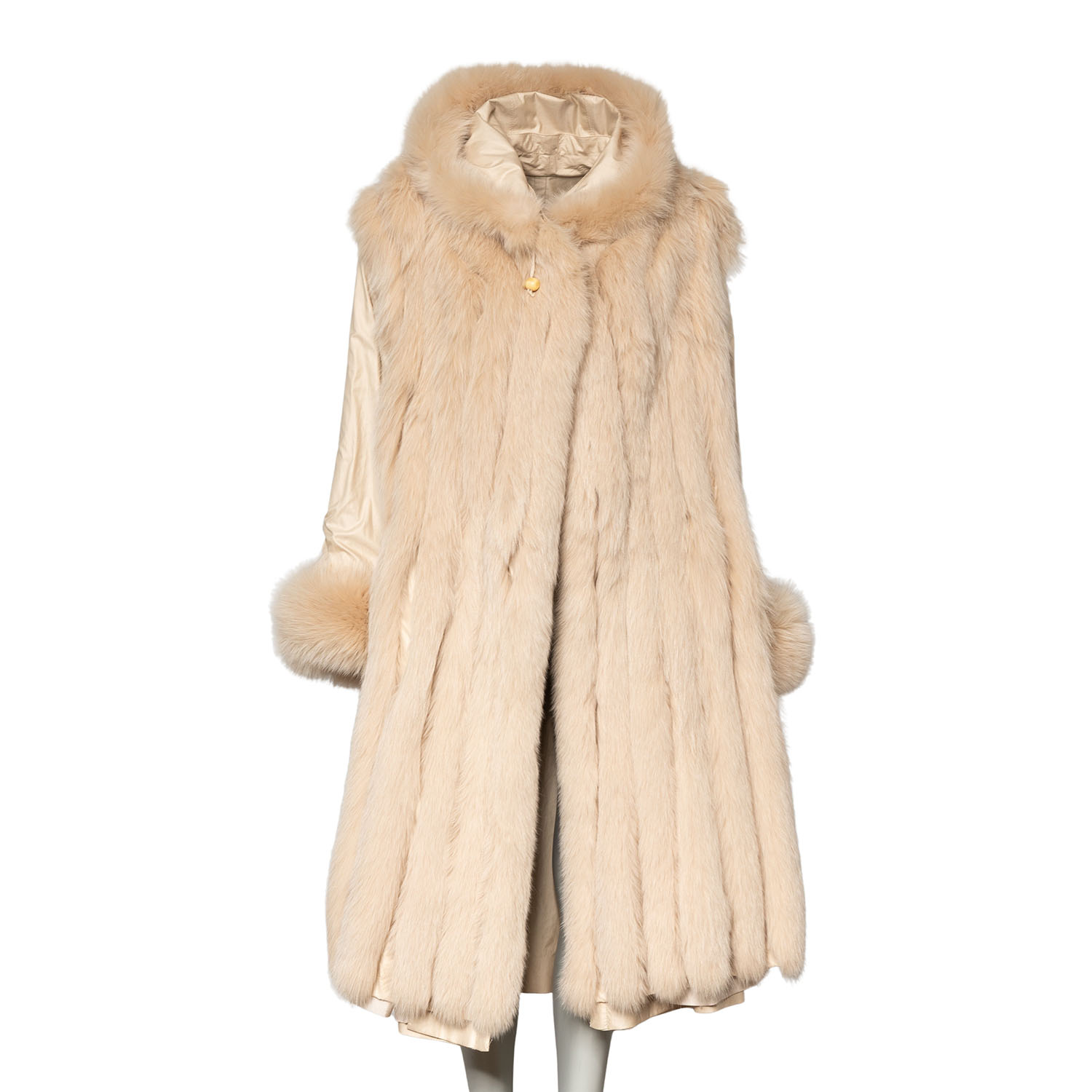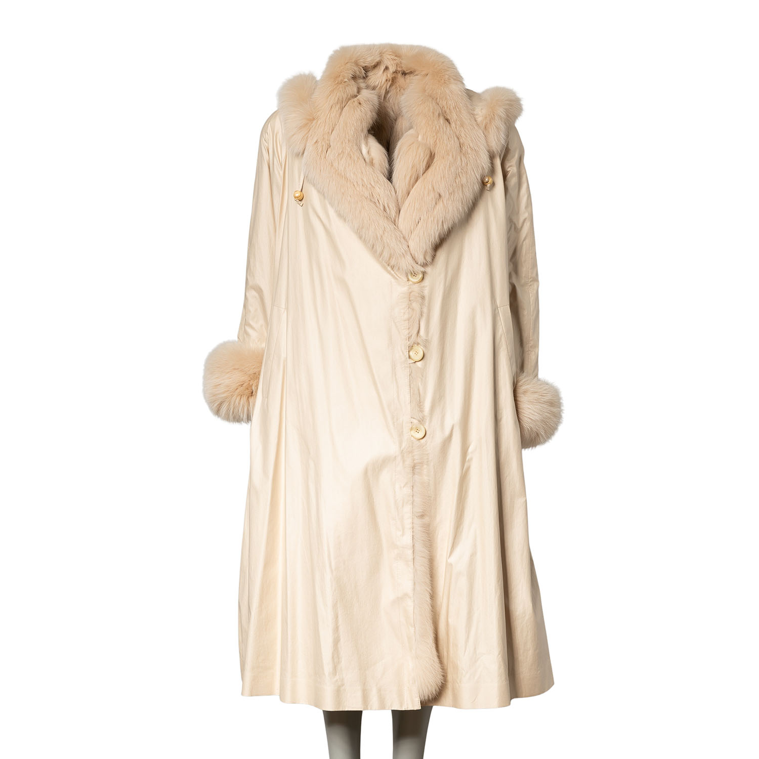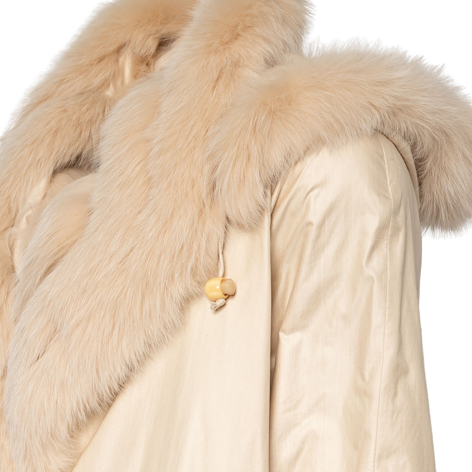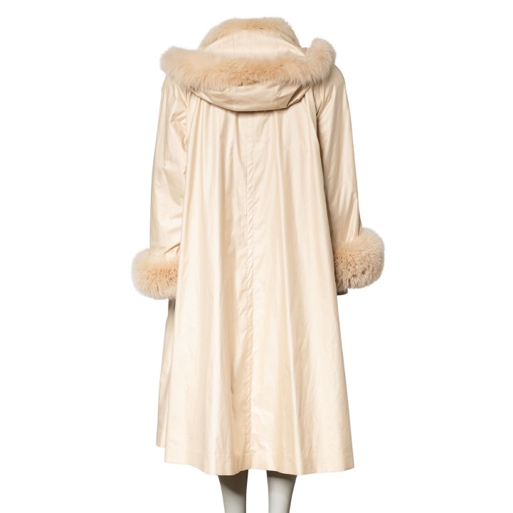 Wildseide in Cremefarben mit Kapuze, Knopfverschluss und Eingrifftaschen. Mit Fuchs gefüttert. Neuwertig.