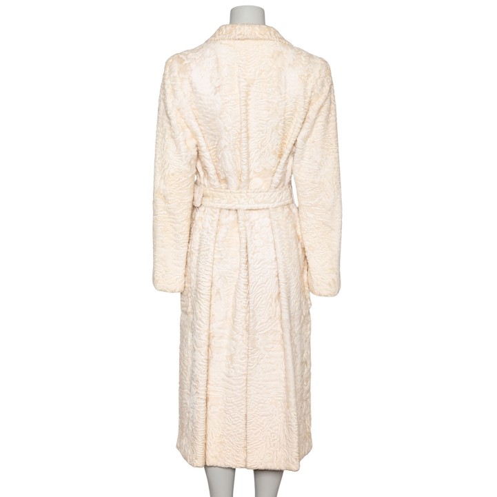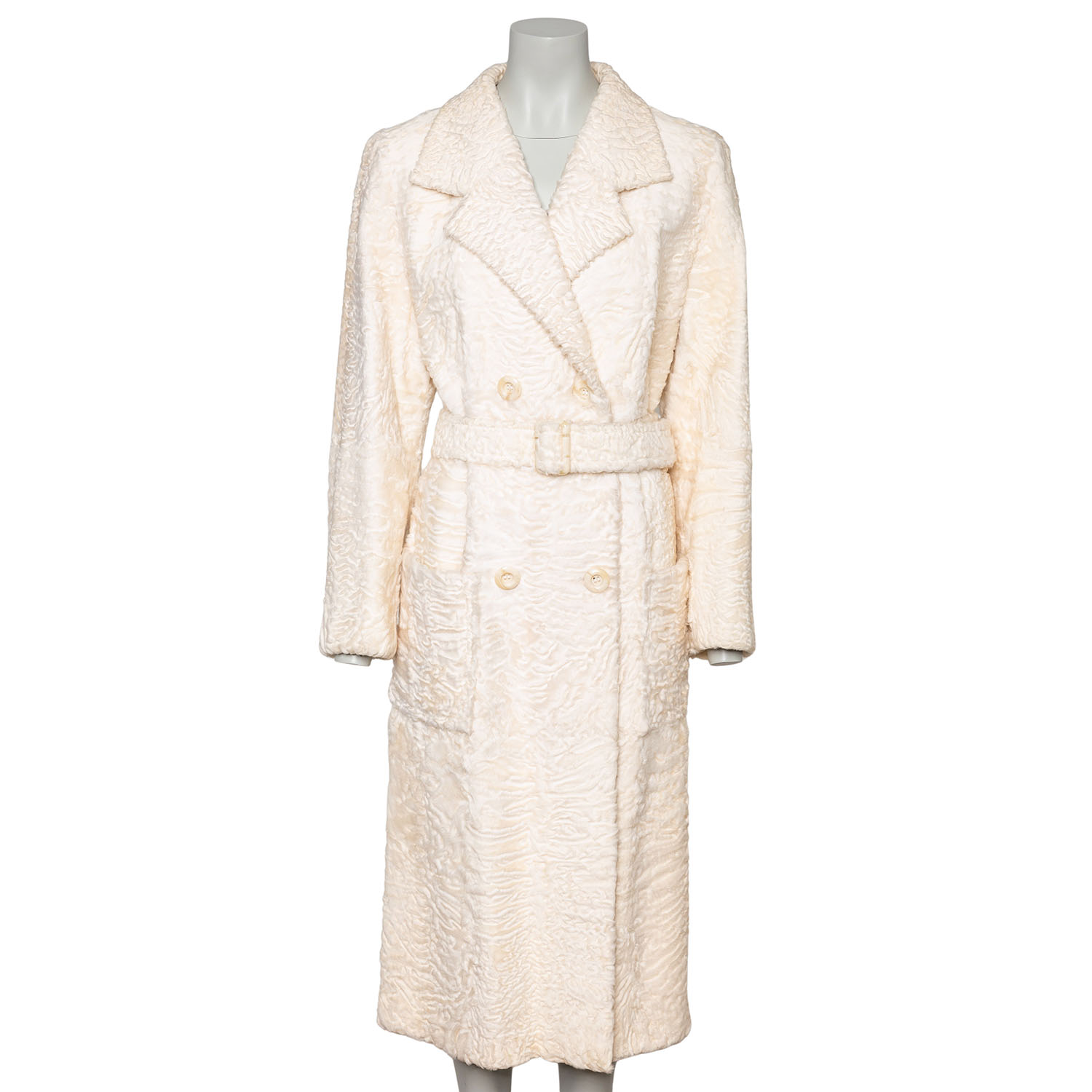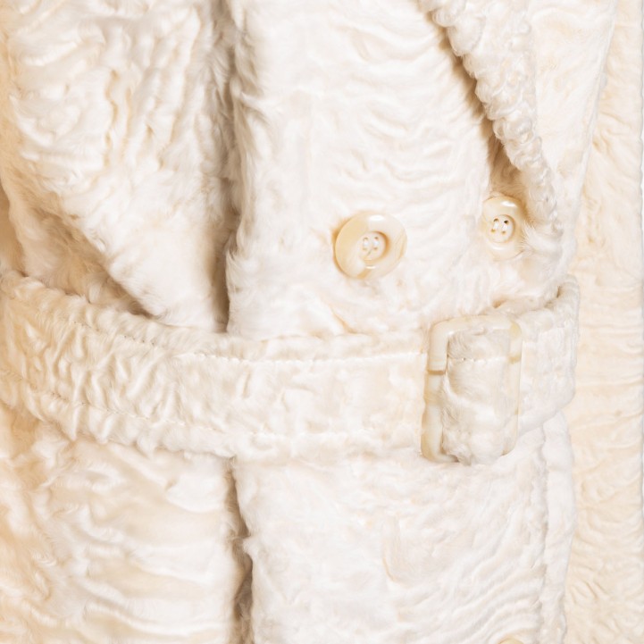 Hochwertige Felle in Weiß mit breitem Reverskragen, Zweireiher und zwei aufgesetzten Taschen. Sehr guter Erhalt.