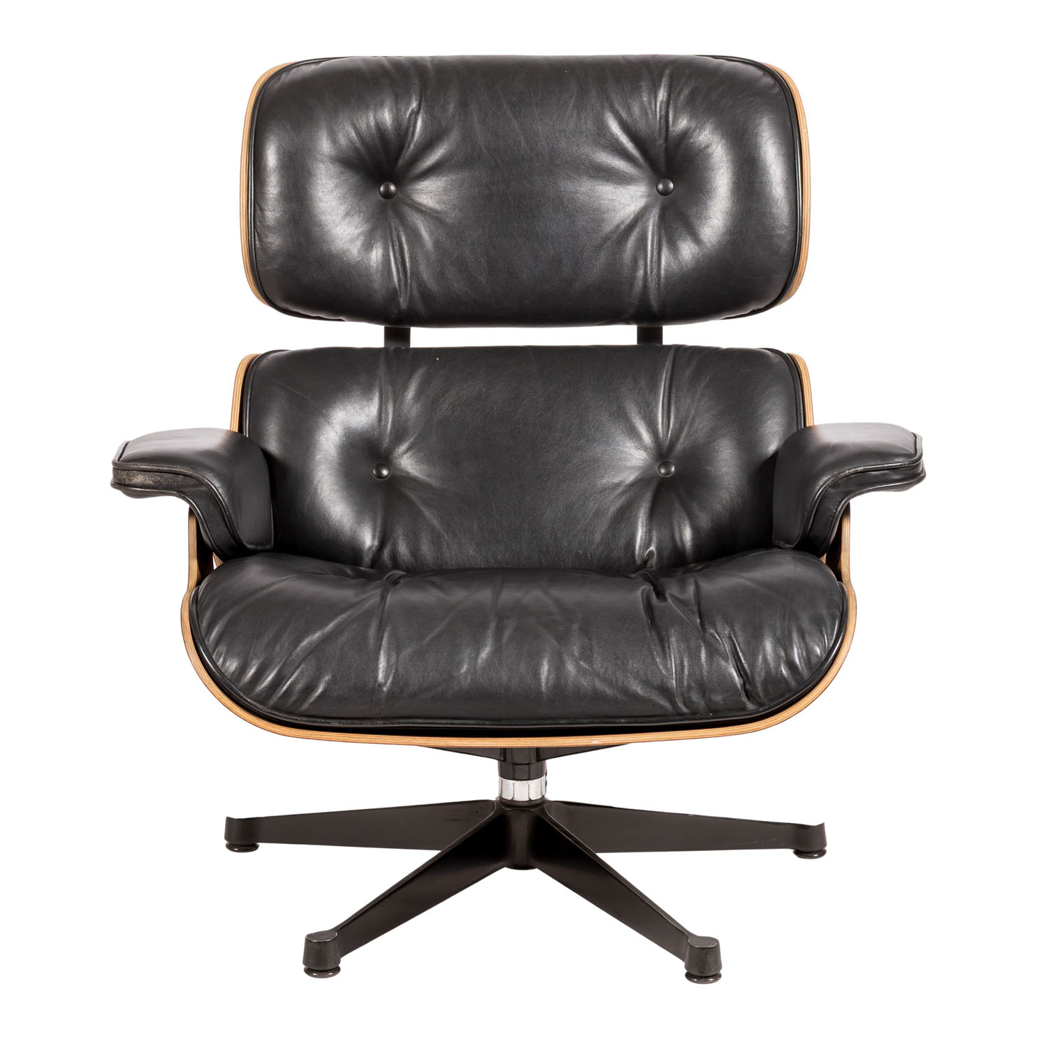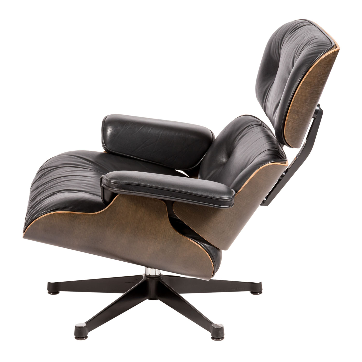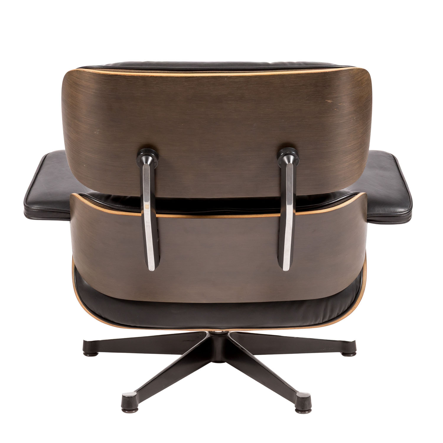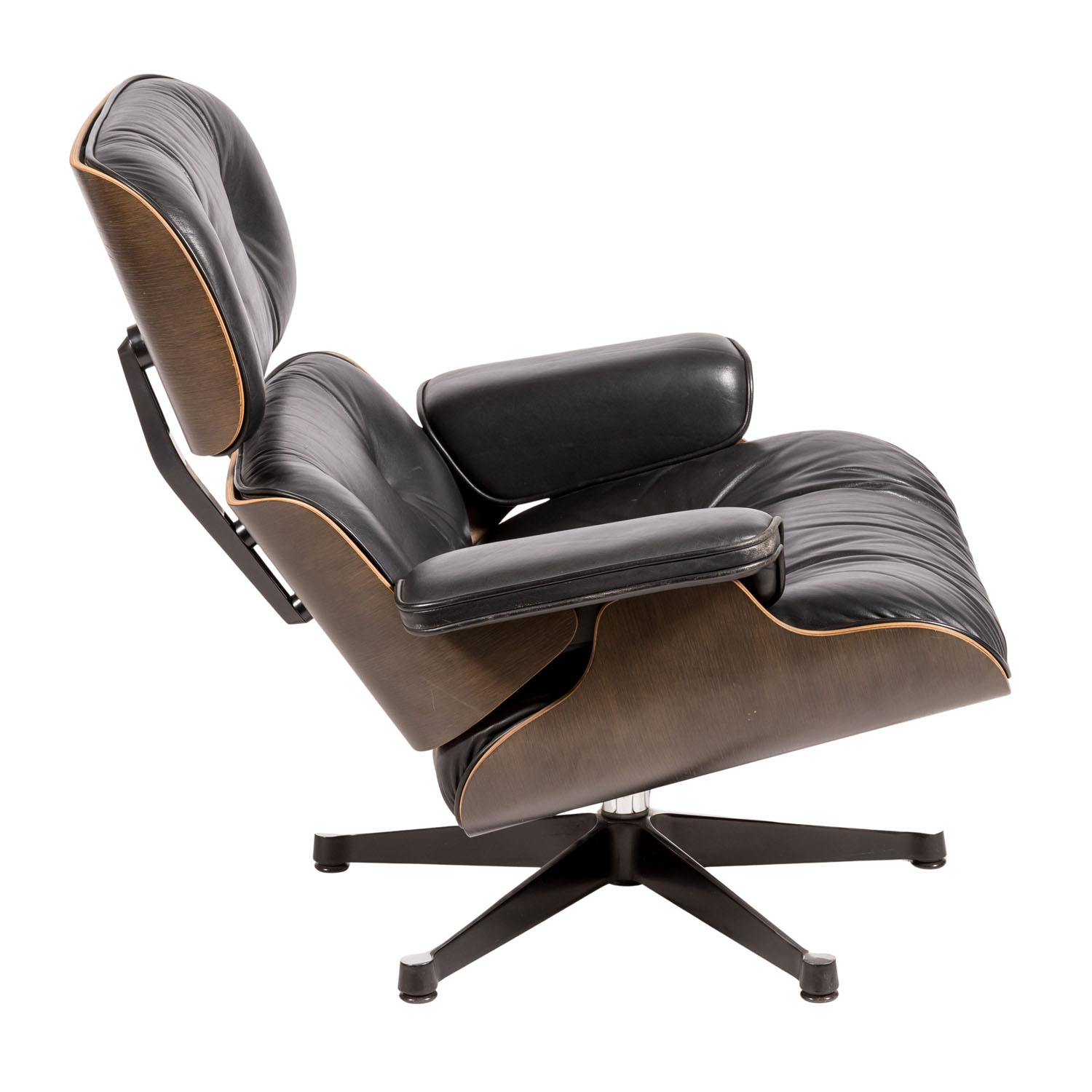 Entwurf: 1957, Ausführung: Vitra AG, Hermann Miller Collection, Ende der 1970er Jahre, geformtes Schichtholz mit gedunkeltem Eschenfurnier, Aluminiumgussfuß, Polsterung mit schwarzem Lederbezug, H: 82 cm. Polsterung part. erg., part. Alters- und Gebrauchsspuren.