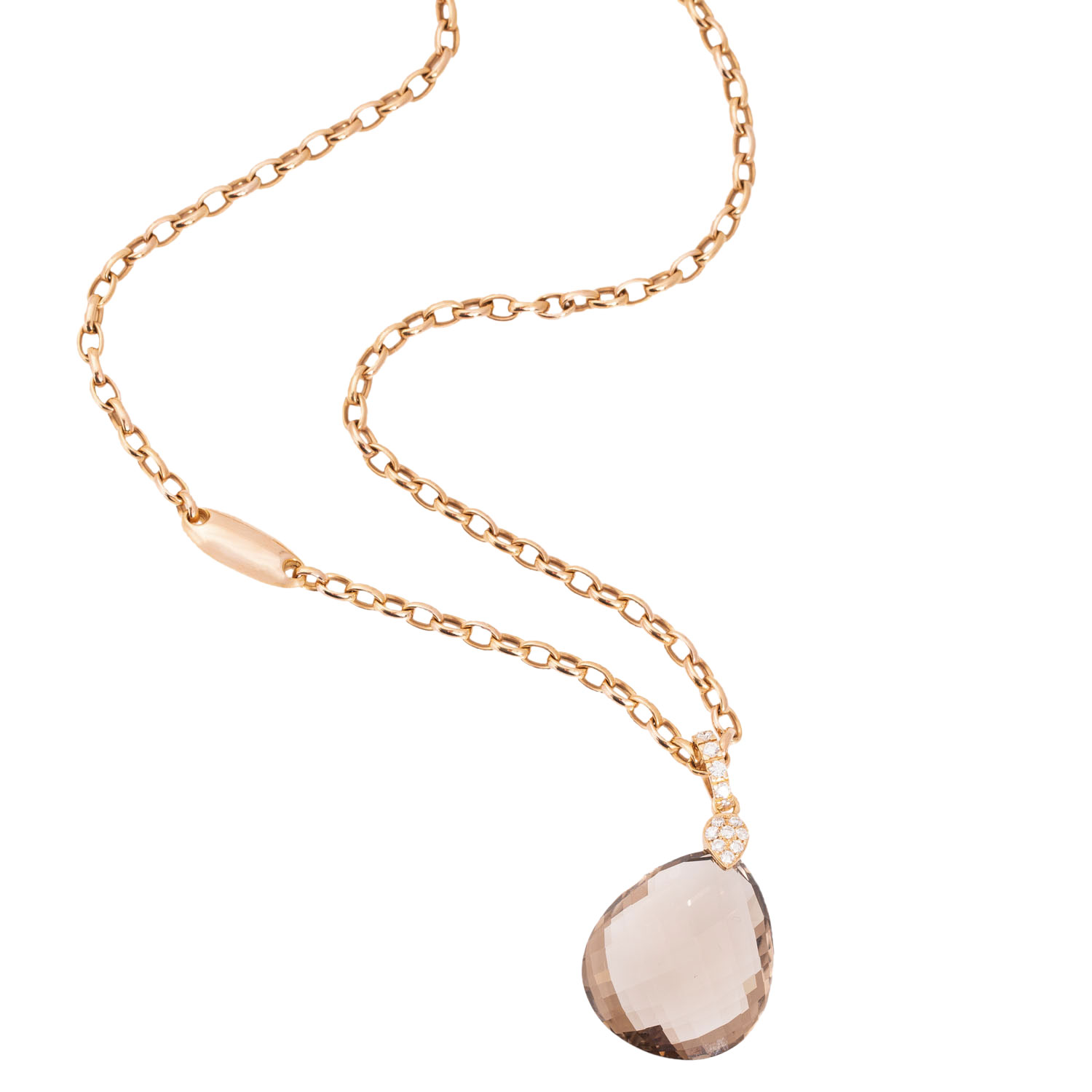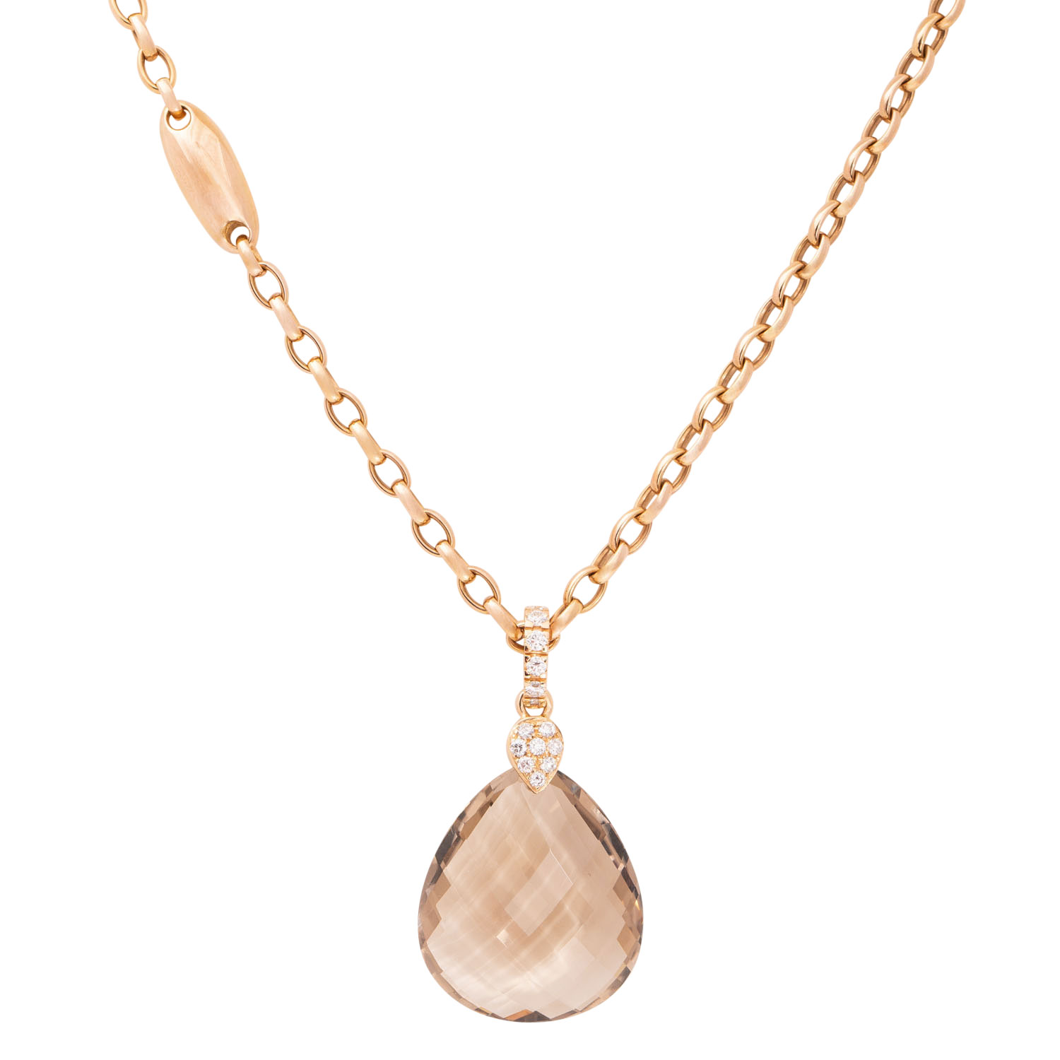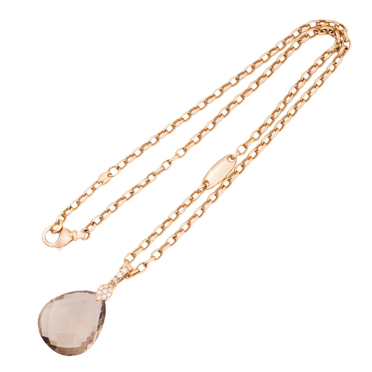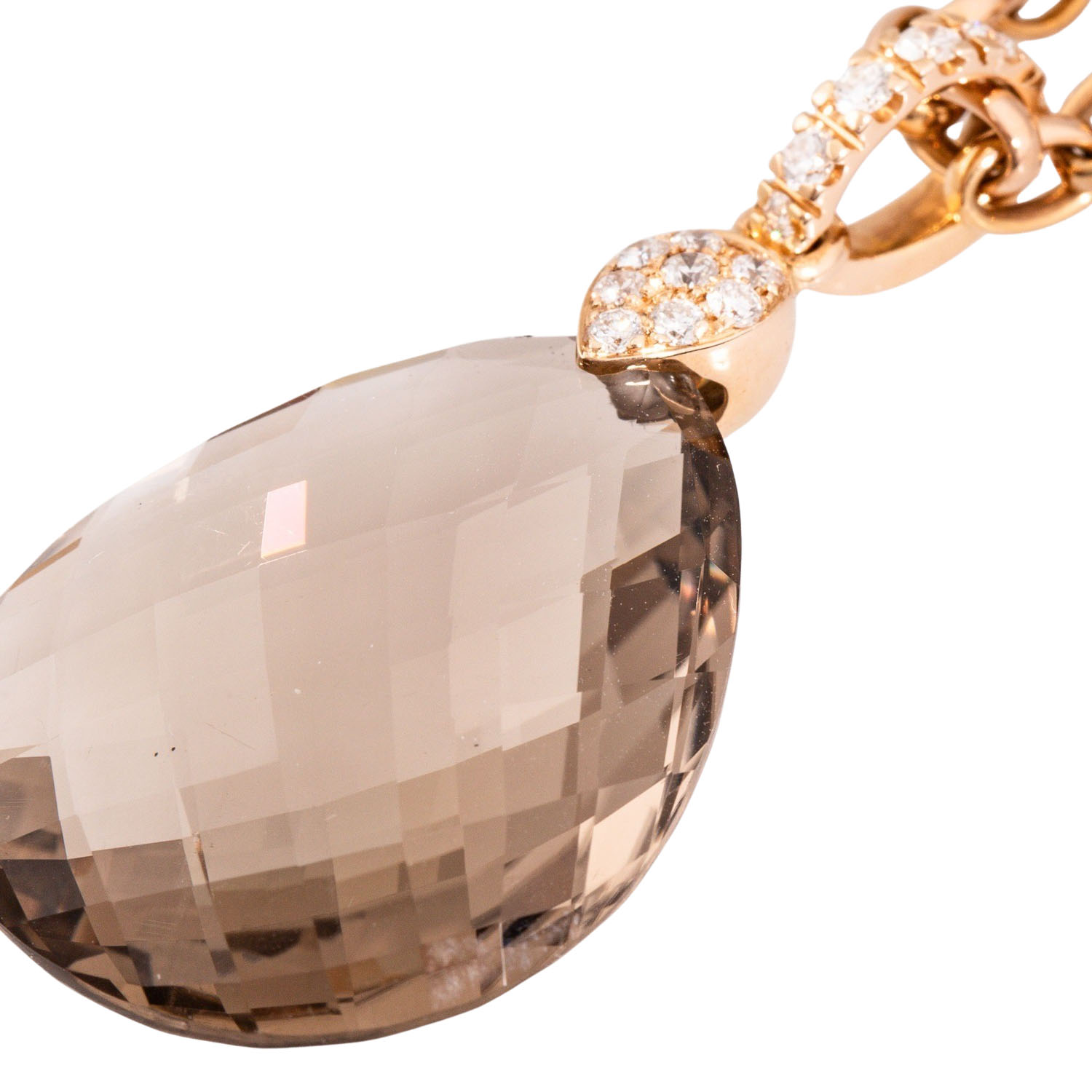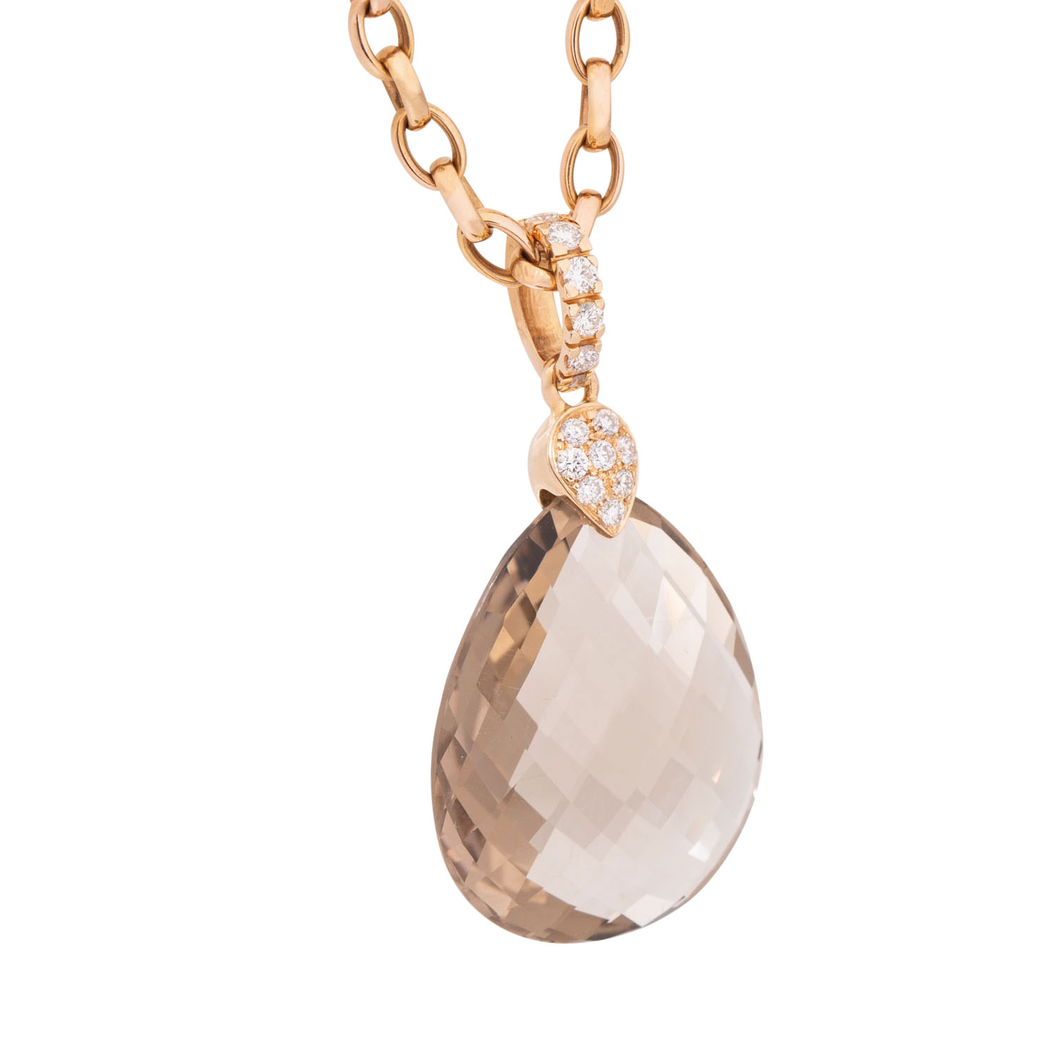 zus. ca. 0,28 ct, ca. FW (G)/VVS, KP (2007) mit Kette: 4.440 €, fac. Rauchquarzbriolet ca. 27,47 ct, Steingewichte punziert, RG 18K, 30,6 g, L: 50 cm, Anhänger L: 4 cm, 21. Jh., guter Erhalt, mit 2 Von Hofen Zertifikaten.