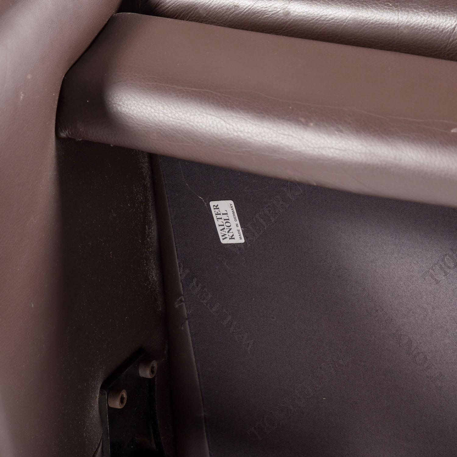 dunkelbraunes Leder, die Polster je mit geprägter Bezeichnung 'WALTER KNOLL', furnierte Holzfüße, HxBxT: Sessel ca. 100x84x70 cm. Alters- und Gebrauchsspuren.