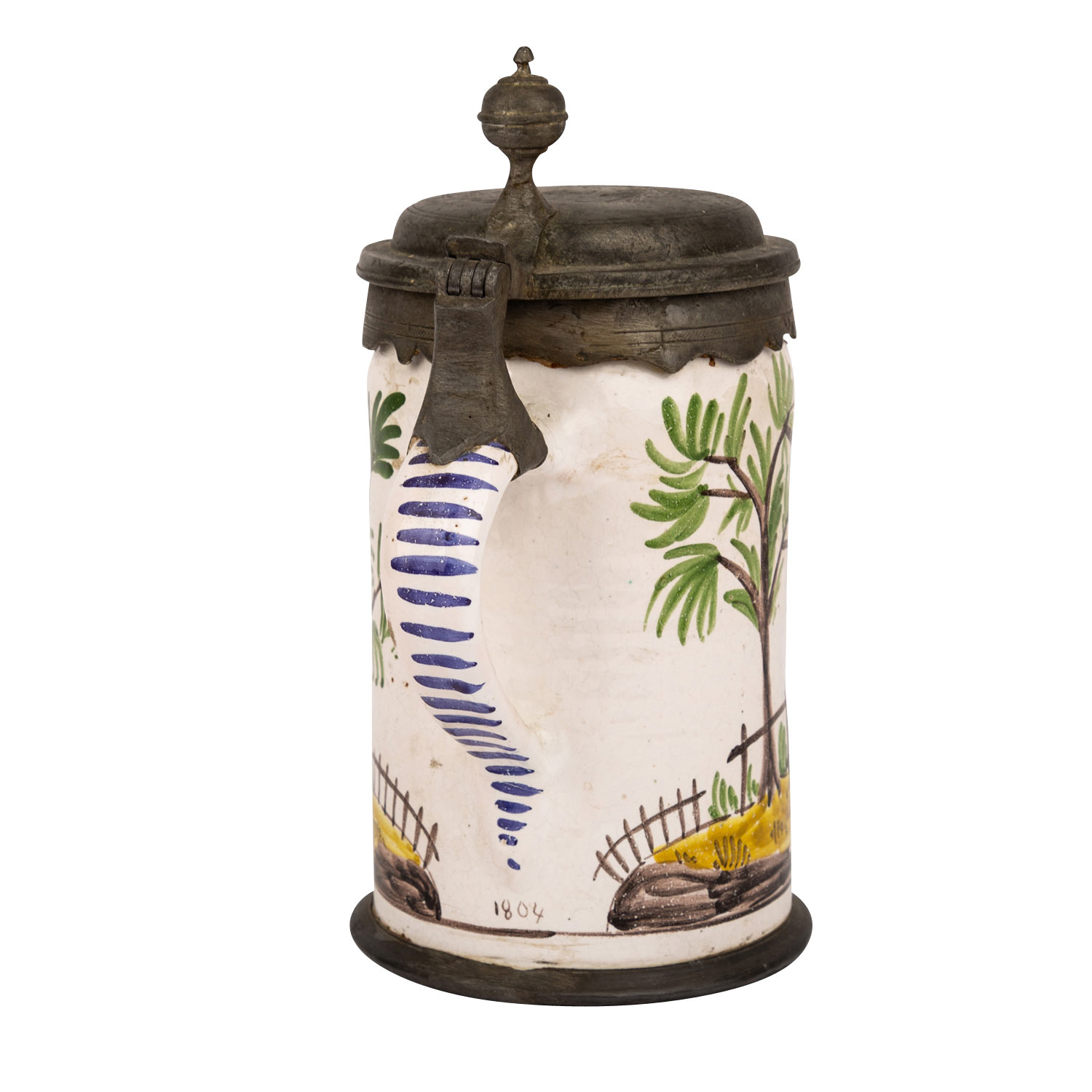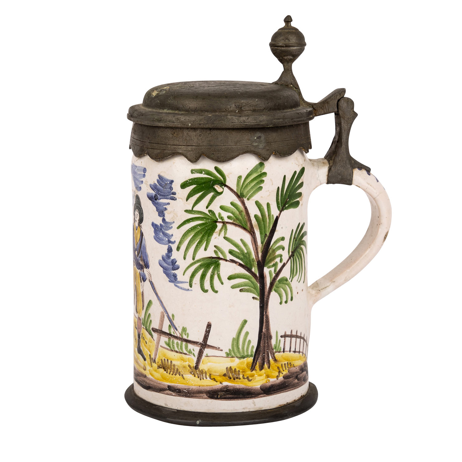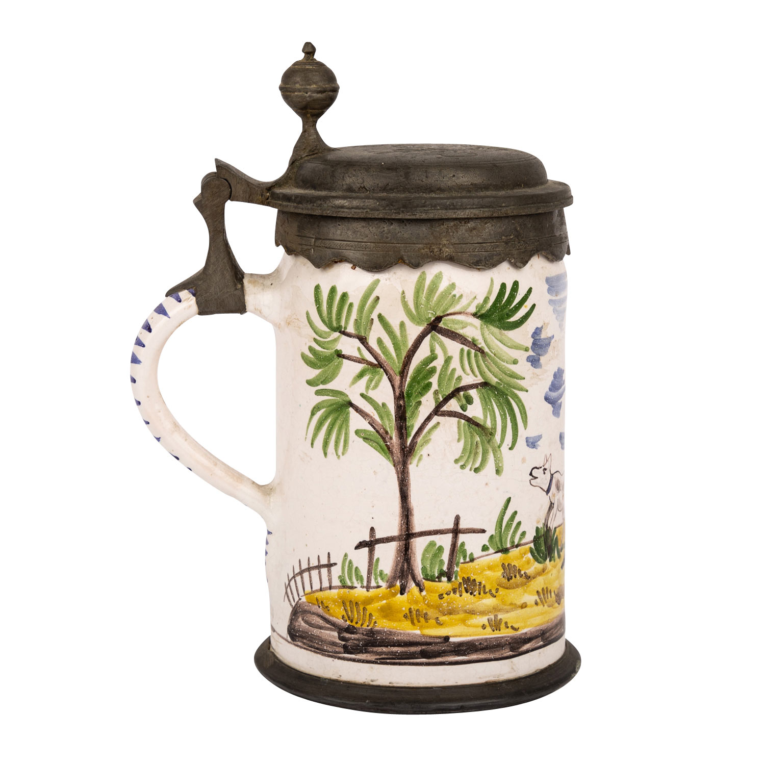 Cylindric jug, prob. 19th century, circumferential landscape painting with hunter and dog, under the tapered handle end ins. ""1804"", tin mounting on lid and stand, figurative lid embossing with barrel, foliage and date ""C 1803 H"", bottom inscription ""Creilsheim"", milky glaze with inclusions, min. dam, signs of age and wear, h 20 cm.
