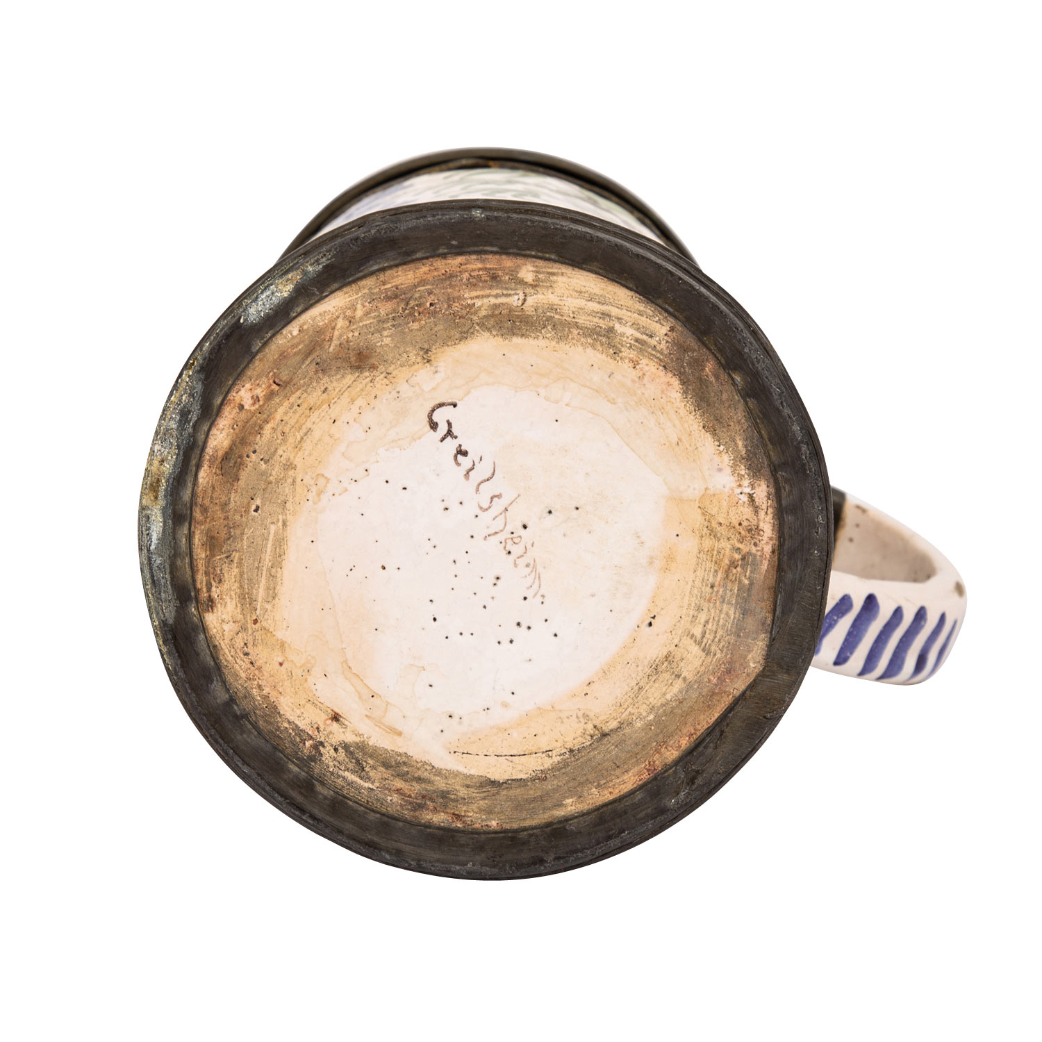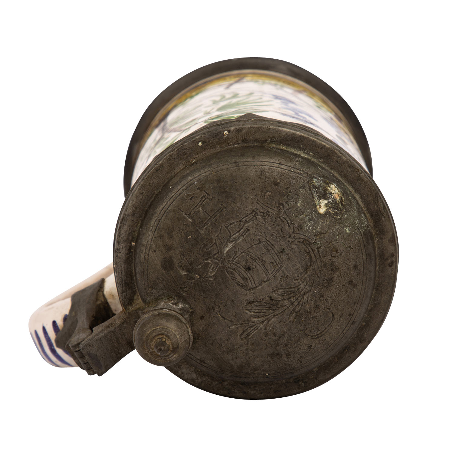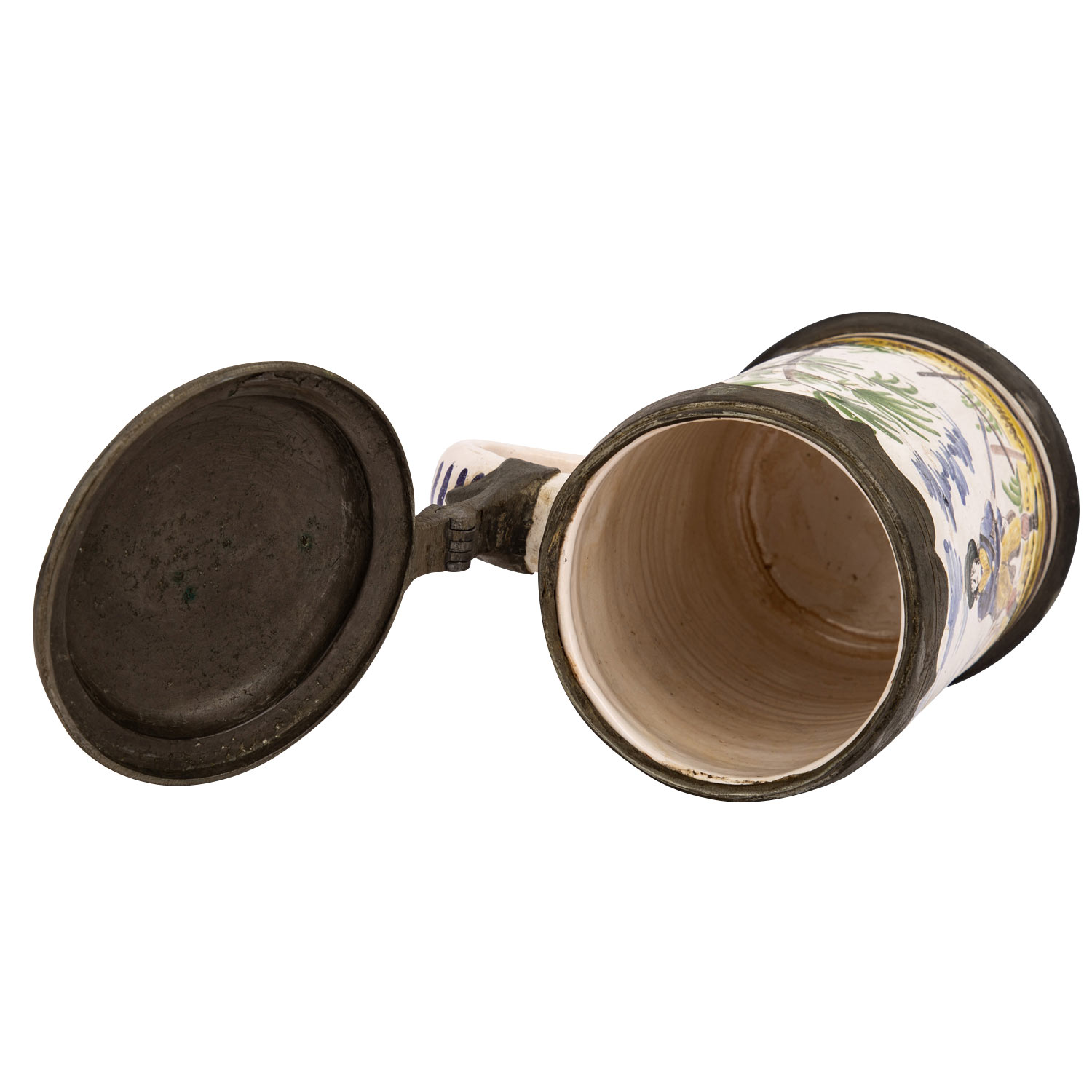 Cylindric jug, prob. 19th century, circumferential landscape painting with hunter and dog, under the tapered handle end ins. ""1804"", tin mounting on lid and stand, figurative lid embossing with barrel, foliage and date ""C 1803 H"", bottom inscription ""Creilsheim"", milky glaze with inclusions, min. dam, signs of age and wear, h 20 cm.