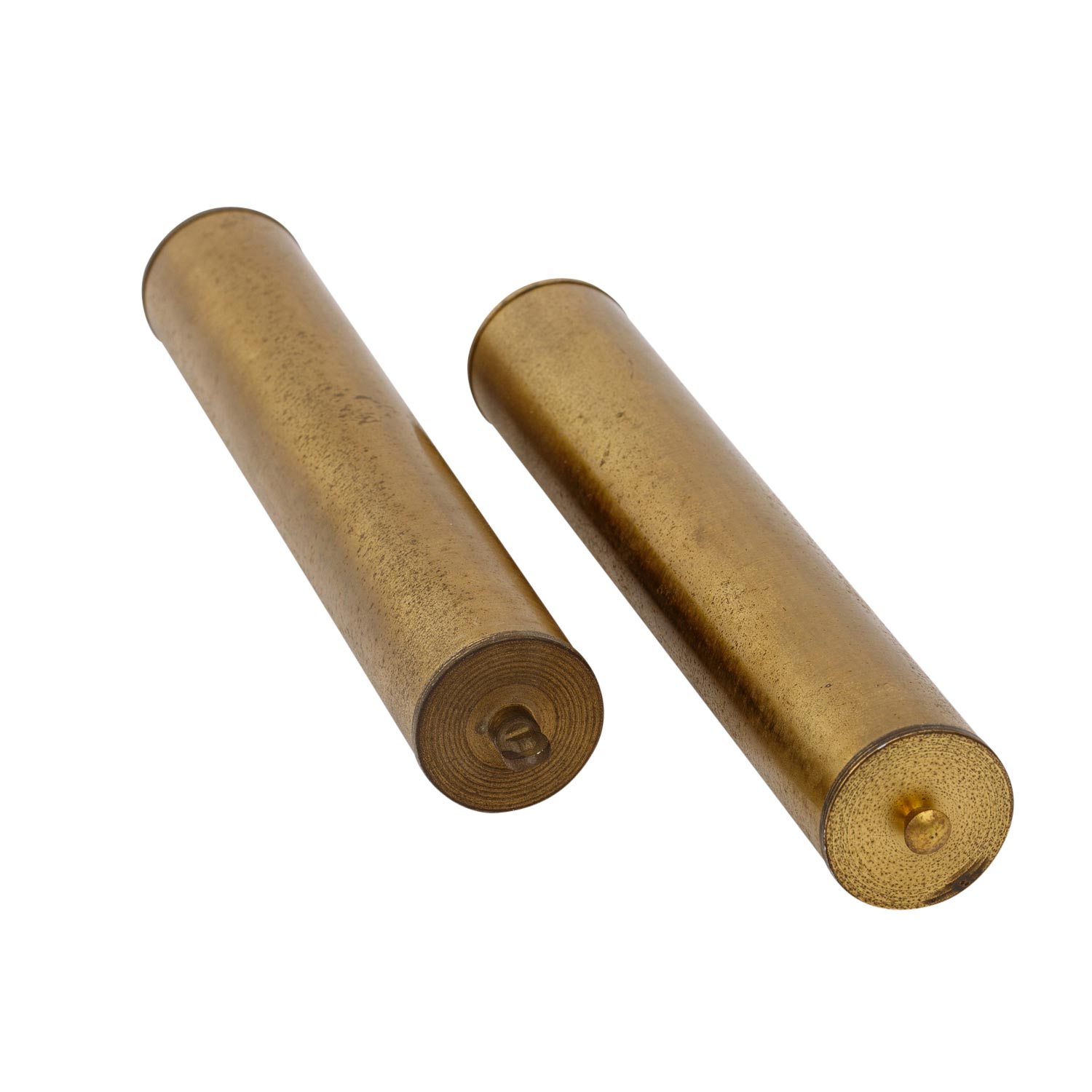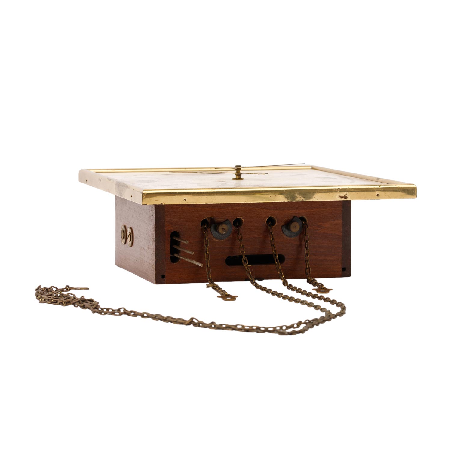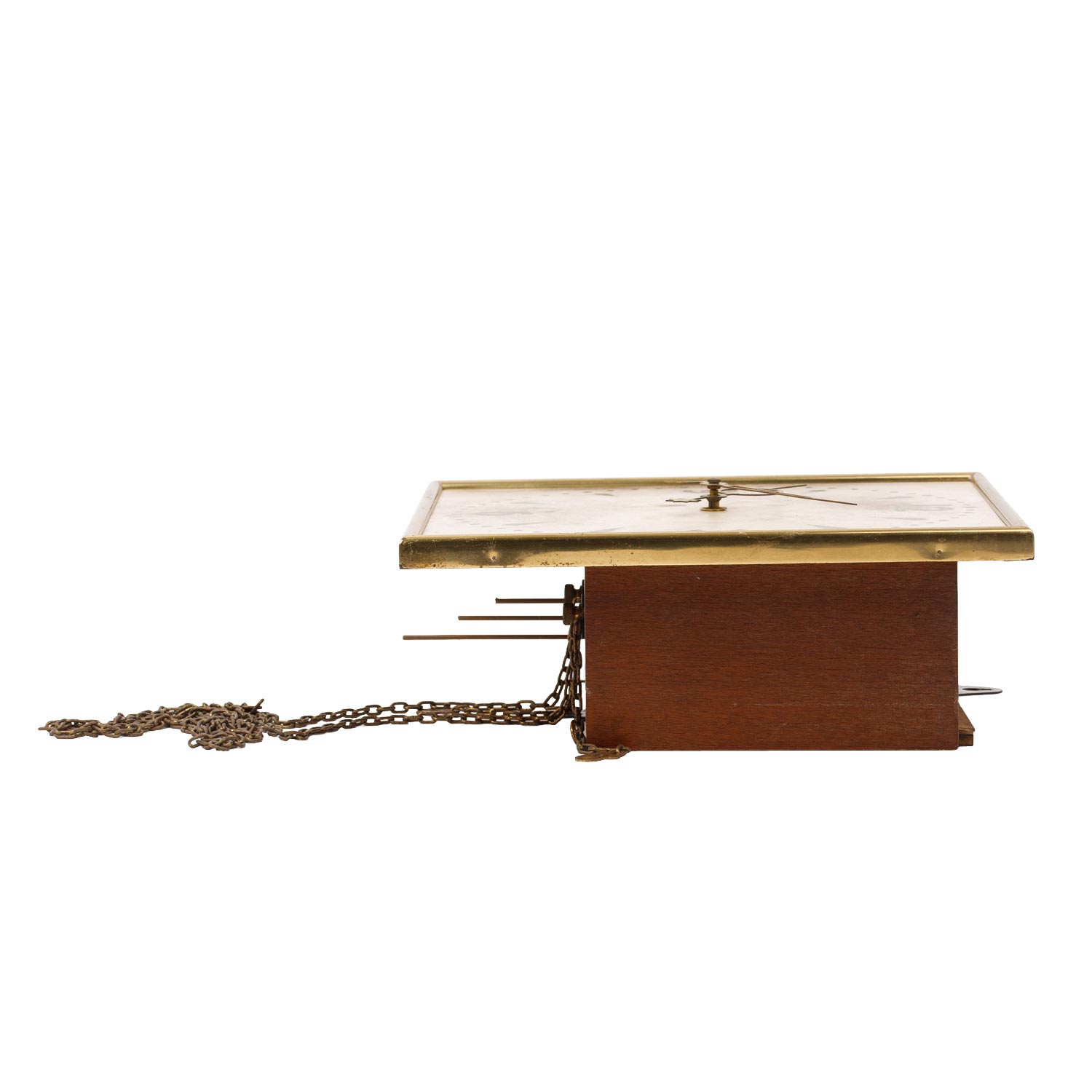 60er/70er Jahre, vanillegelb lackiertes Zifferblatt, schwarze Ziffern, Messingrahmen, Uhrgehäuse aus Holz, Schlagwerk auf Tonfeder, Pendel und Gewichte Messing, HxBxT: 27/27/10 cm. Normale Alters-und Gebrauchsspuren.