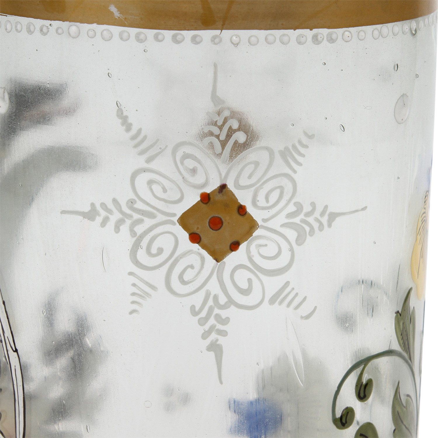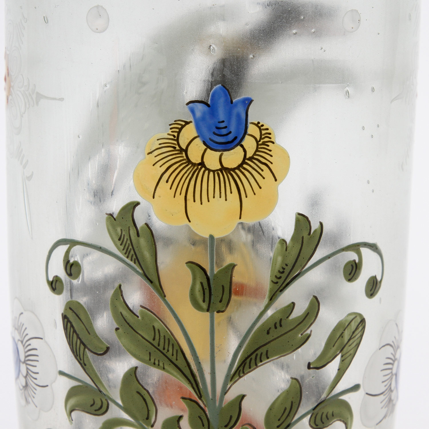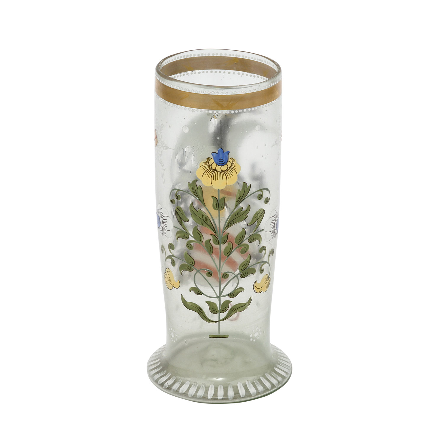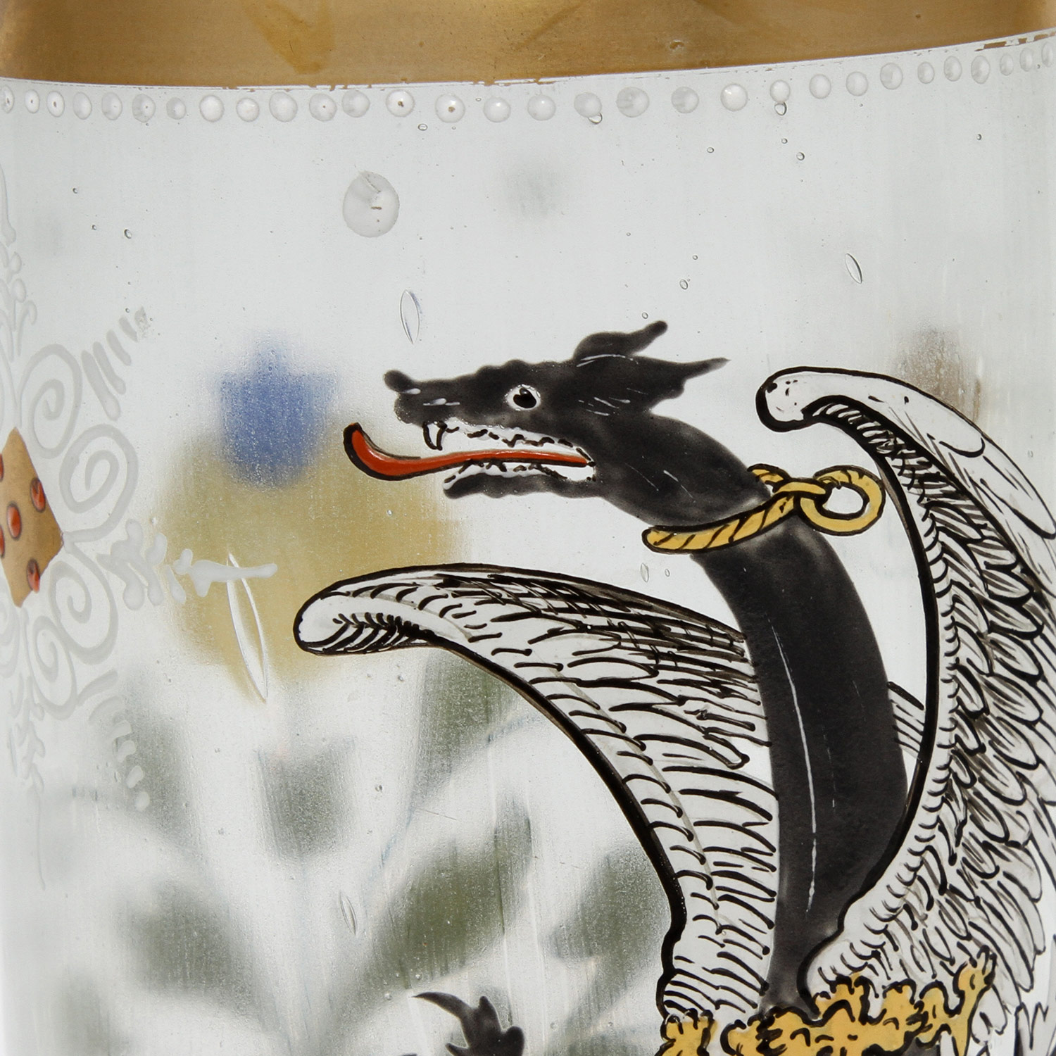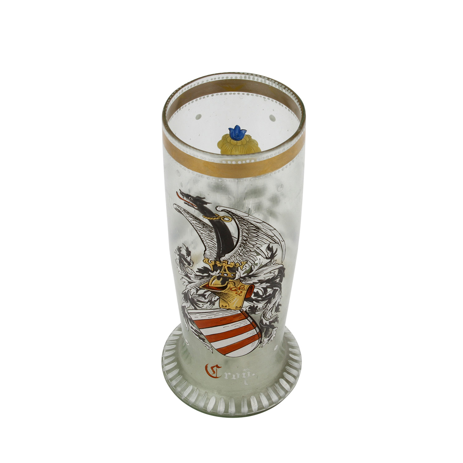 WAPPEN-BECHER Ende 19.Jh.,farbloses Glas mit farbiger Emailbemalung, gold staffiert, H: 22,5 cm. Min. Altersspuren.