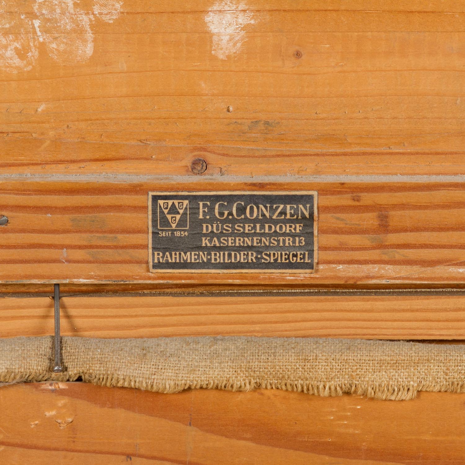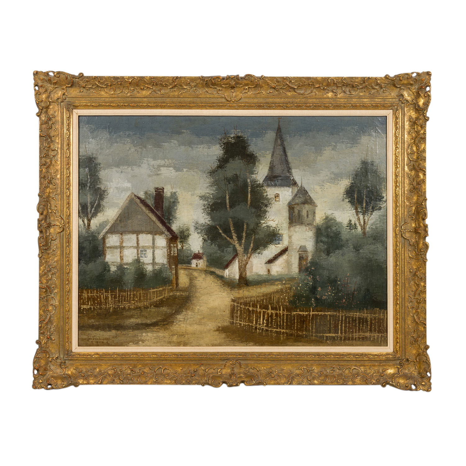 ""Steinbrücken"", place with church near Münster / Westphalen, signed and dated 1941, inscribed on the back of the canvas, oil / canvas, HxW: ca.75x100 cm (100x125 cm with frame). Craquelé, part. paint flafing and abrasion. With frame (edges slightly damaged). VERSO label E. Conzen, Düsseldorf.