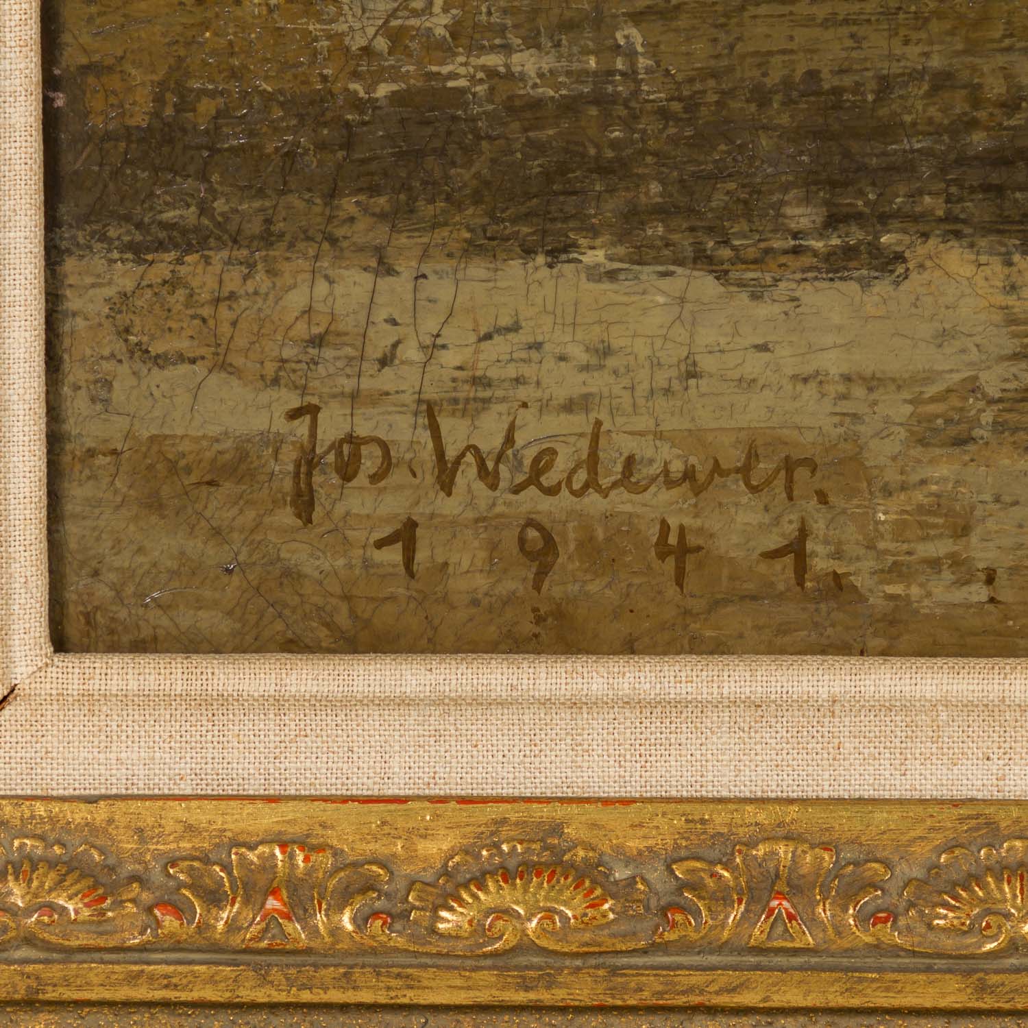 WEDEWER, JOSEF (1896-1979), ""Steinbrücken"", Ort mit Kirche bei Münster/Westphalen, u.li. signiert und datiert 1941, auf der Lw.rückseite bezeichnet, Öl/Leinwand, HxB: ca. 75x100 cm (100x125 cm mit Rahmen). Craquelé, part. Farbabplatzer/-berieb. Mit Rahmen (Kanten leicht beschädigt). VERSO Etikett E. Conzen, Düsseldorf.