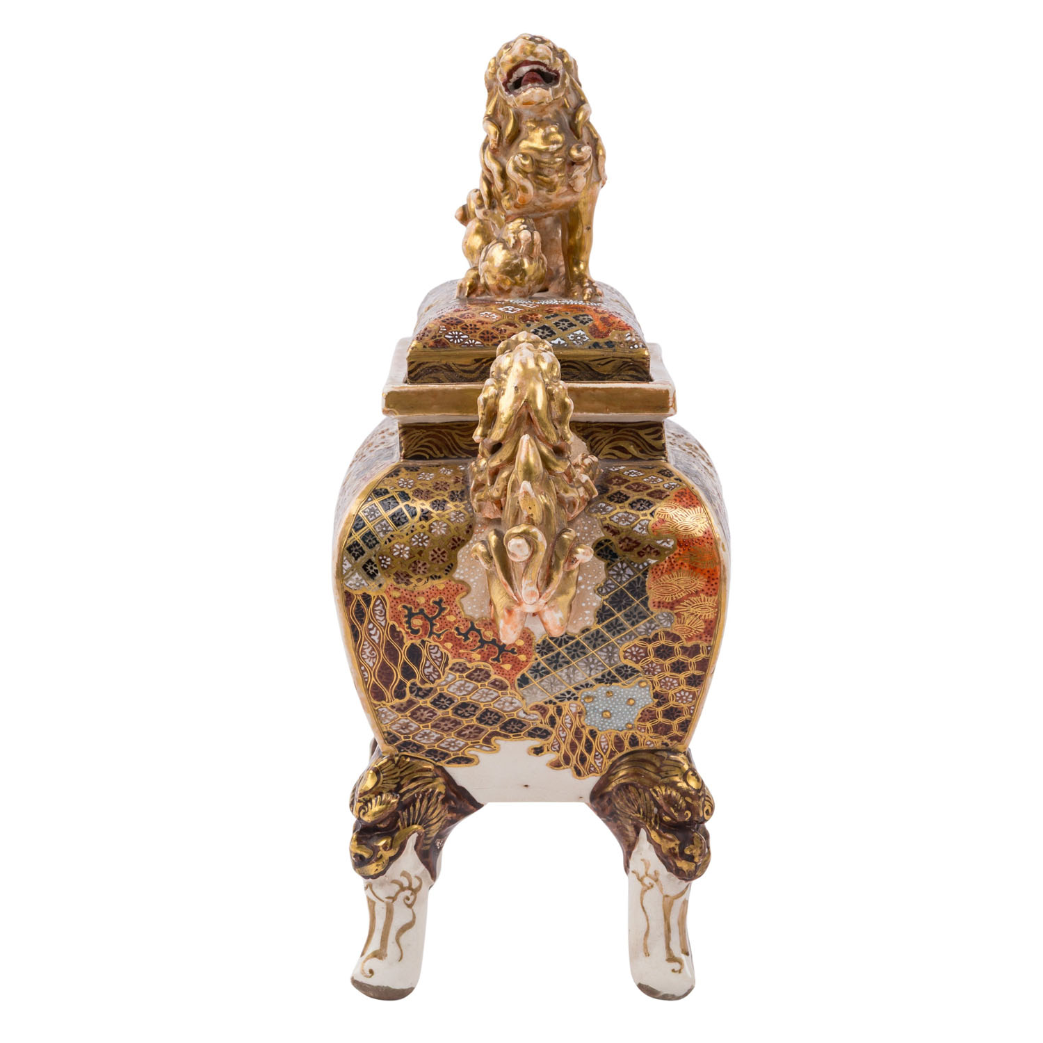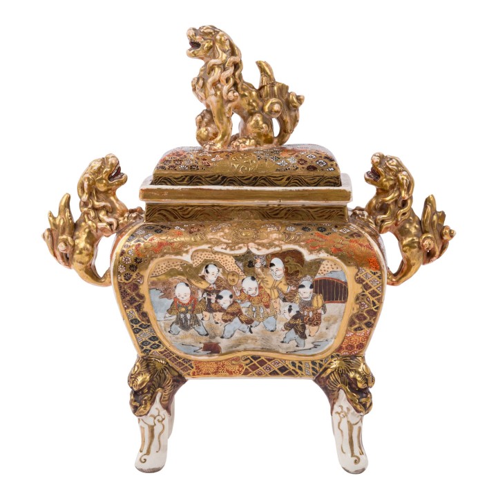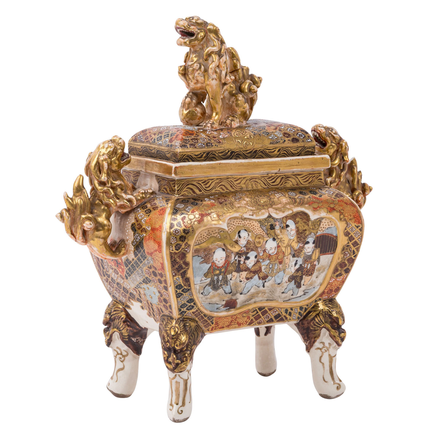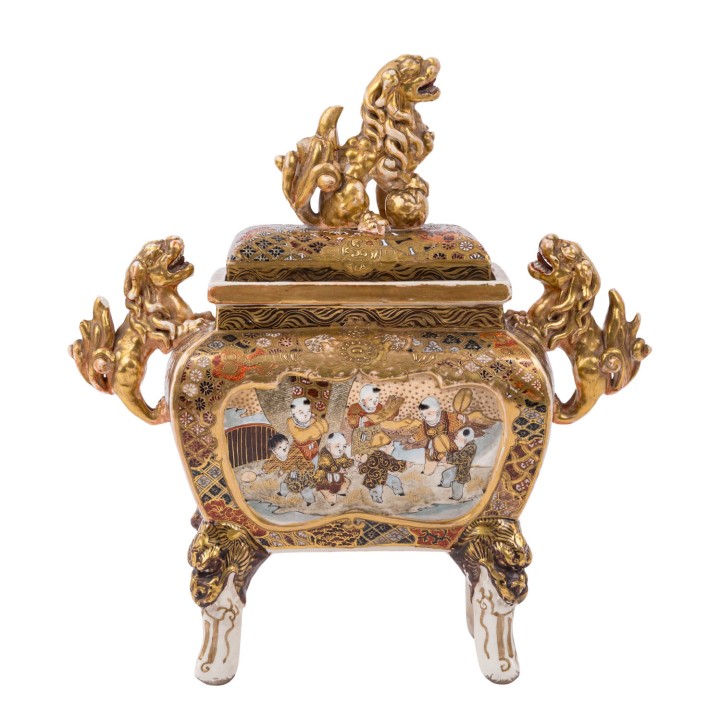 Der rechteckige Korpus steht erhöht auf vier Beinen, die jeweils in Löwenkopfform gearbeitet sind. Seitlich befinden sich zwei vollplastisch ausgearbeitet Wächterlöwen als Handhaben. Ebenso ist der Deckel (beschädigt und geklebt) mit einer Handhabe in Form eines Wächterlöwen gearbeitet. Die Vorder- und die Rückseite zeigen Kartuschen, die mit spielenden Kindern bemalt sind. In den Farben der Satsuma-Palette fein bemalt und mit reichlich Gold verziert. Alters- und Gebrauchsspuren, stark berieben, und besch. H 32 cm.