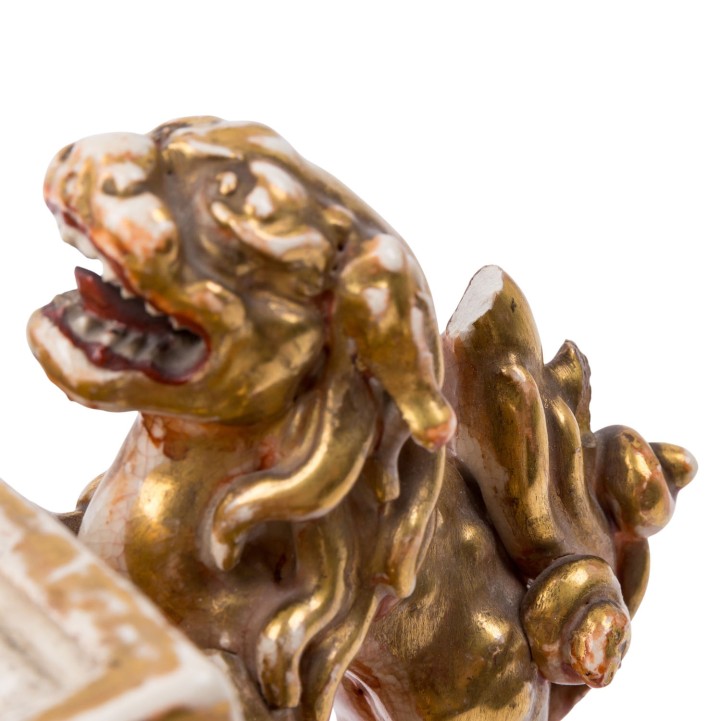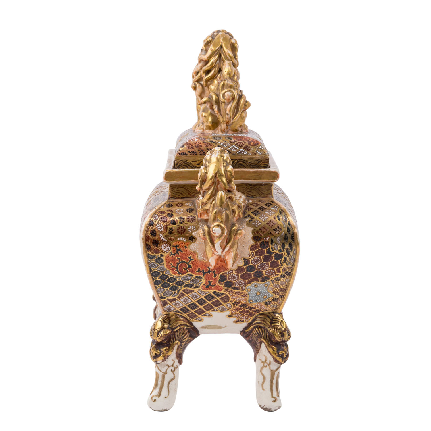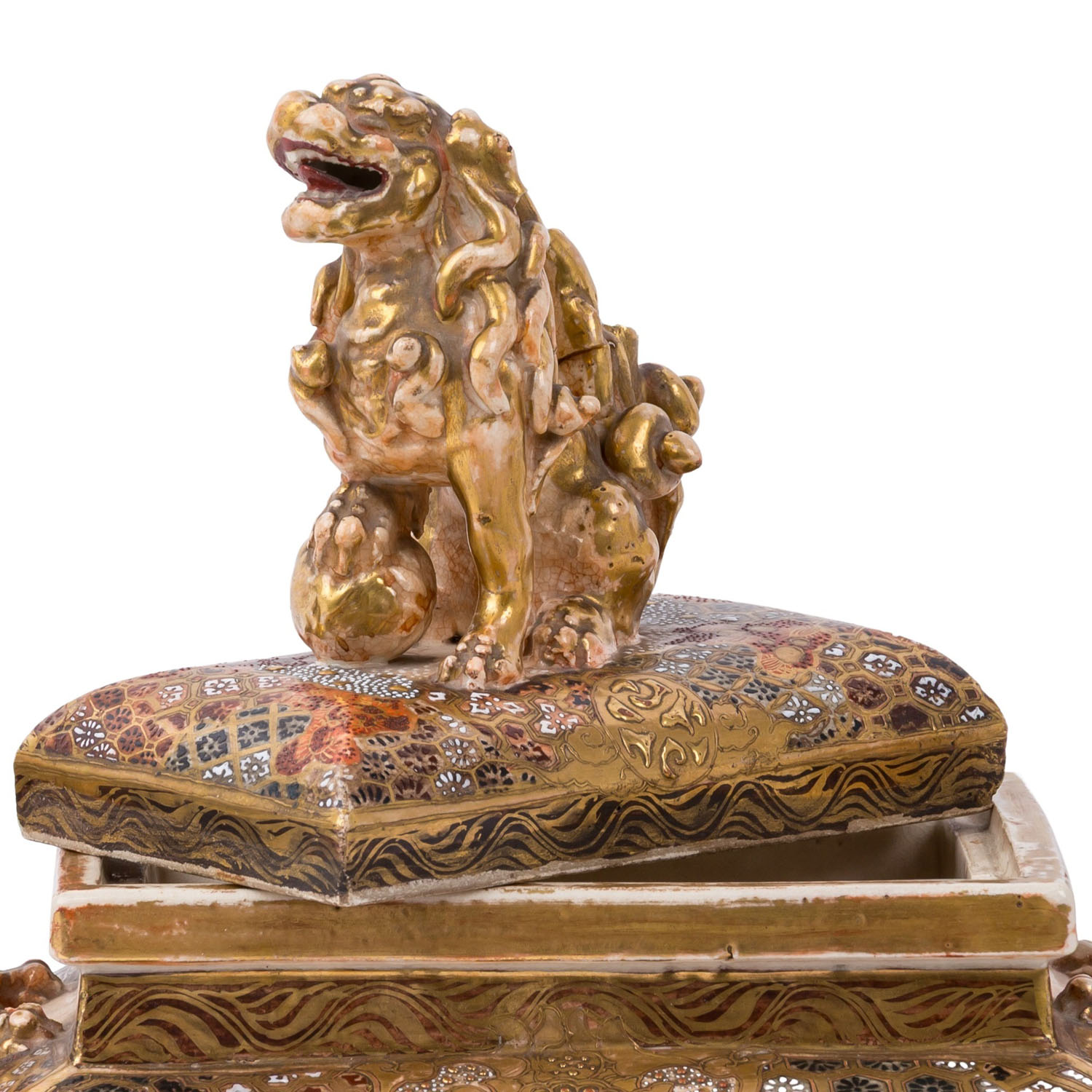 Der rechteckige Korpus steht erhöht auf vier Beinen, die jeweils in Löwenkopfform gearbeitet sind. Seitlich befinden sich zwei vollplastisch ausgearbeitet Wächterlöwen als Handhaben. Ebenso ist der Deckel (beschädigt und geklebt) mit einer Handhabe in Form eines Wächterlöwen gearbeitet. Die Vorder- und die Rückseite zeigen Kartuschen, die mit spielenden Kindern bemalt sind. In den Farben der Satsuma-Palette fein bemalt und mit reichlich Gold verziert. Alters- und Gebrauchsspuren, stark berieben, und besch. H 32 cm.