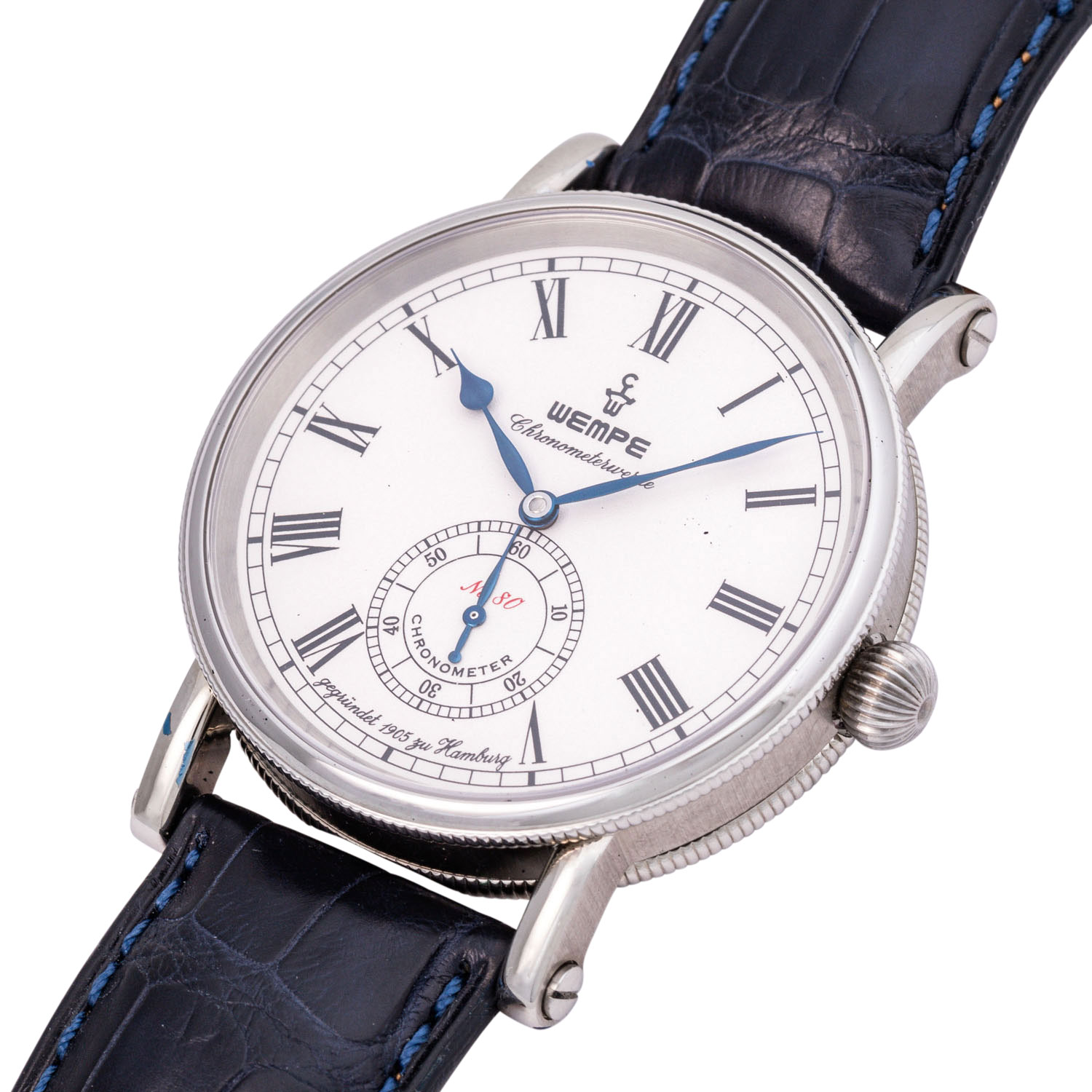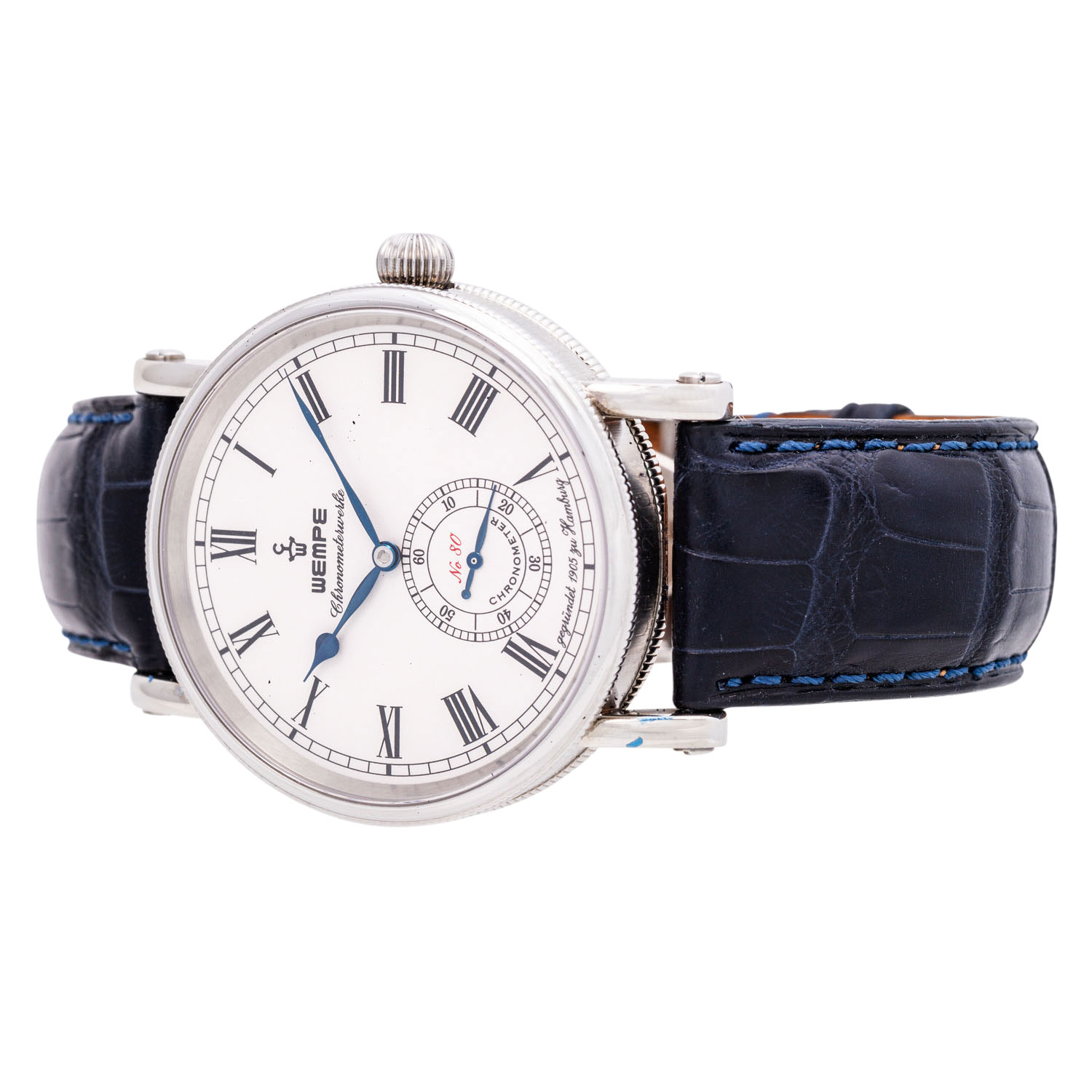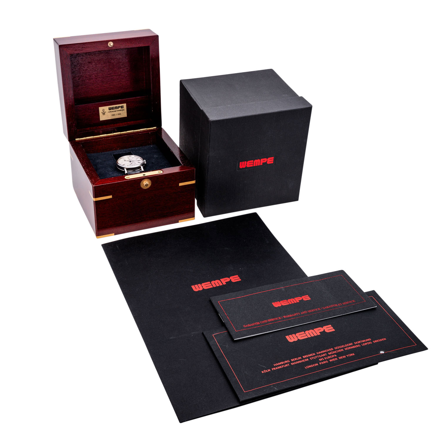 Limitiert auf 250 Stck. Edelstahl. Original Lederband mit Faltschließe. Automatikwerk, Kal. W080, Basis Enicar C.121, mit sehr guten Gangwerten. Protokoll anbei. Weißes zifferblatt, gebläute Stahlzeiger, kleine Sekunde und römische Ziffern. Guter Zustand, leichte Tragespuren am Gehäuse. Original Box und Zertifikat mit Kaufdatum vom Juli 1997 bei Wempe in Stuttgart anbei. Durchmesser ca. 38 mm ohne Krone. Passend bis zu ca. 19,5 cm Handgelenkumfang.