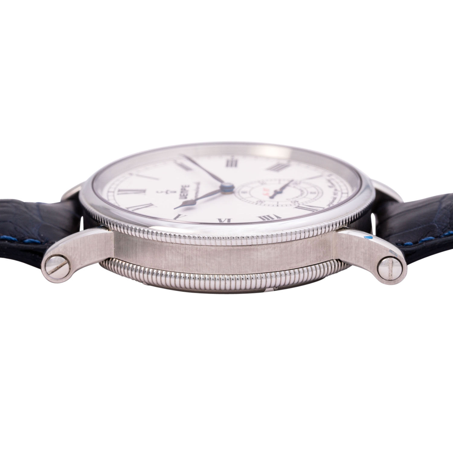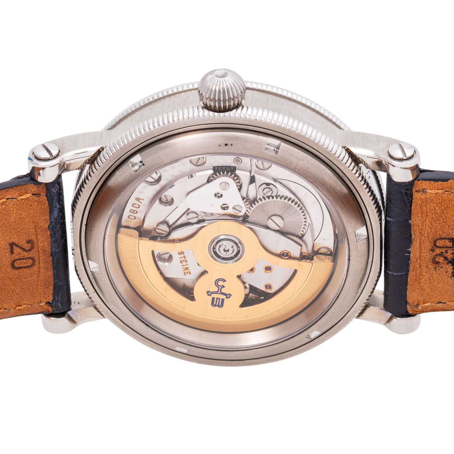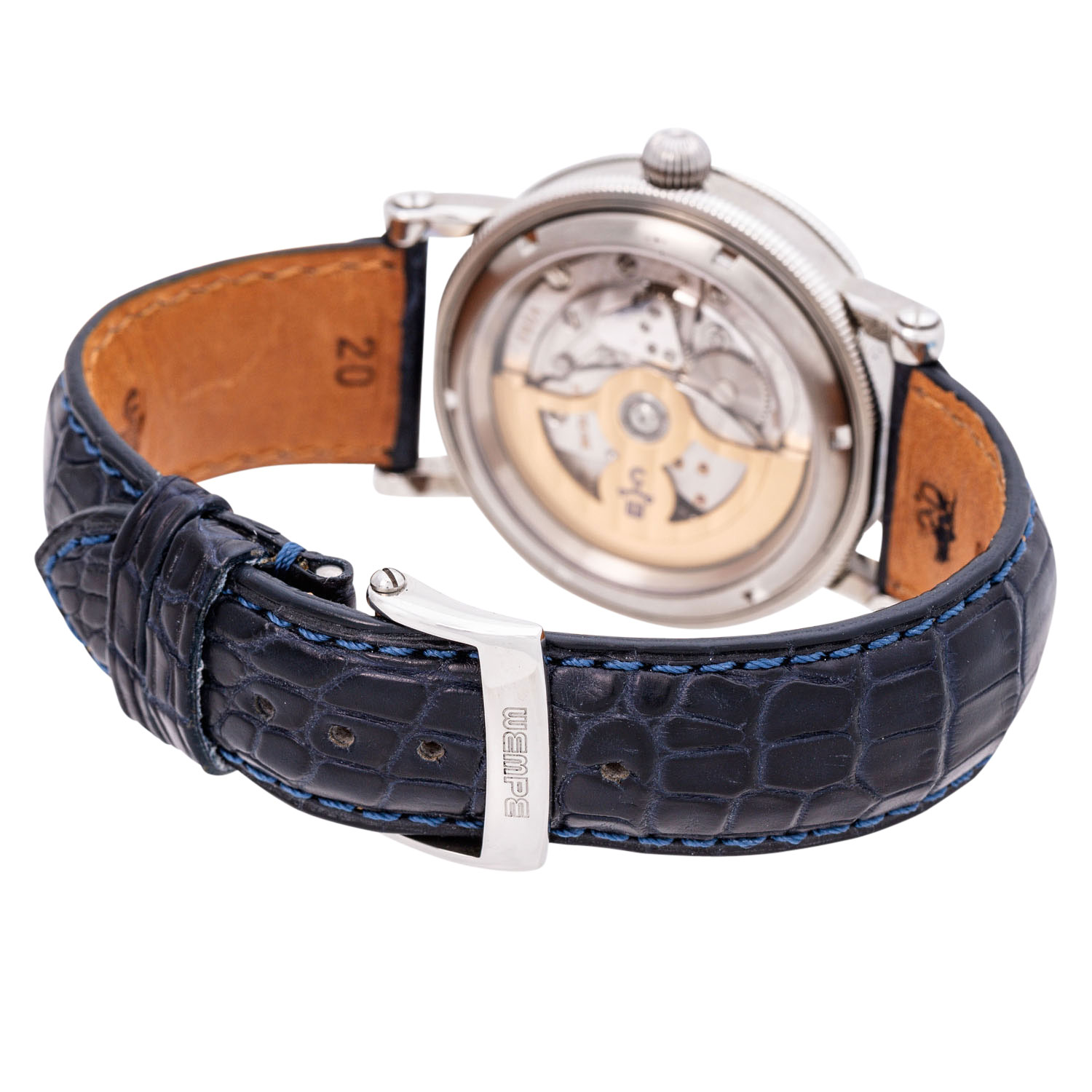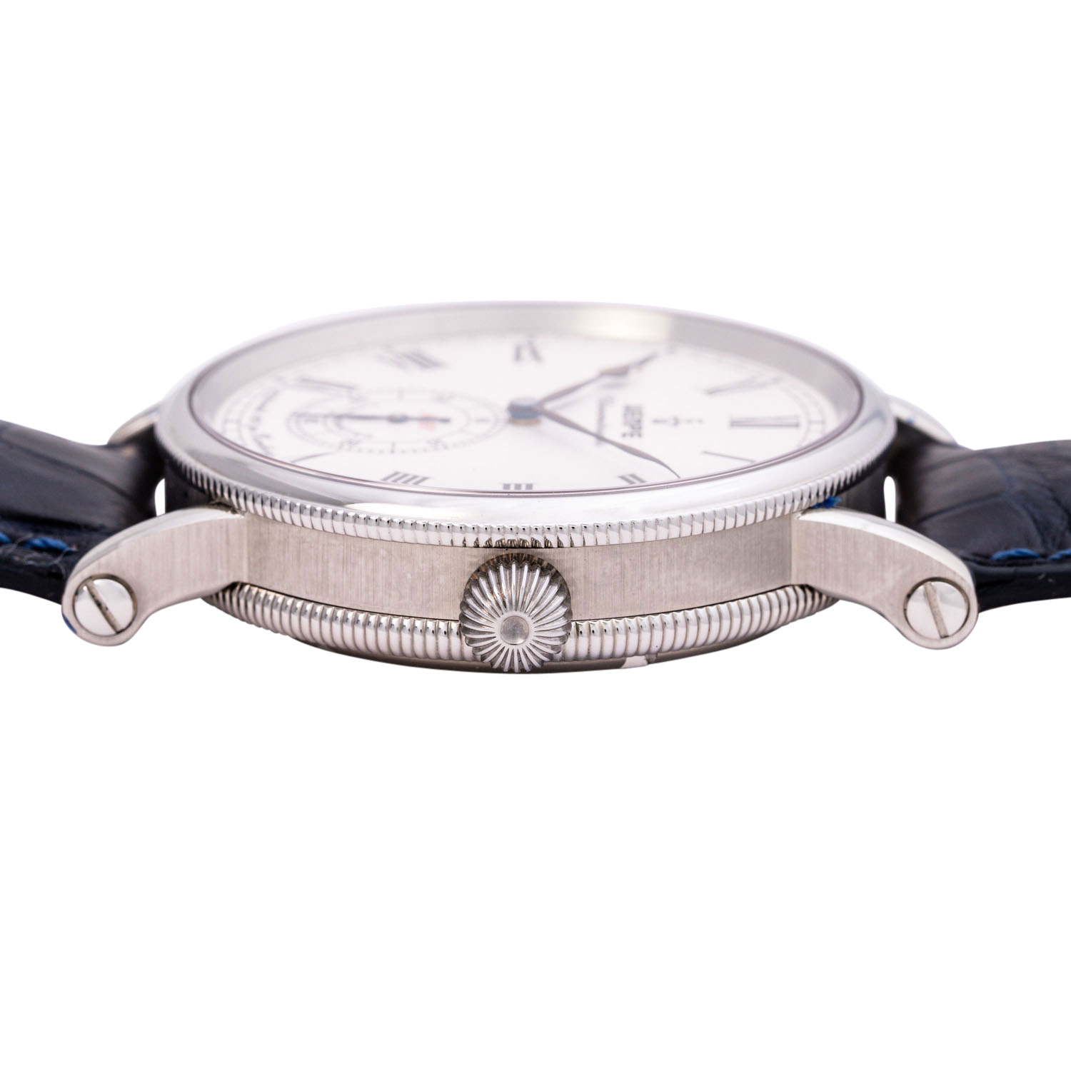 Limitiert auf 250 Stck. Edelstahl. Original Lederband mit Faltschließe. Automatikwerk, Kal. W080, Basis Enicar C.121, mit sehr guten Gangwerten. Protokoll anbei. Weißes zifferblatt, gebläute Stahlzeiger, kleine Sekunde und römische Ziffern. Guter Zustand, leichte Tragespuren am Gehäuse. Original Box und Zertifikat mit Kaufdatum vom Juli 1997 bei Wempe in Stuttgart anbei. Durchmesser ca. 38 mm ohne Krone. Passend bis zu ca. 19,5 cm Handgelenkumfang.