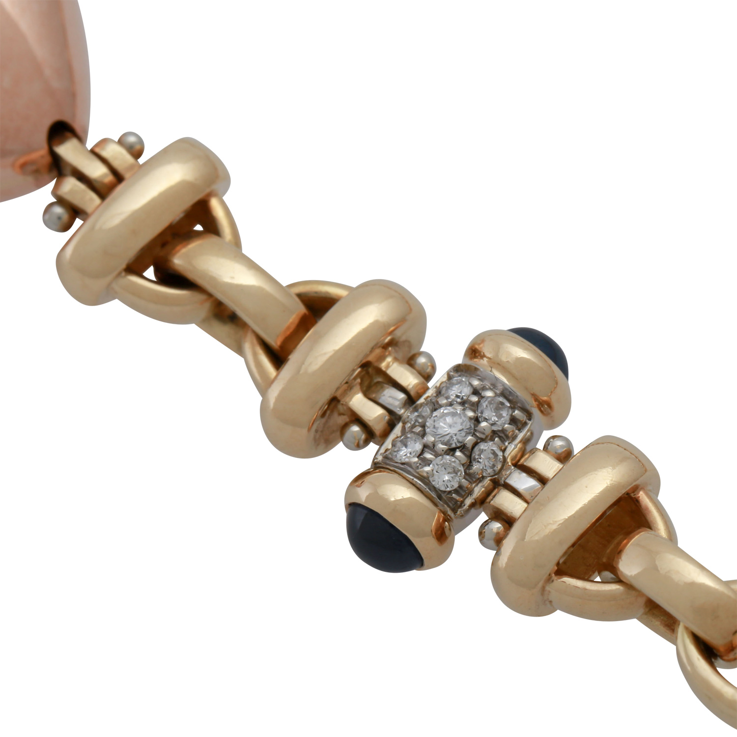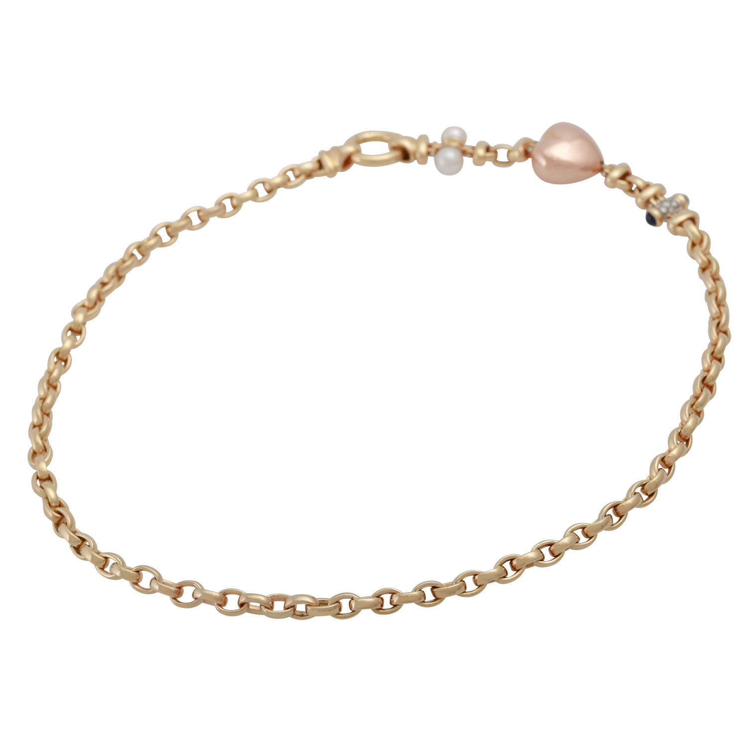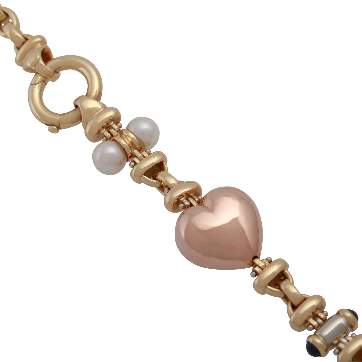 mit 2 Zuchtperlen ca. 6,5 mm, 7 Brillanten zus. ca. 0,09 ct, ca. W(H)/SI-P, 2 Sapircabochon, GG/RG/WG 18K, L: ca. 44 cm, 20 Jh., leichte Tragespuren.