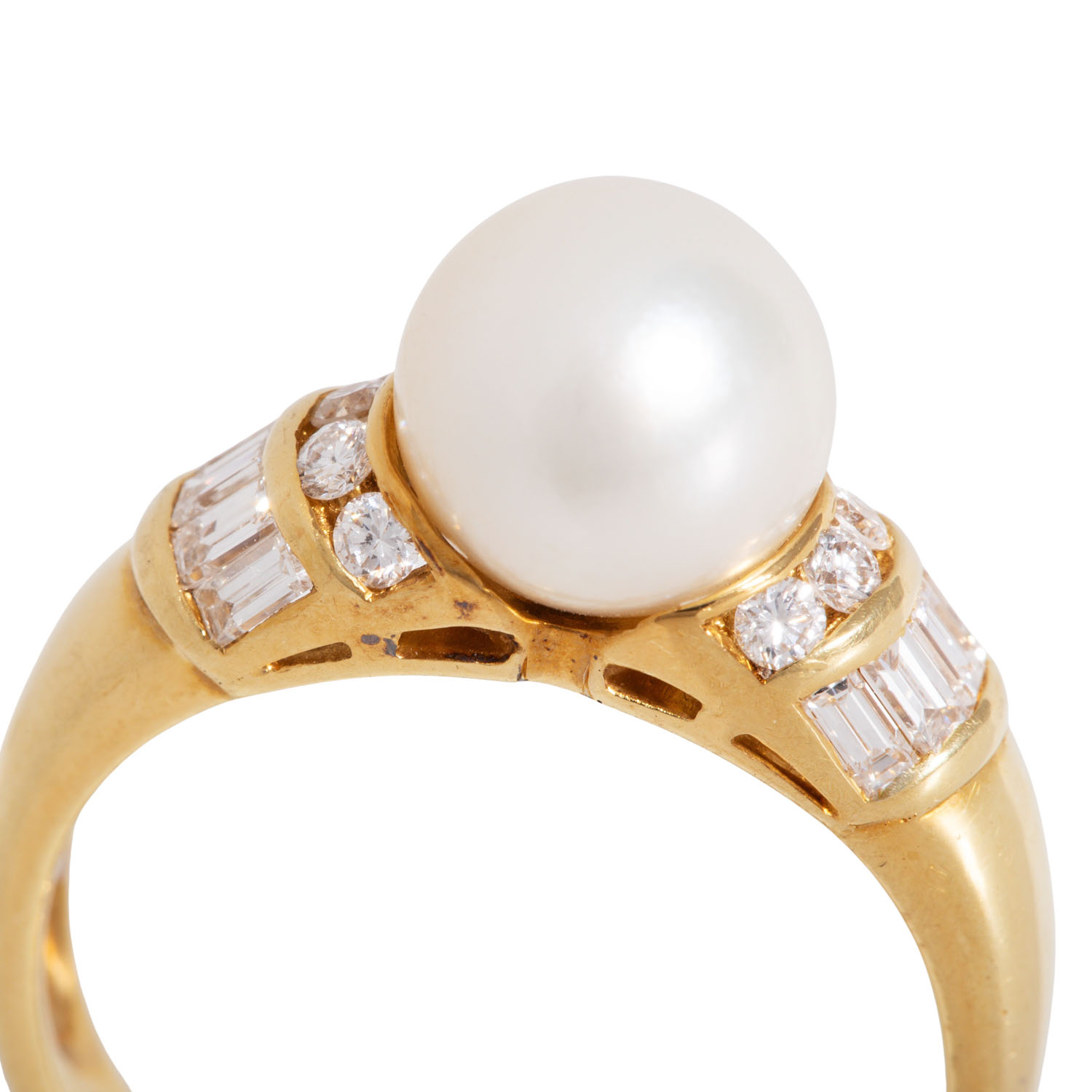 sehr gute Farbe und Reinheit, im Baguette- und Brillantschliff, 1 Akoya Zuchtperle 8,5 mm, GG 18K, 6,1 g, RW: 58, 1990er Jahre, Tragespuren, mit WEMPE Punze, Zertifikat Nr. 8474 und Kopie vom Kaufbeleg.