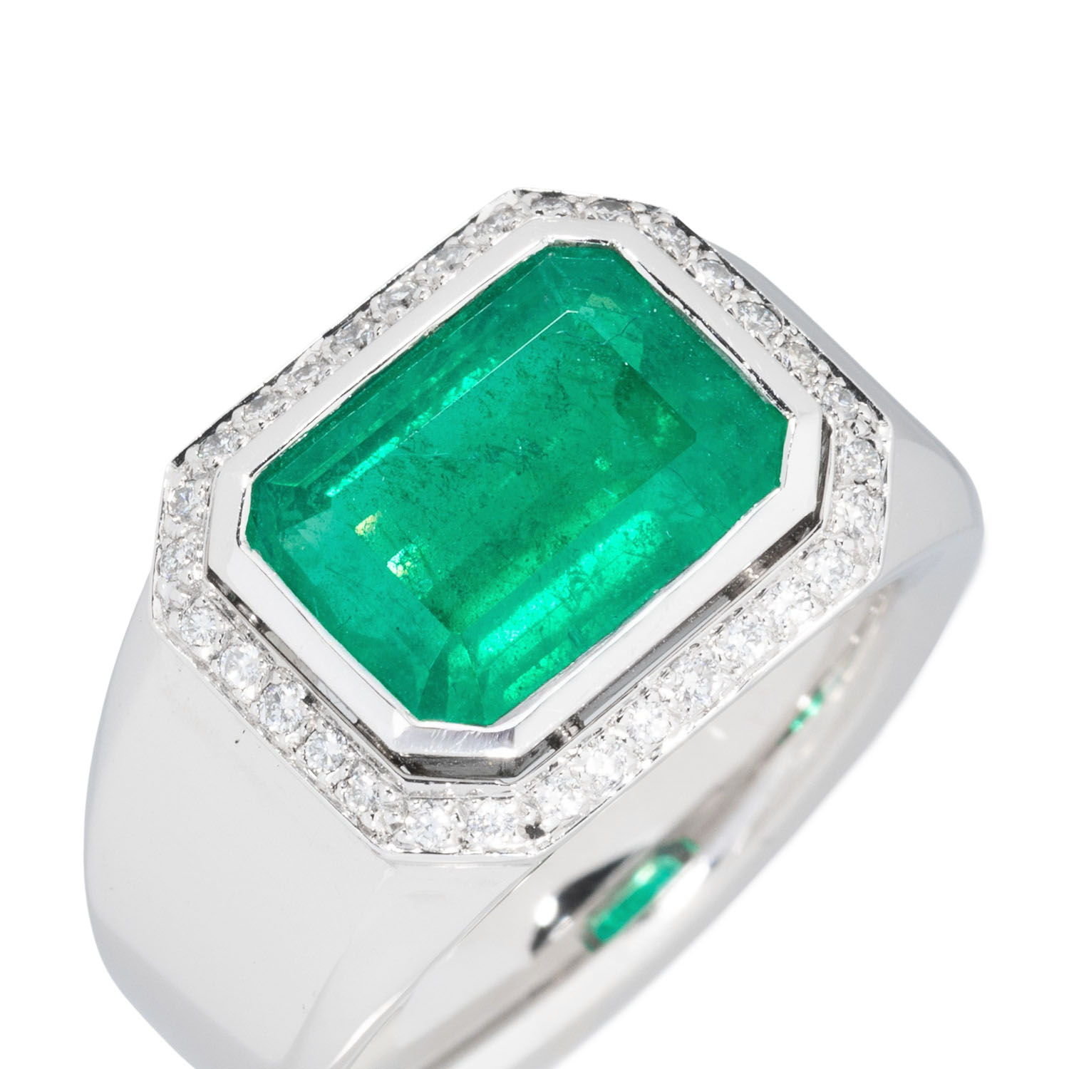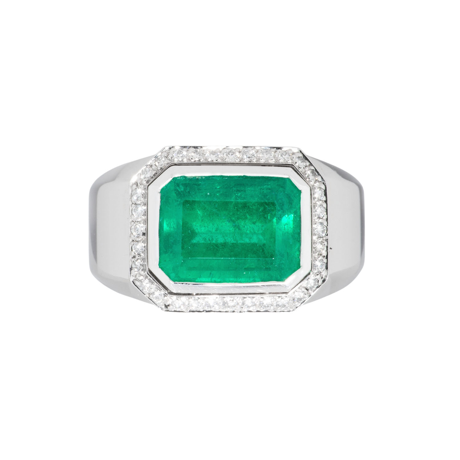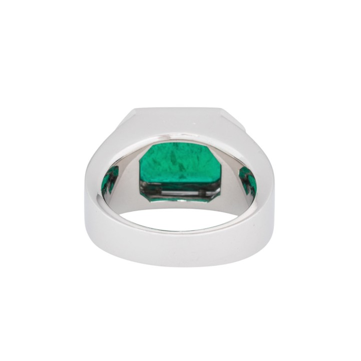 im achteckigen Treppenschliff, schöne Grüne Farbe, mäßiges Jardin, gering-mod. Öl, ca. 5,4 ct, umgeben von 32 Brillanten, zus. ca. 0,23 ct, sehr gute Farbe und Reinheit, WG 18K, 28,9 g, RW 58, 21. Jh, leichte Tragespuren, graviert 'WEMPE', Anfertigung mit Kundenstein.