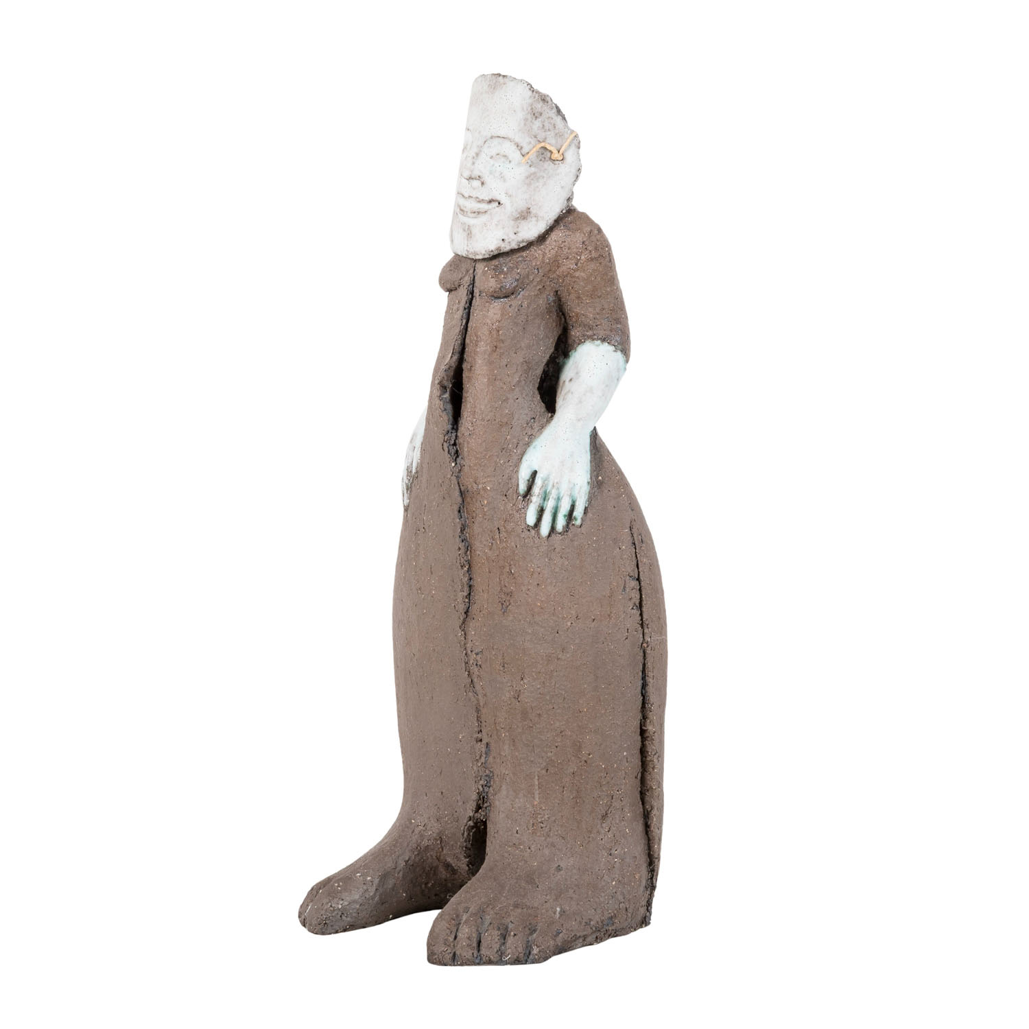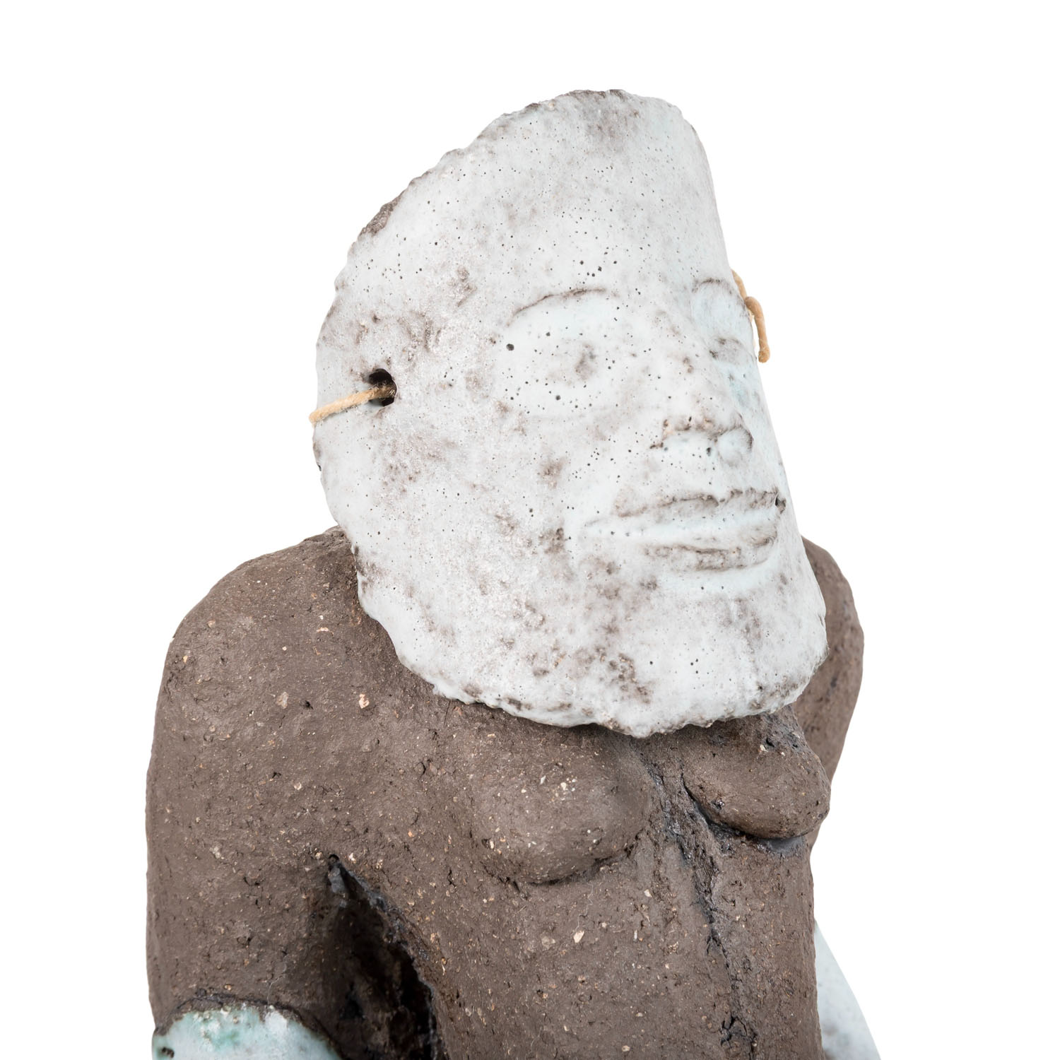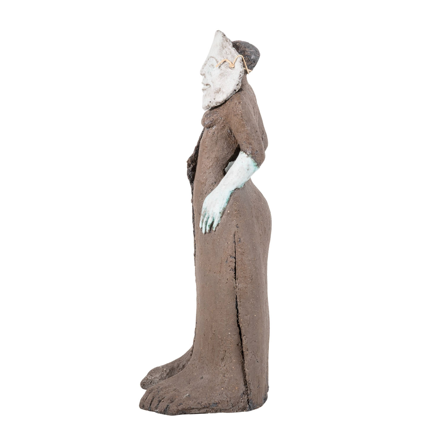 weibliche Figur mit abnehmbarer Maske, Keramik, auf Unterseite des Fußes Etikett mit handschriftlichen Angaben zur Künstlerin, H: ca. 29,5 cm. Alters- und Beriebsspuren.