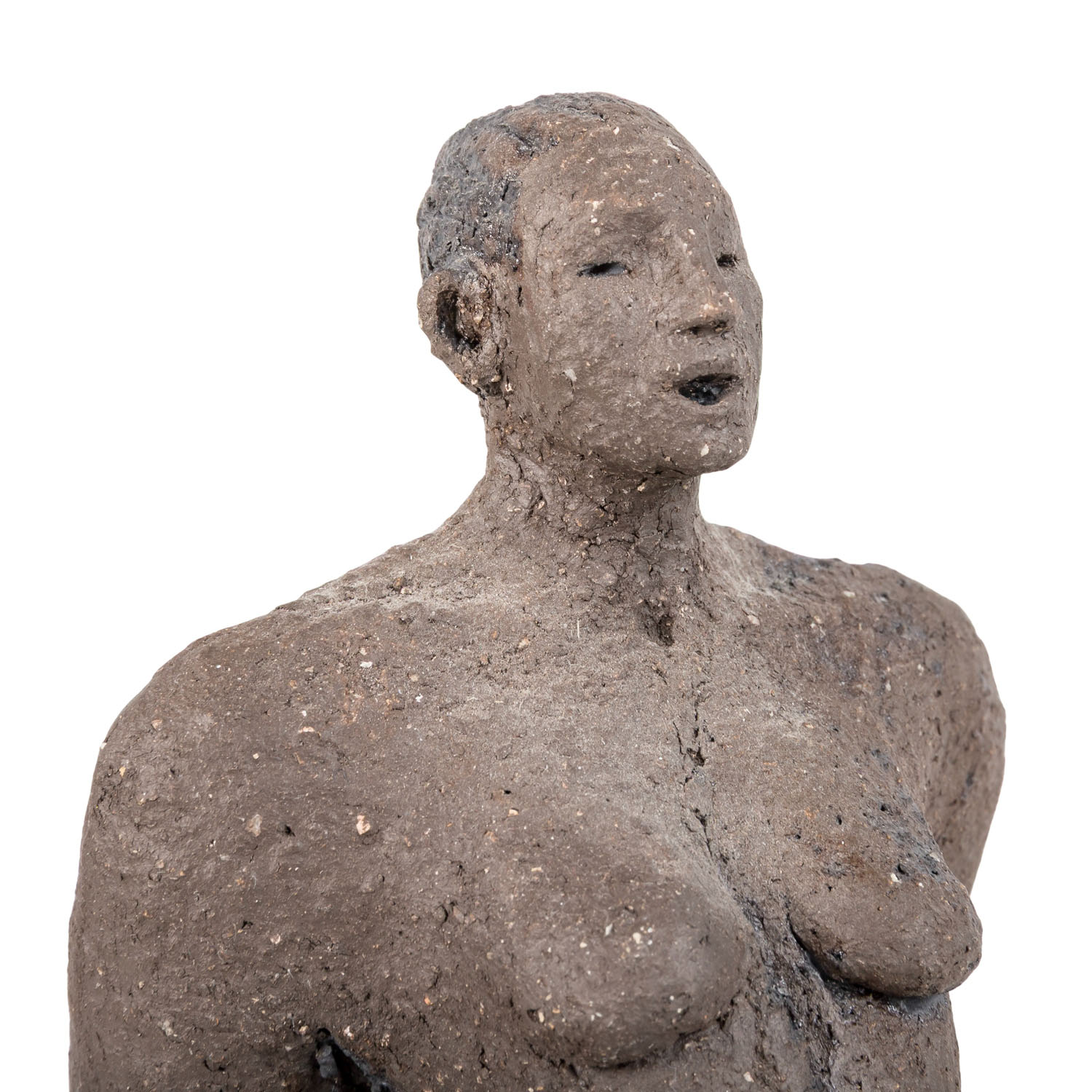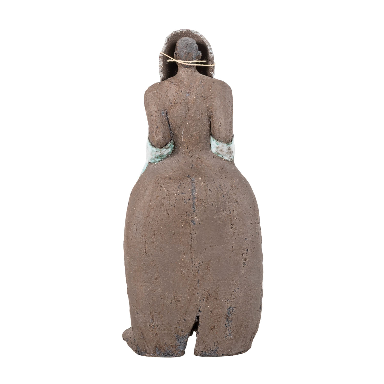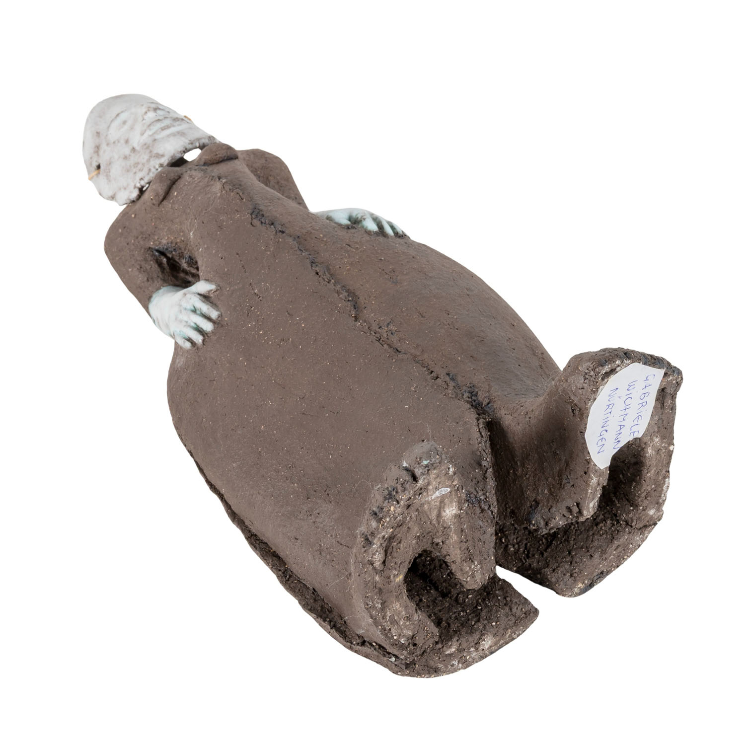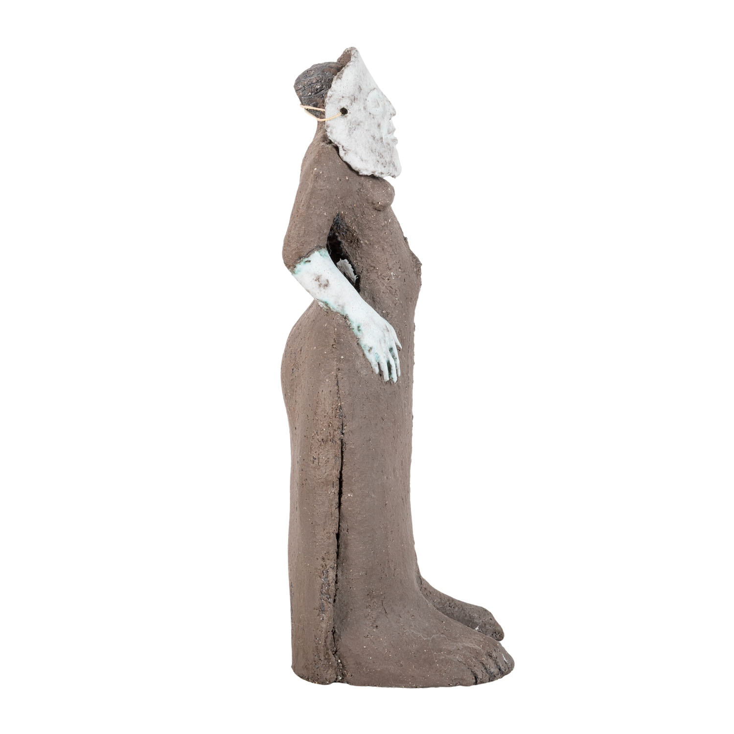 weibliche Figur mit abnehmbarer Maske, Keramik, auf Unterseite des Fußes Etikett mit handschriftlichen Angaben zur Künstlerin, H: ca. 29,5 cm. Alters- und Beriebsspuren.