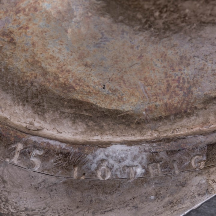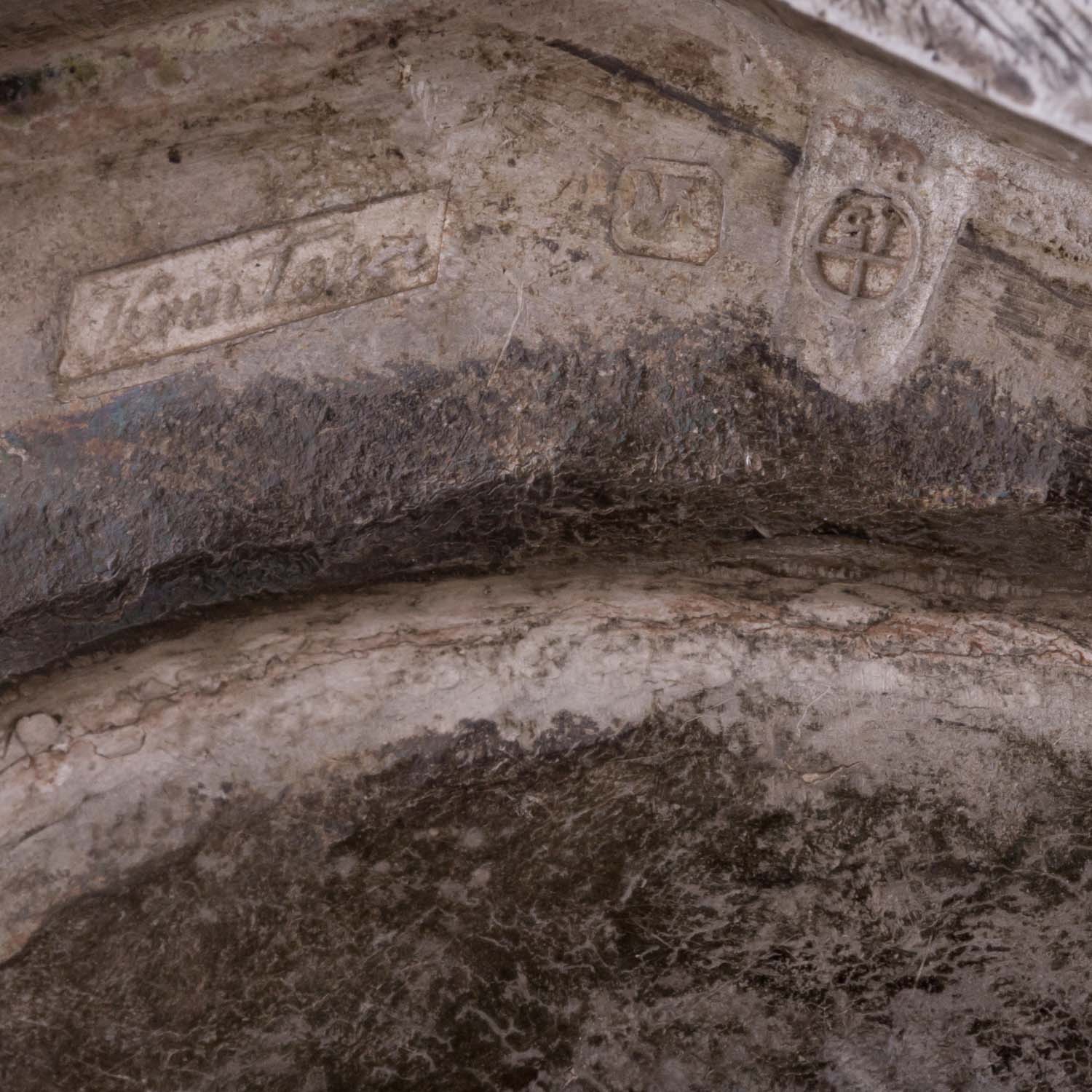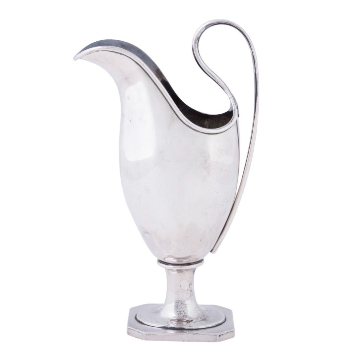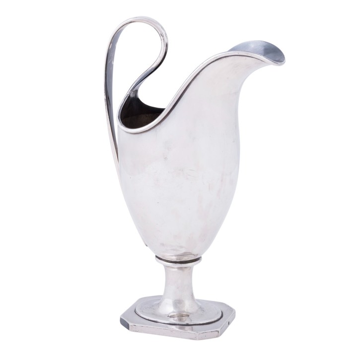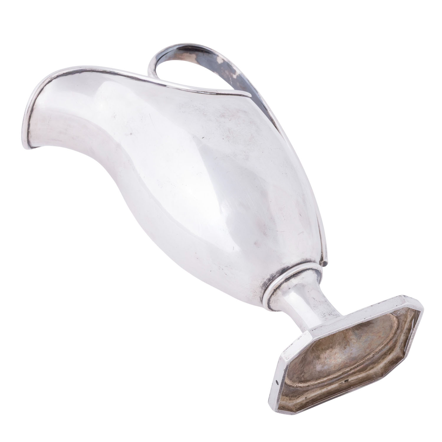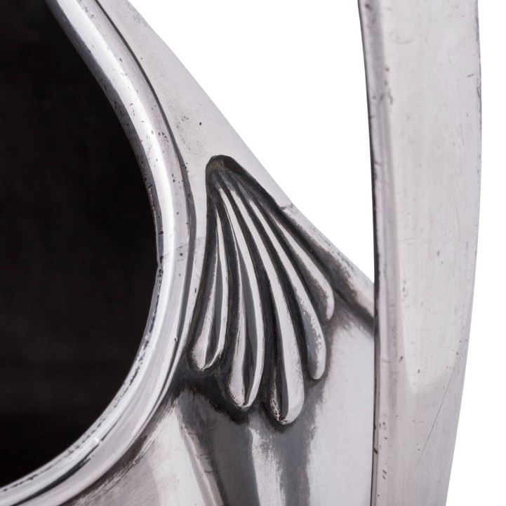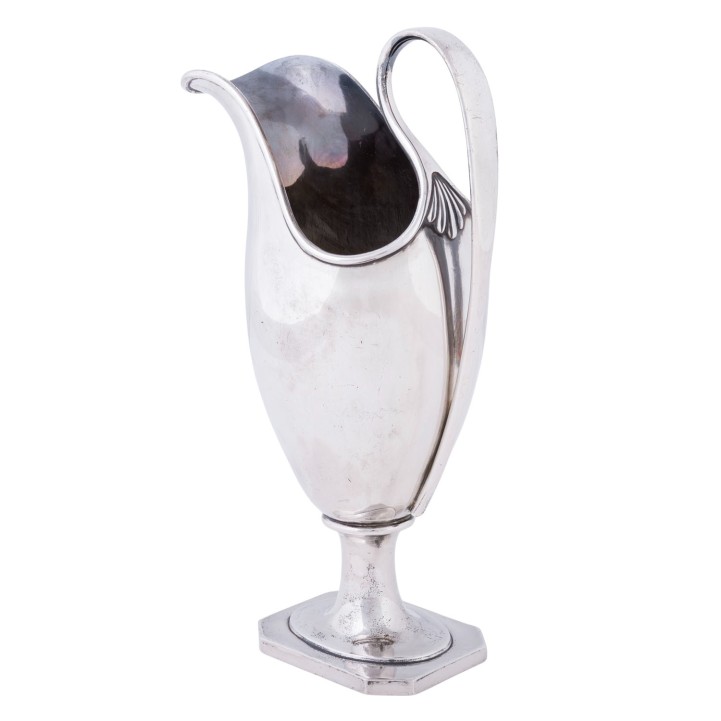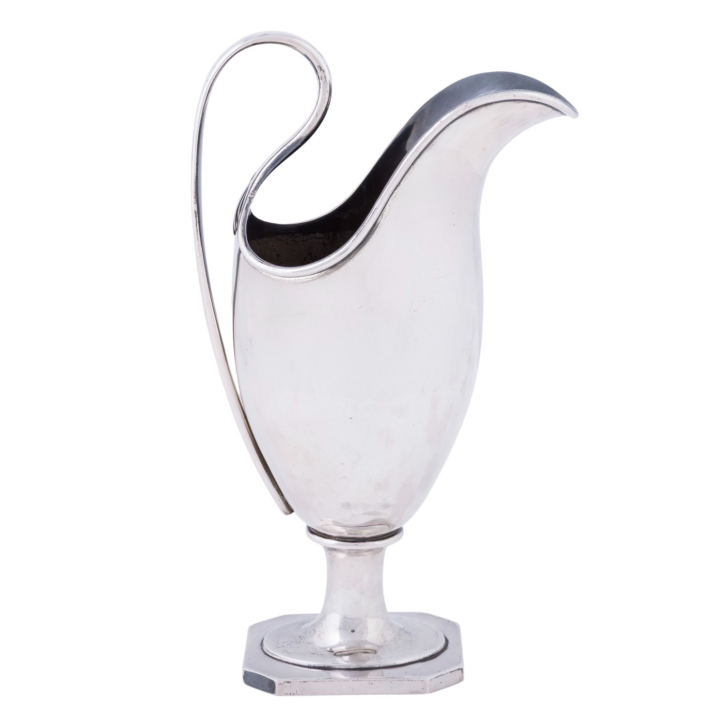 Hohe, geschwungene Empire-Kanne auf oktogonalem Standfuß, Meistermarke Krautauer (JAKOB KRAUTAUER, aktiv 1795–1825), Wiener Radmarke mit Feingehalt- und Jahresangabe (wohl 1817), Steuerstempel VR (1811/1824) und 15 LÖTHIG, Höhe ca. 25 cm, Gewicht ca. 633 g. Alters- und Gebrauchsspuren.
