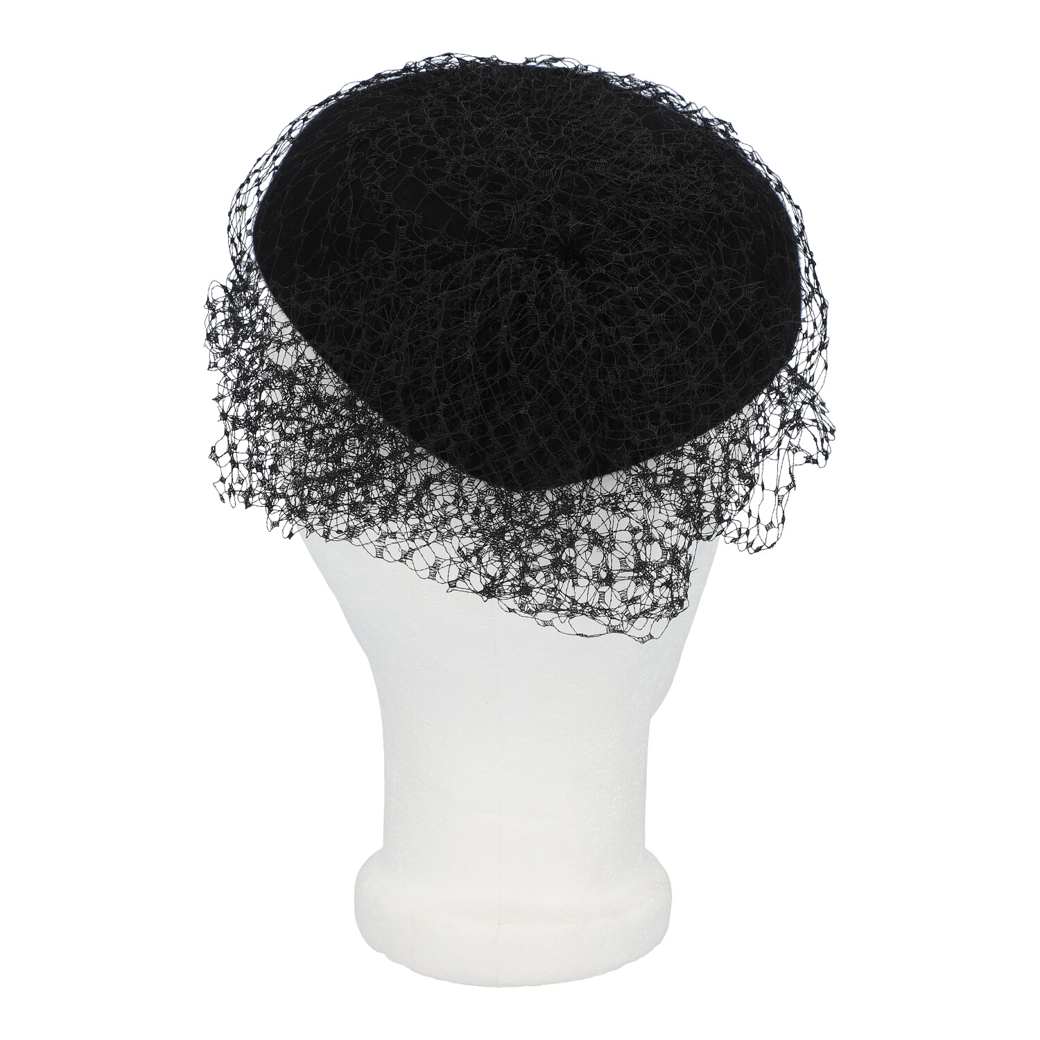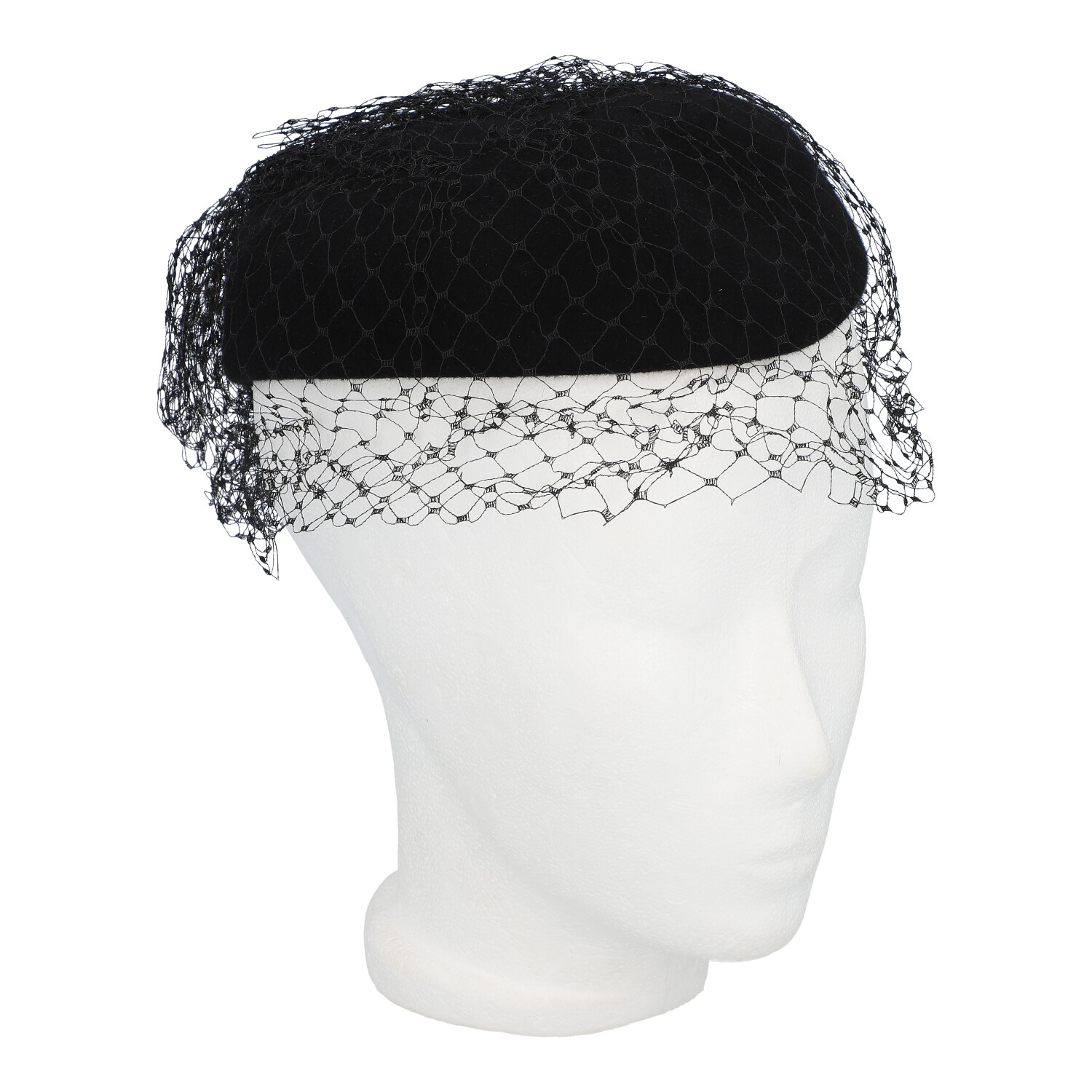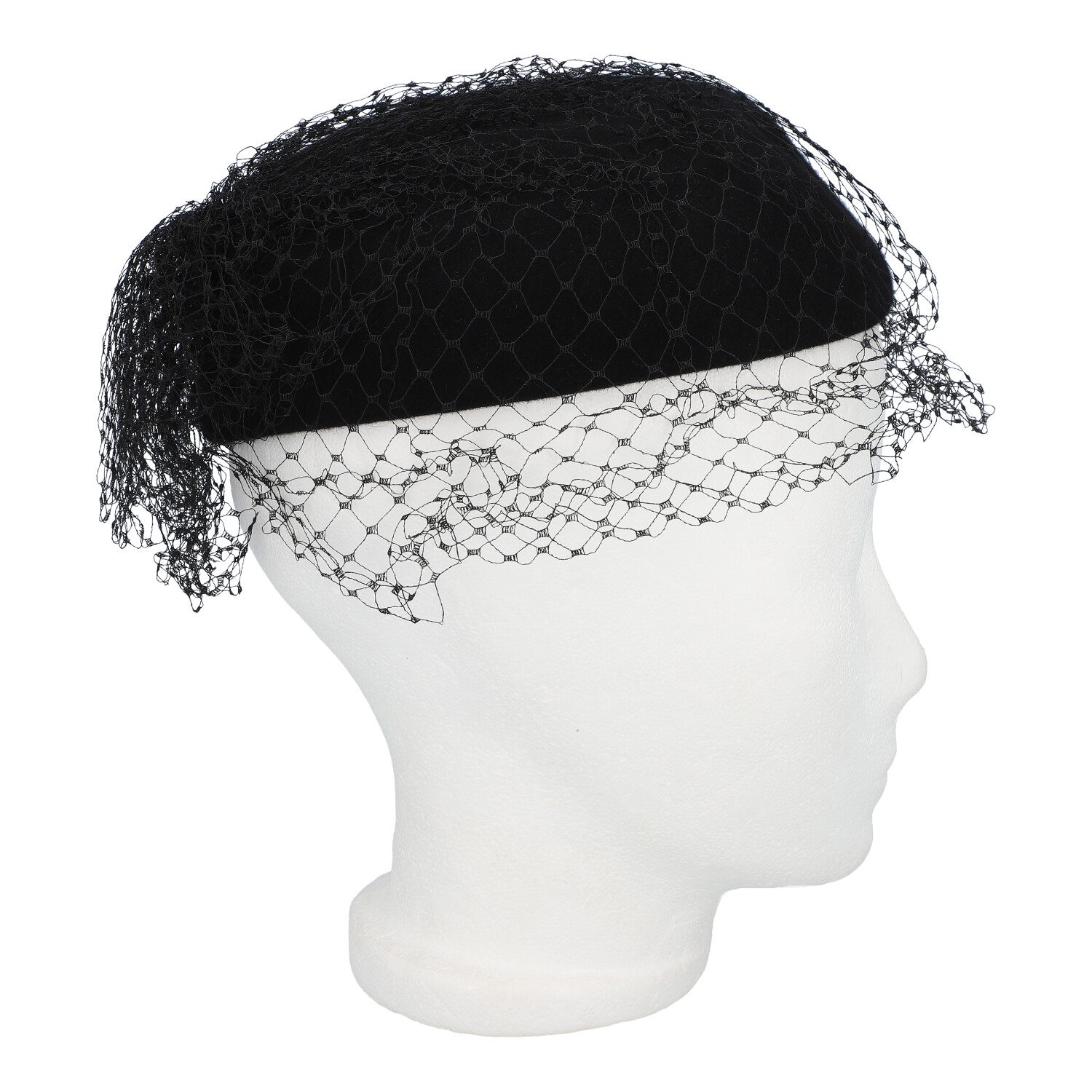 Pillbox Modell in Schwarz mit Netzbesatz und elastischem Band. Tragespuren vorhanden.