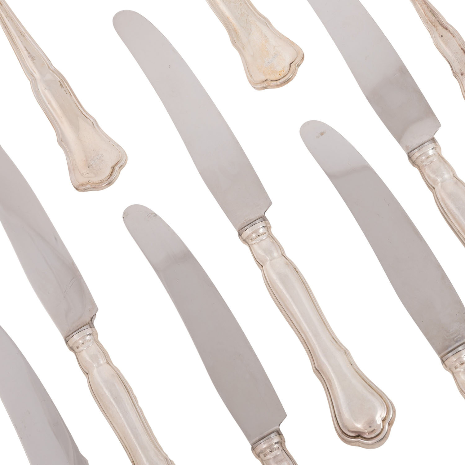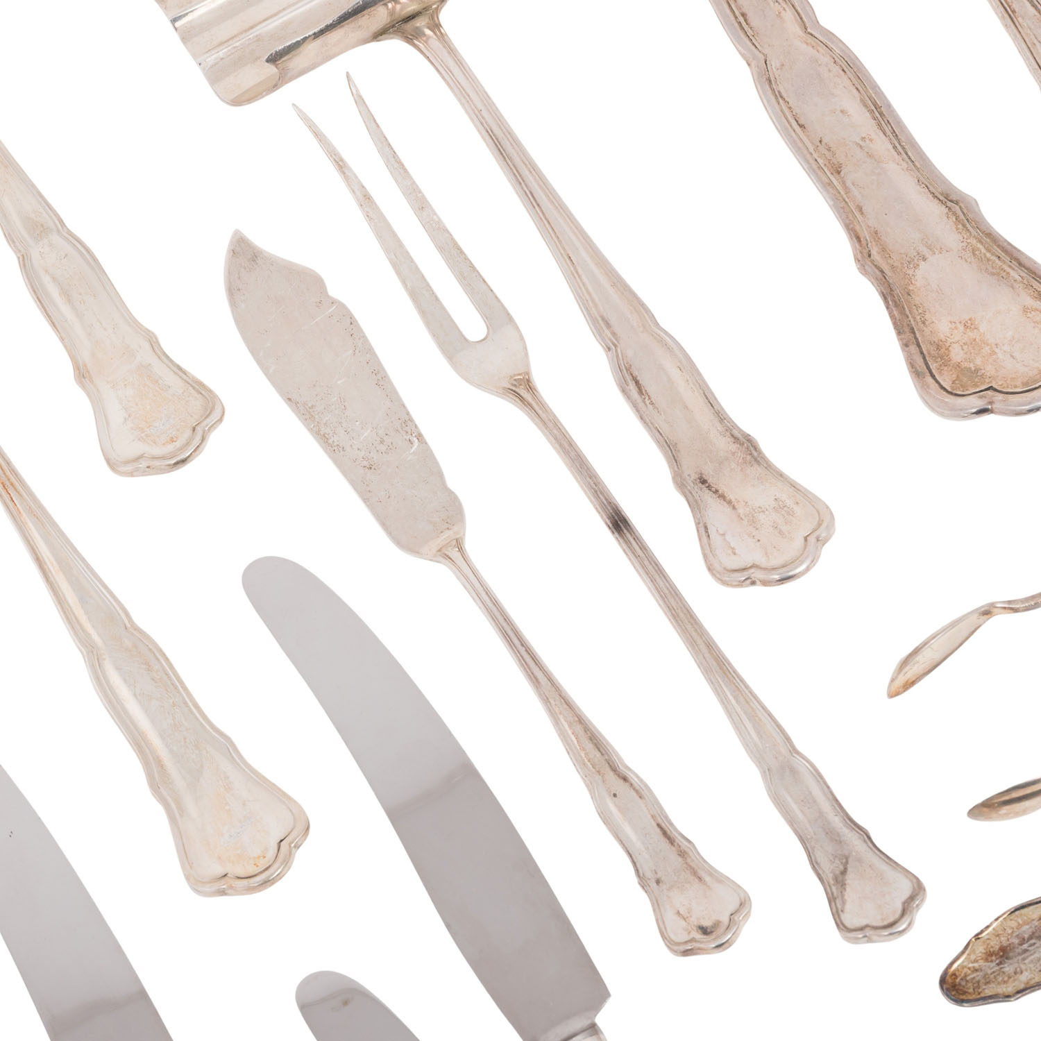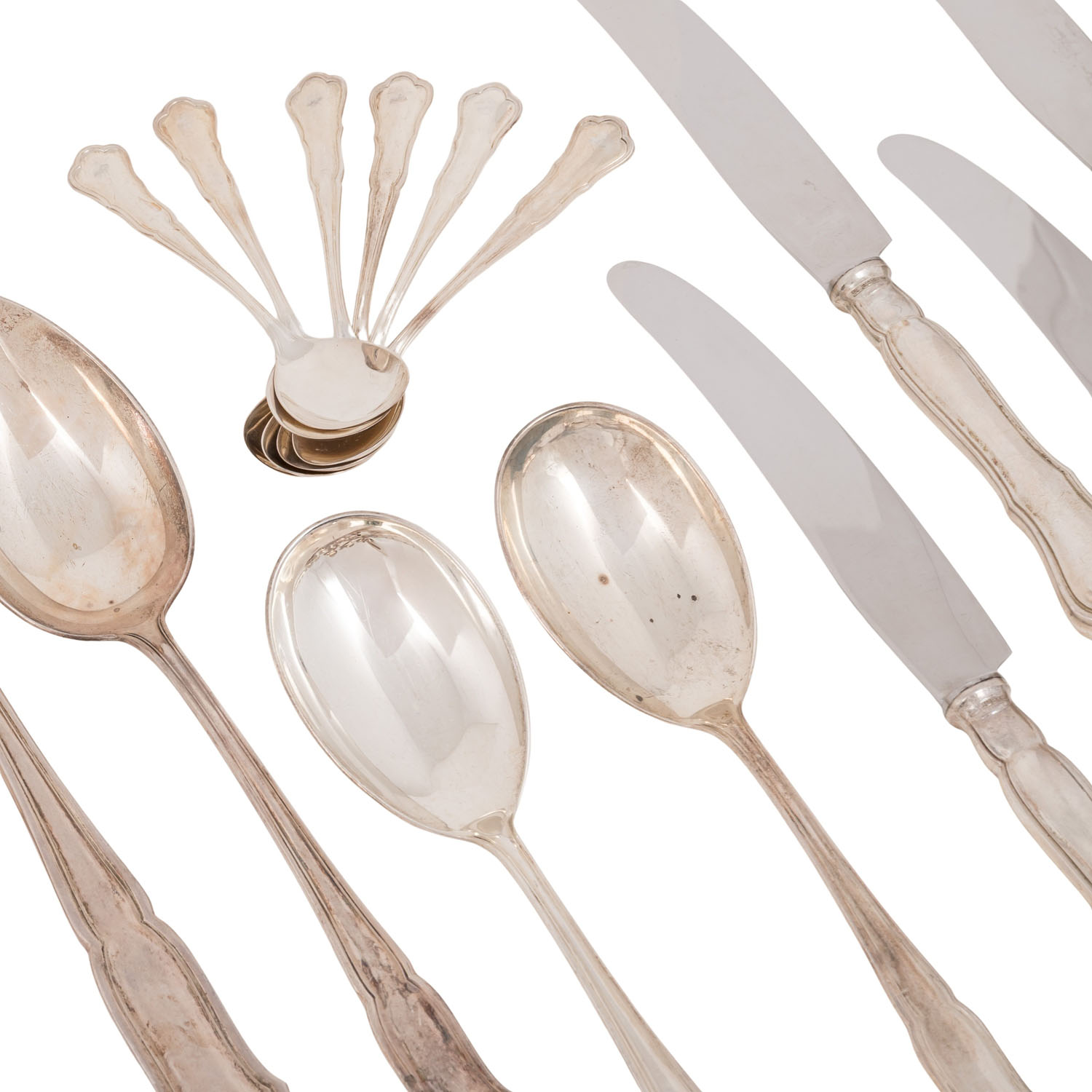 6 Dessertgabeln, 6 Dessertmesser, 6 Menugabeln , 6 Menumesser, 6 Menulöffel, 6 Kuchengabeln, 6 Obstmesser, 6 Kaffeelöffel, 6 Eislöffel, 6 Espressolöffel und 8 Vorlegeteile, dazu abweichend 1 kleine Vorlegegabel GEBRÜDER REINER 'Chippendale' (800 Silber), ca. 2450 g, insgesamt 69 Besteckteile. Alters- und Gebrauchsspuren.
