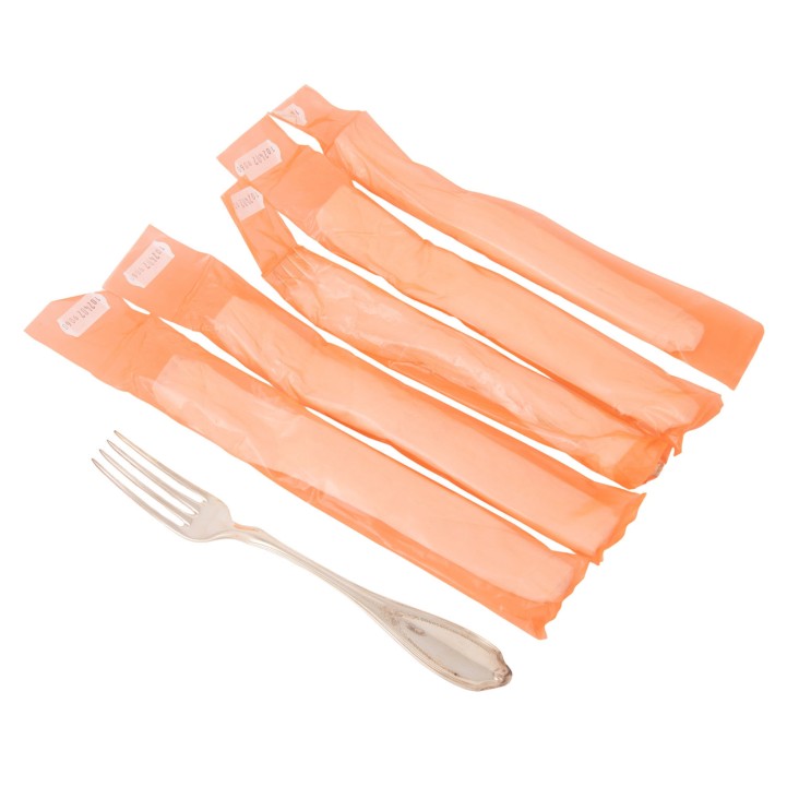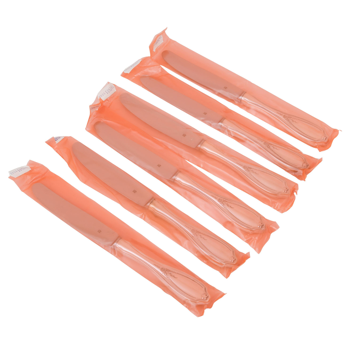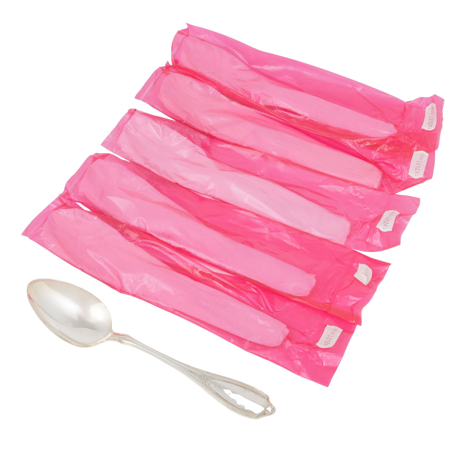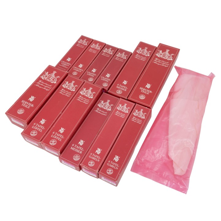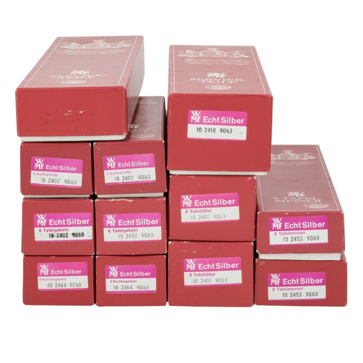 12 Tafellöffel, 12 Tafelgabeln, 12 Tafelmesser, 12 Kaffeelöffel, 12 Kuchengabeln und 3 Vorlegeteile, Gesamtgewicht in Folie ca. 2600 g. 63 Besteckteile, größtenteils originalverschweißt und in Originalkartons.