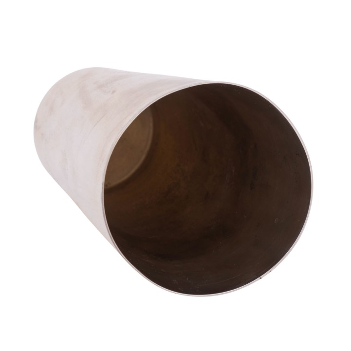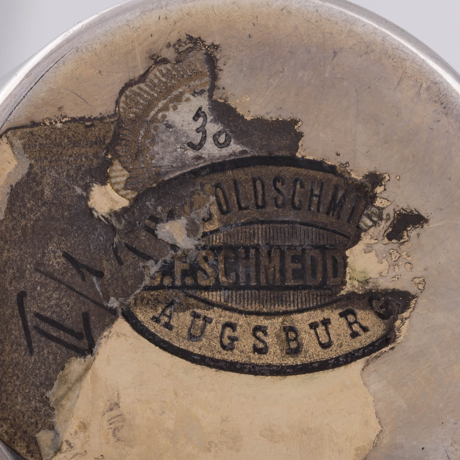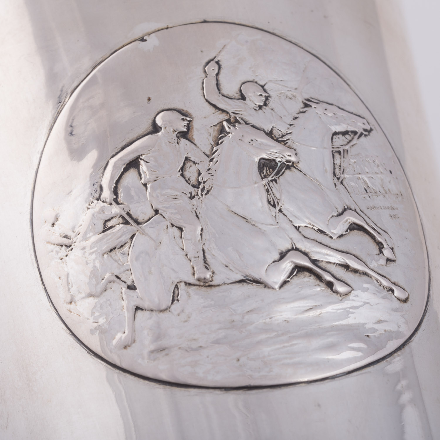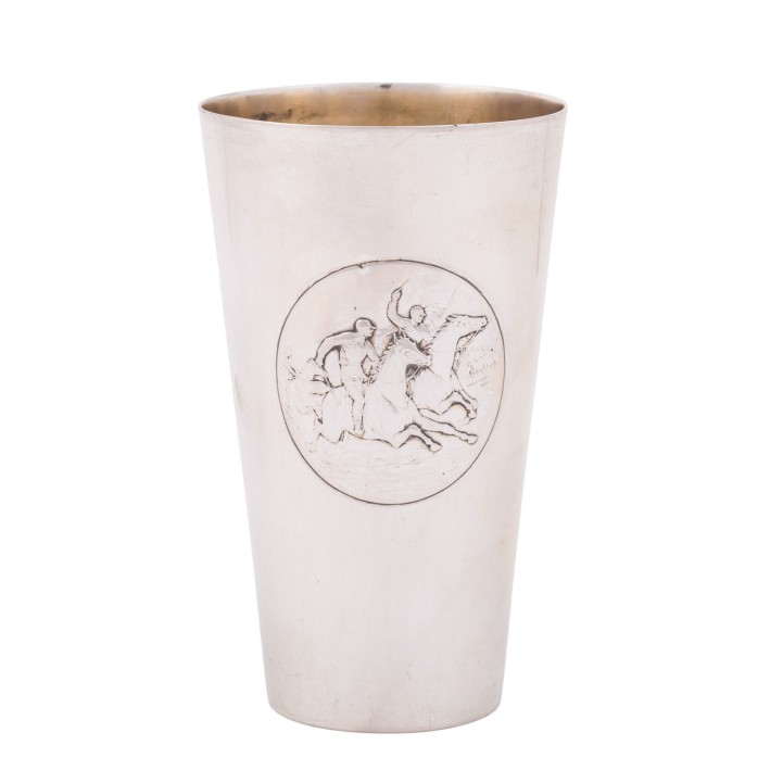 konische Form, glatte Wandung, auf der Schauseite eine reliefierte Polo-Reiterszene, H: ca. 13 cm, auf der Unterseite ein Aufkleber der Goldschmiede Schmedding in Augsburg, auf Silber geprüft, Gw. ca. 146 g. Alter- und Gebrauchsspuren. Becherrand verformt, jedoch nicht gedellt.