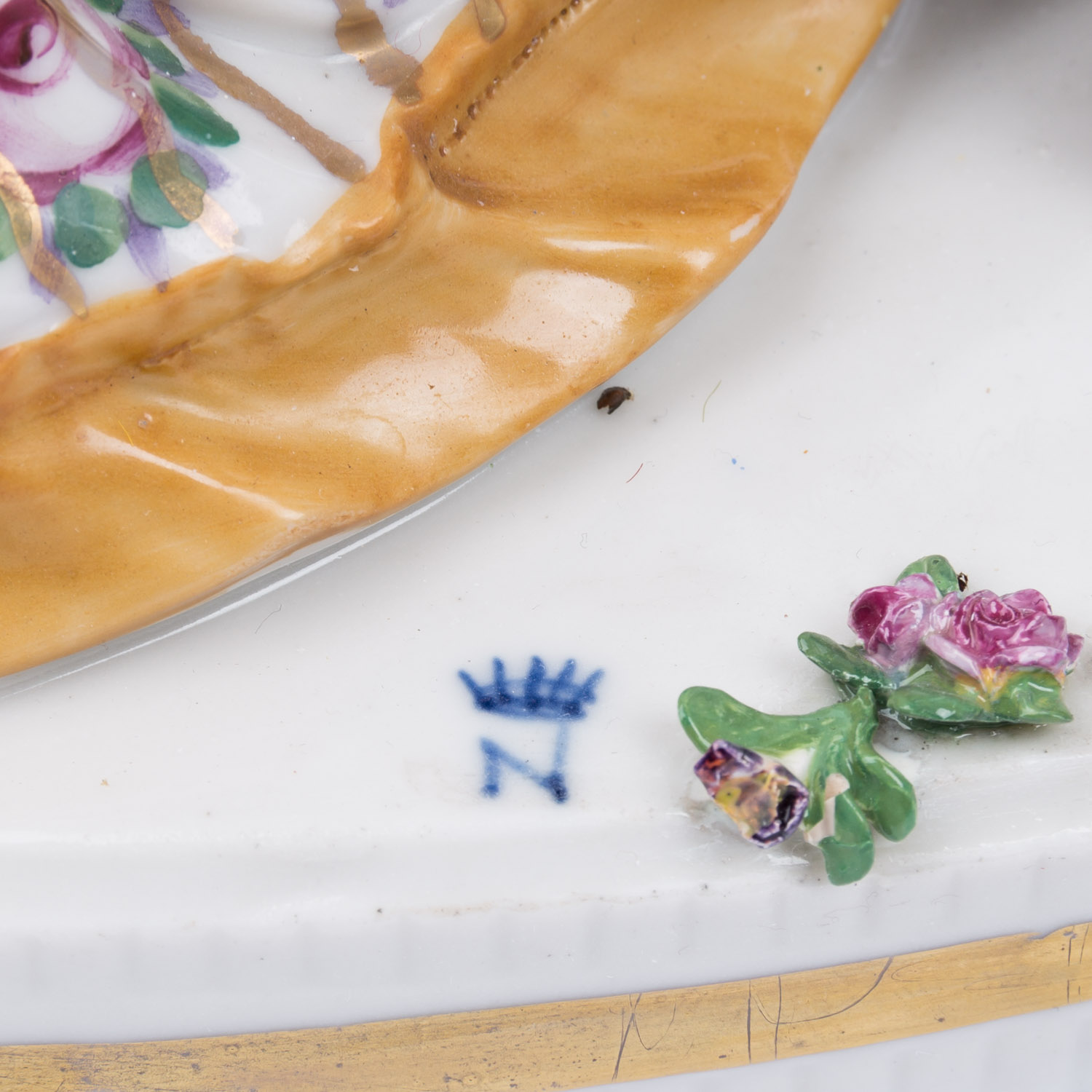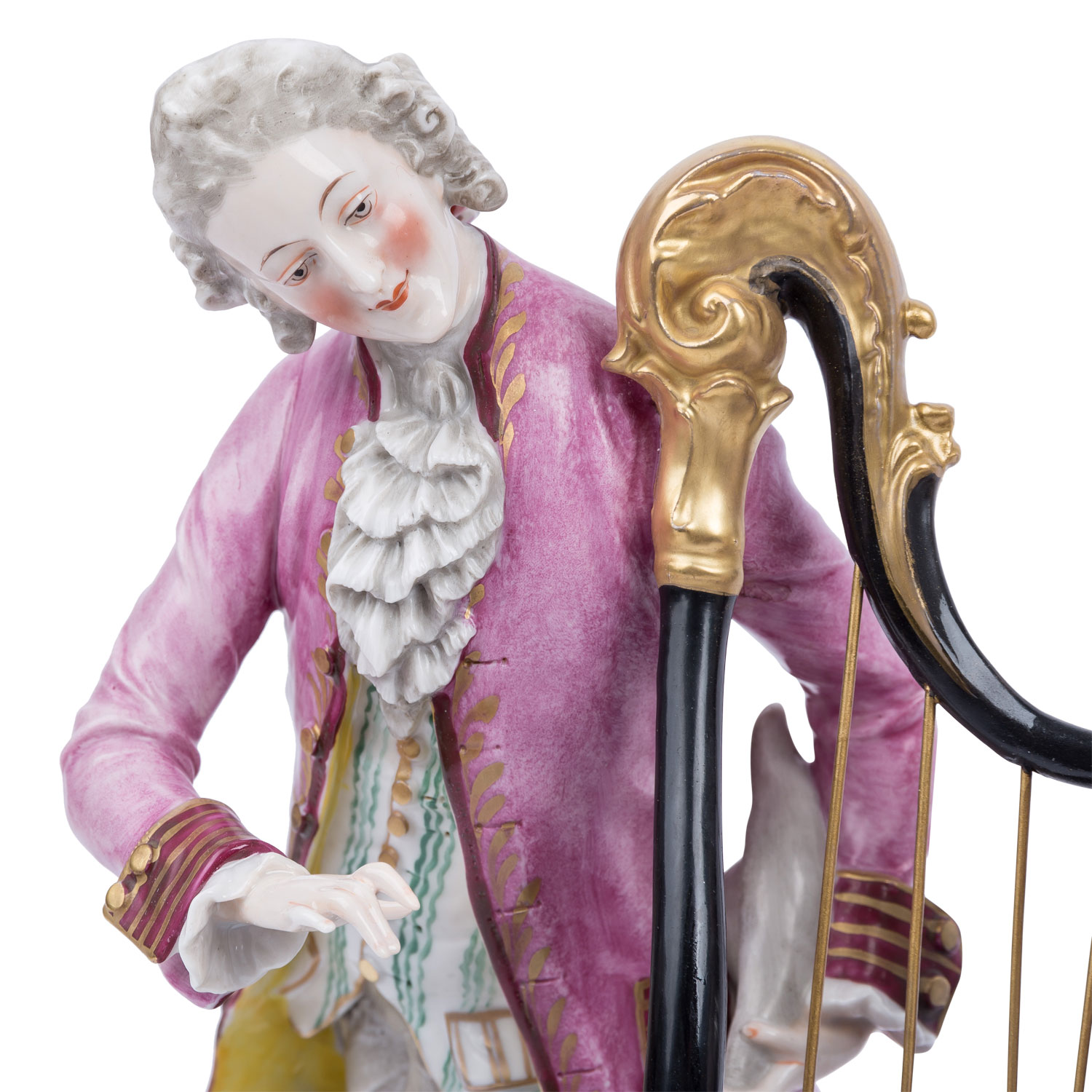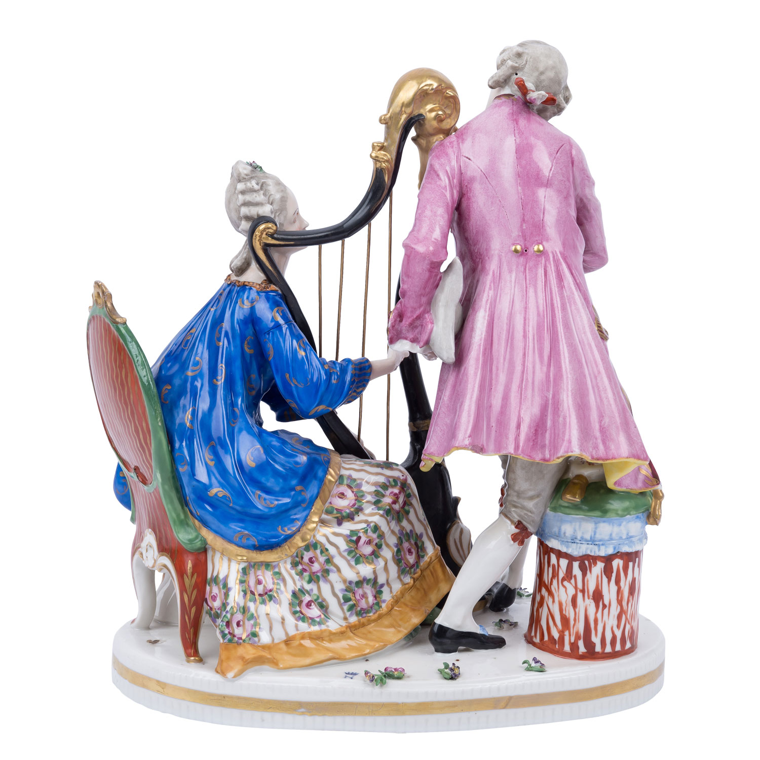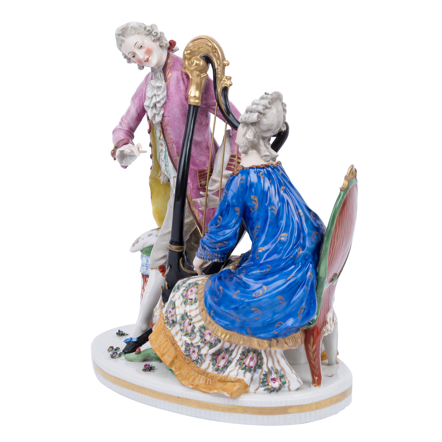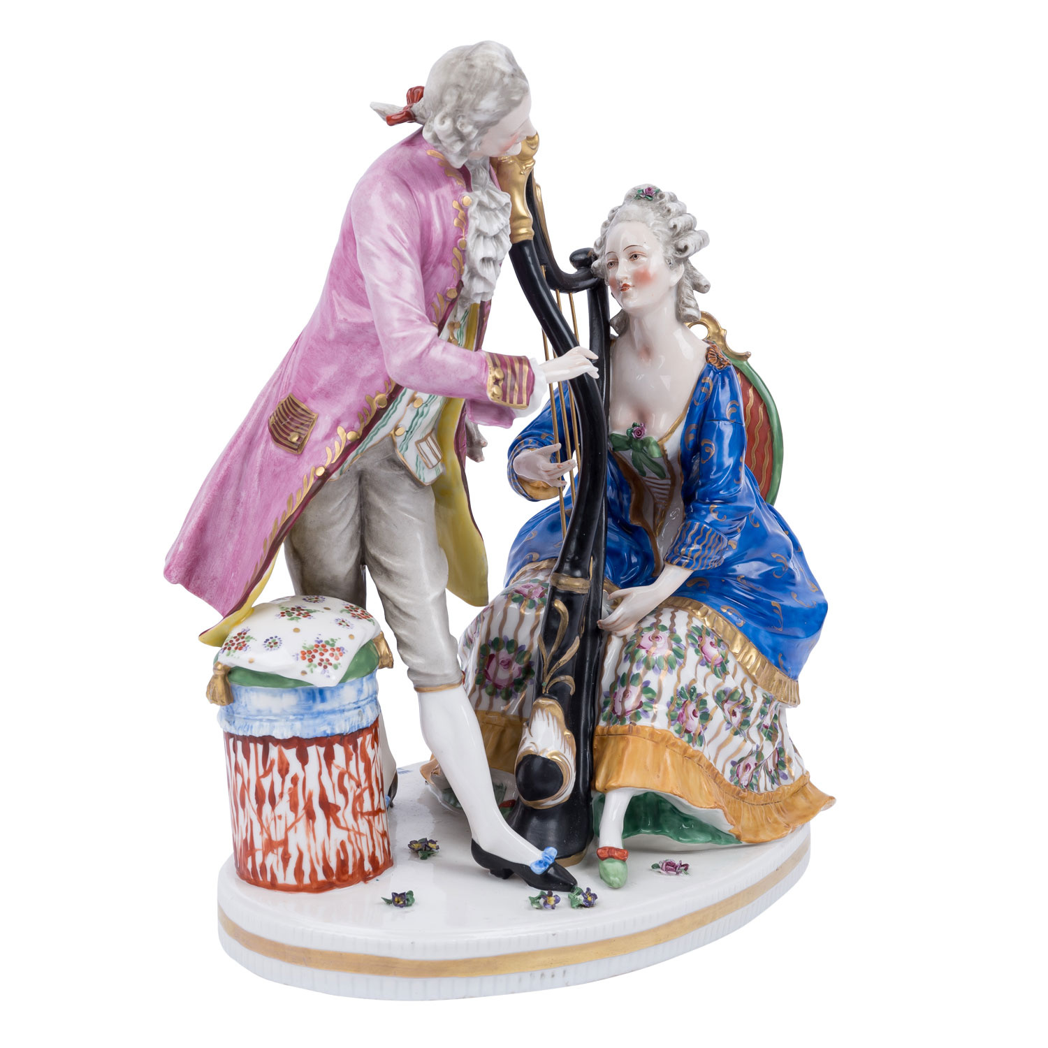 Weißporzellan polychrom staffiert, ein galantes Paar im Rokokostil auf einem ovalen Sockel, die Dame sitzt auf einem Fauteuil und spielt Harfe, der Herr steht neben einem Hocker und neigt sich der Dame zu, auf dem Sockel mit blauer Marke 'N' bekrönt, 31 cm, L. ca. 28. Fehlstellen, am Stand beschädigt, partiell berieben.