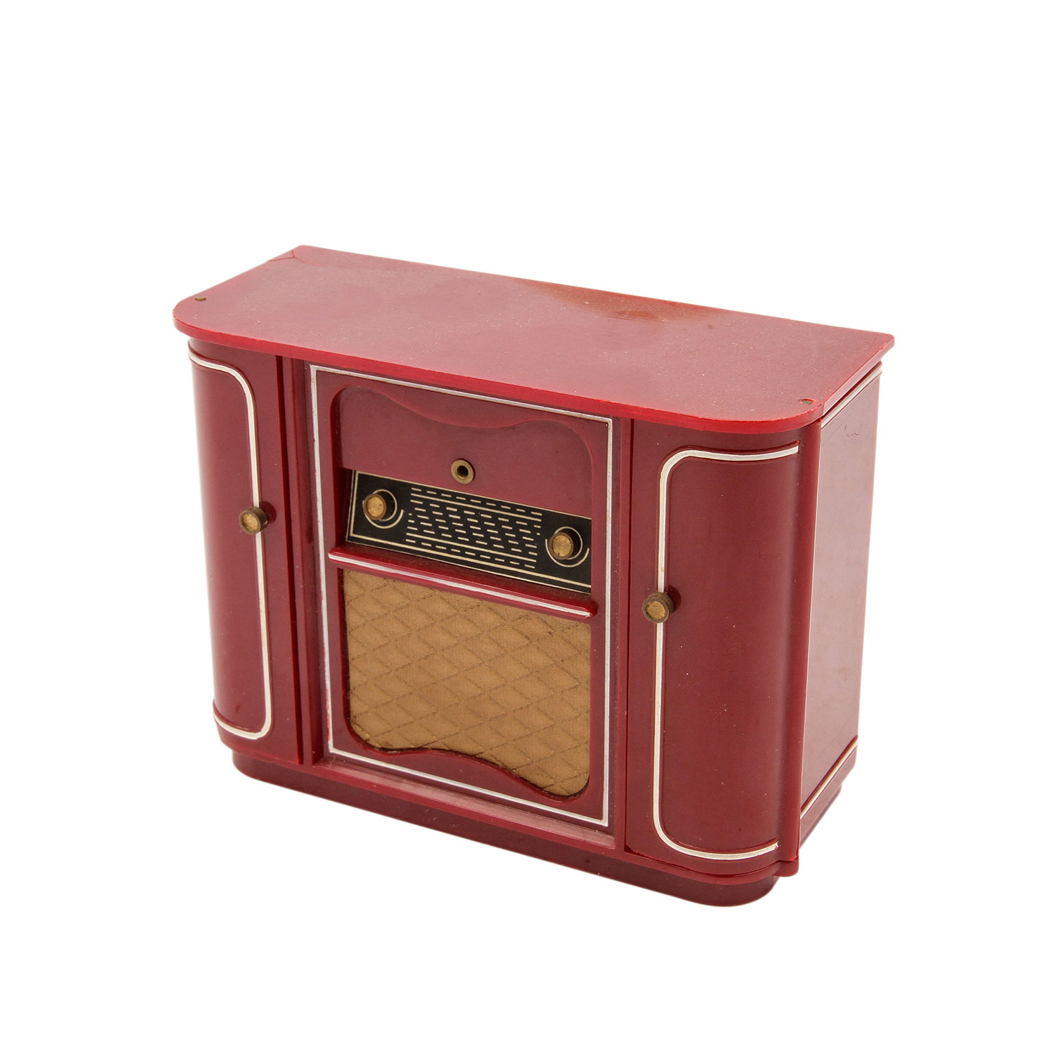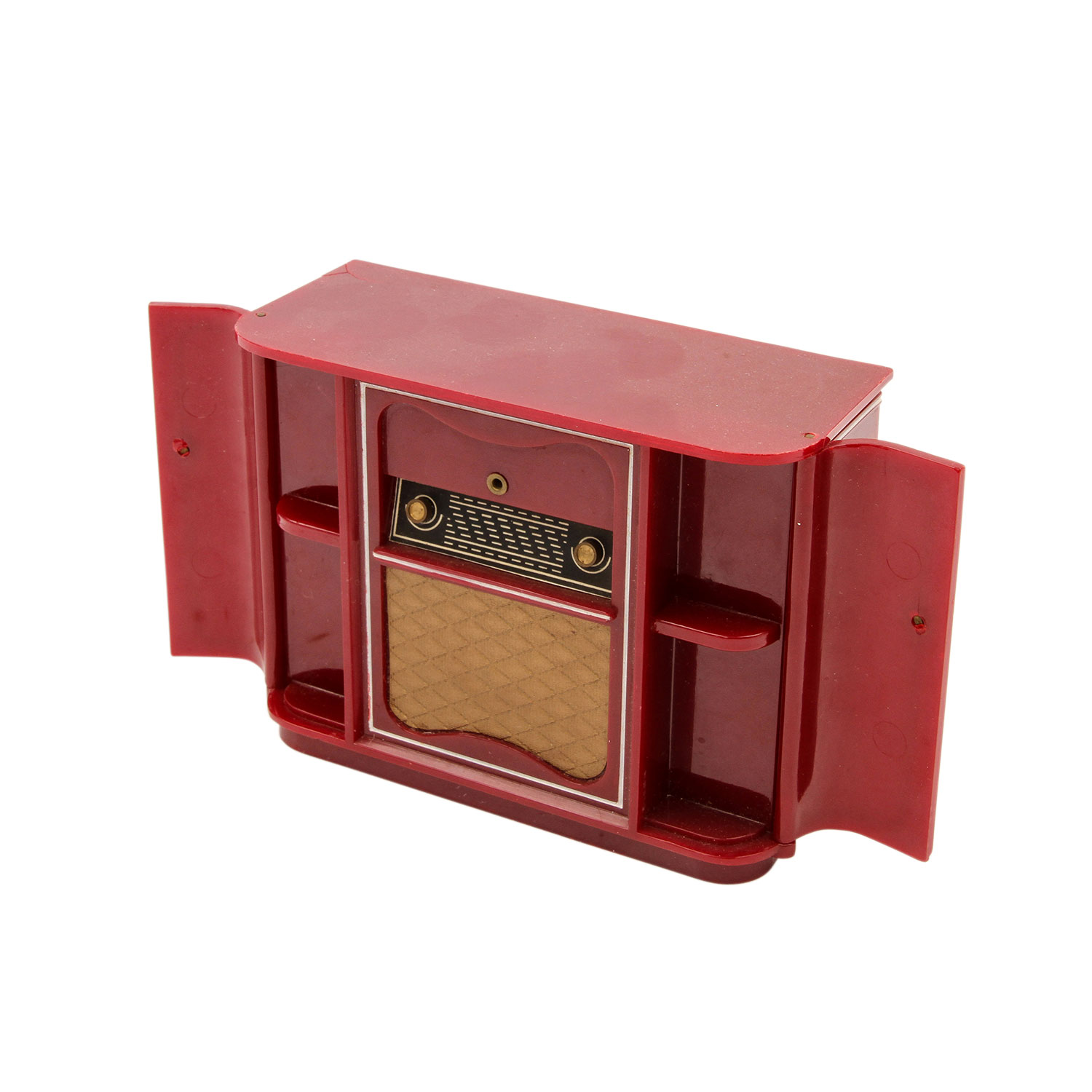 Wohnzimmermöbel für die Puppenstube, 1930er/40er Jahre, Holz, bestehend aus Schrankwand, Kommode, Couchtisch, Sofa, 4 Sesseln, Stuhl, Hocker, Teewagen, Lampentisch, Bild, Weihnachtsbaum (1 Kugel besch.) u. Musikanlage als Spieluhr (Bakelit-Gehäuse min. besch.). Altersspuren, HxB. (Schrankwand) ca. 15x19 cm.