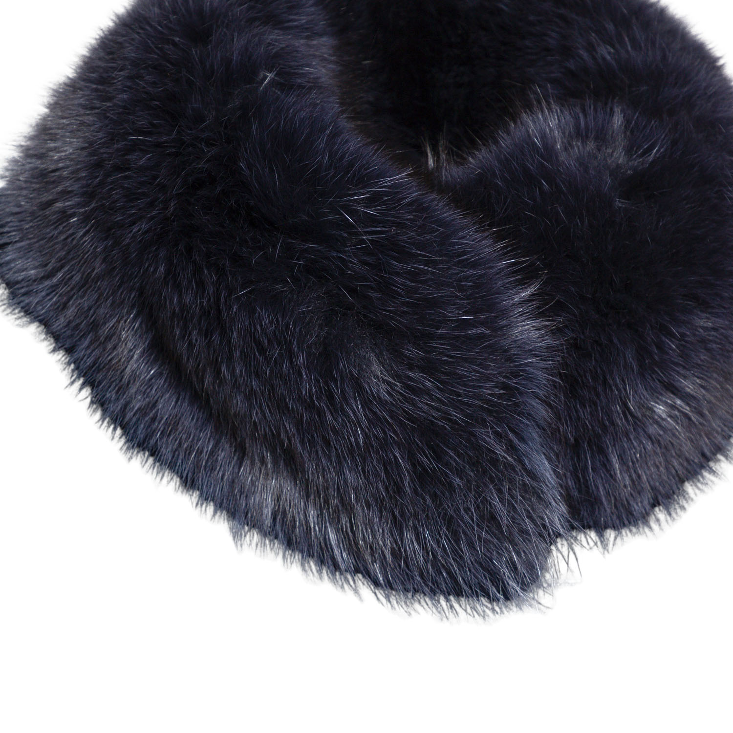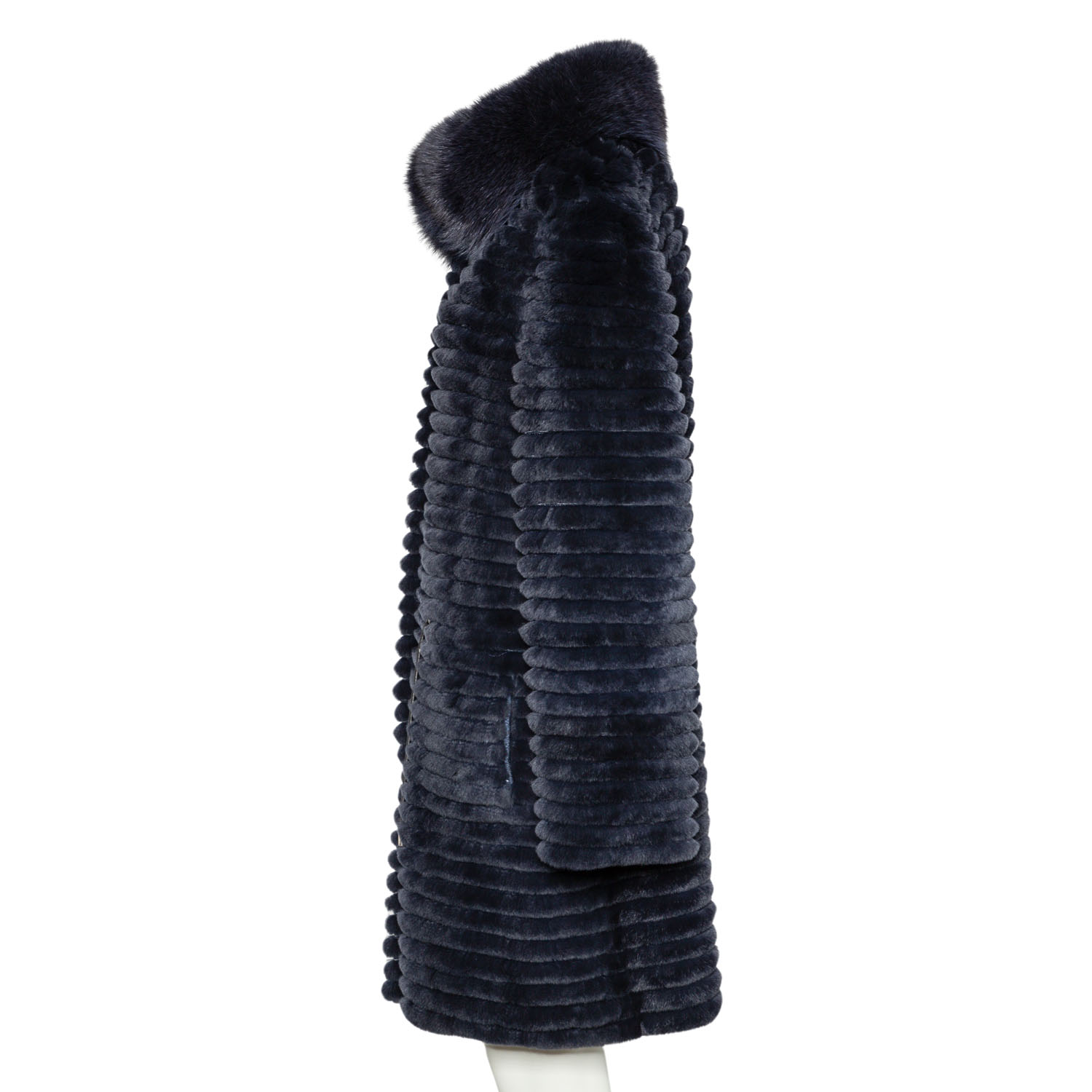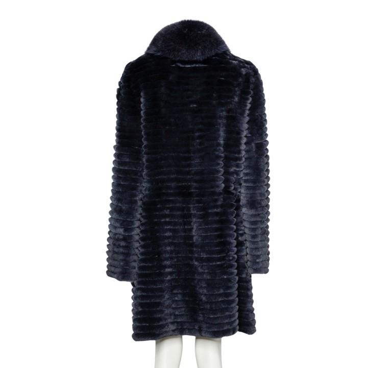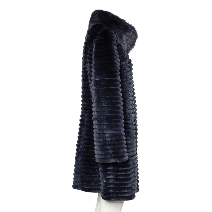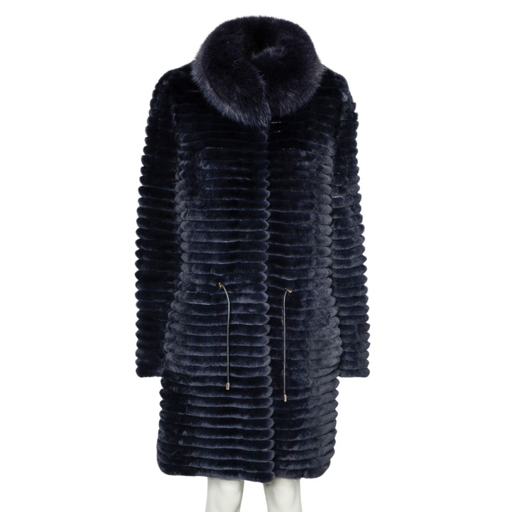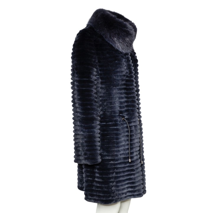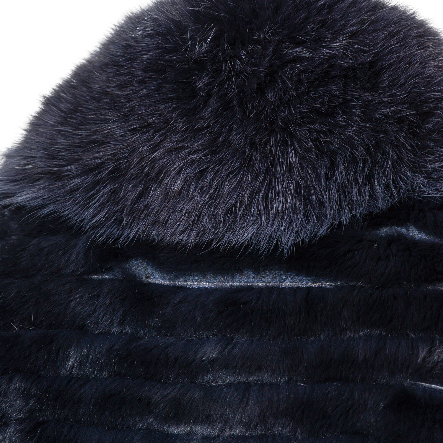 Quergearbeitete Rex-Rabbit-Felle mit blauem Fuchskragen und gestricktem Innenfutter. Mit Taschen und Zugband an der Taille. Tragespuren vorhanden.