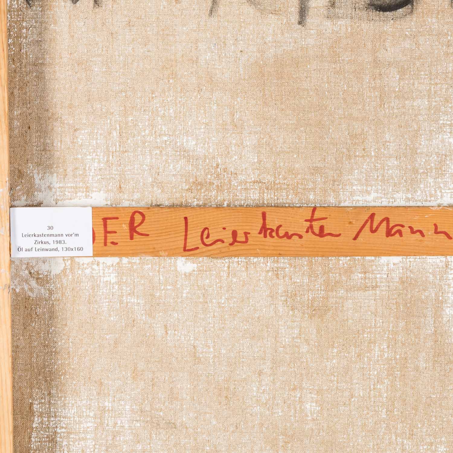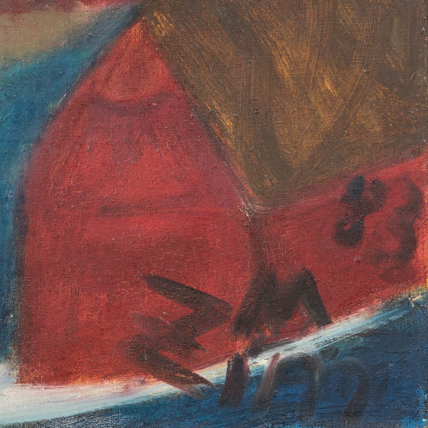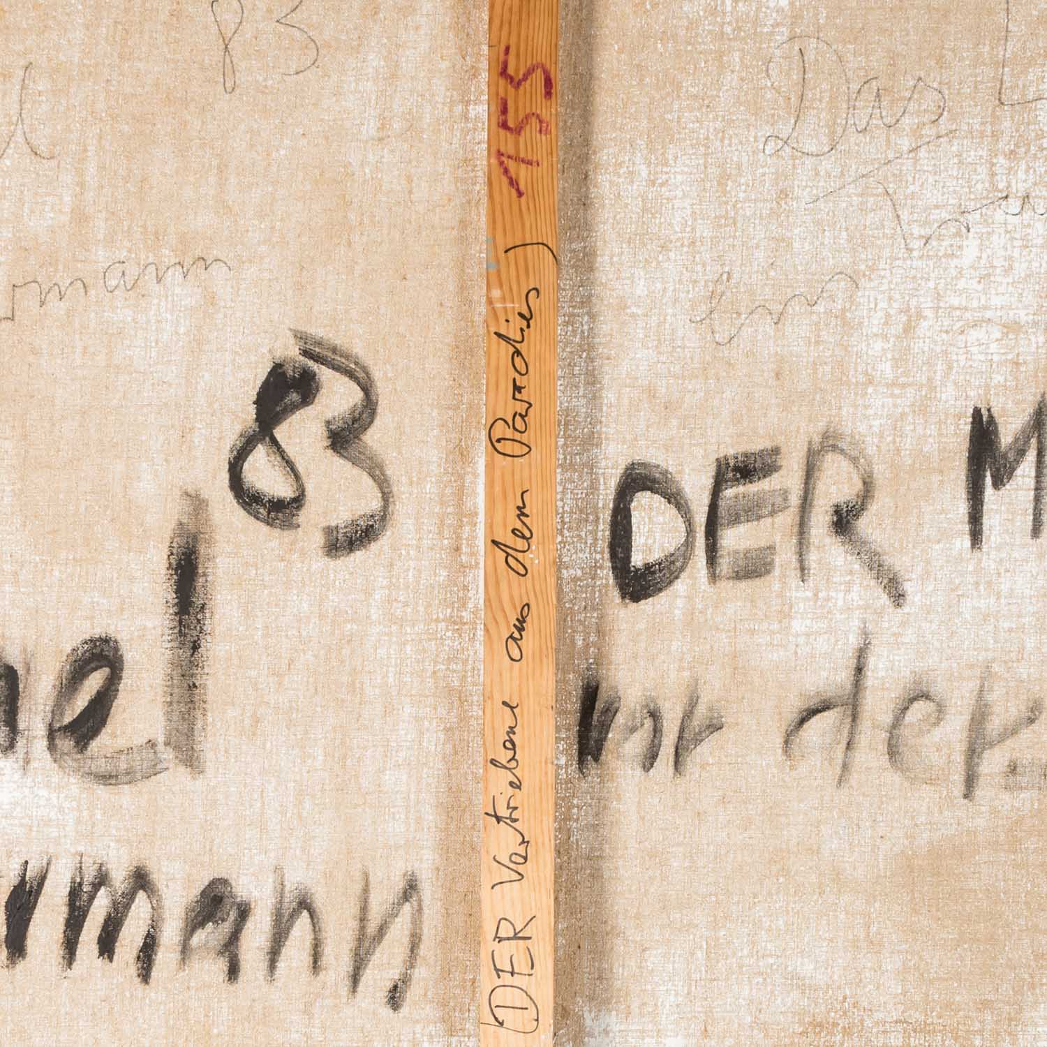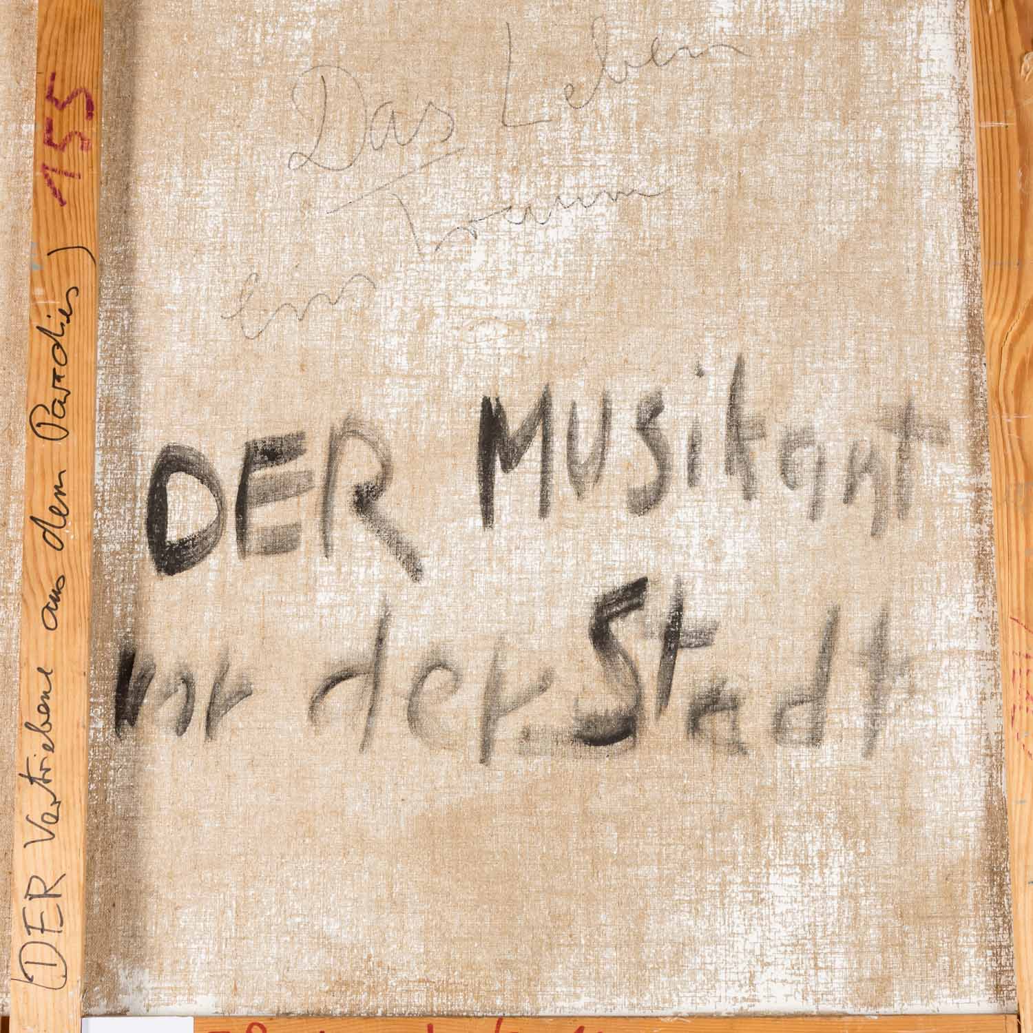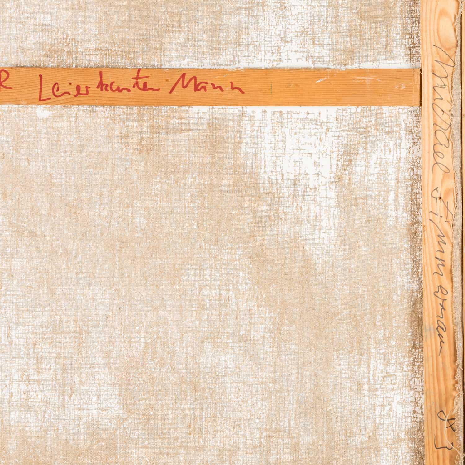u.re. signiert und datiert, Öl/Leinwand, HxB: ca. 160x130 cm (163x133 cm mit Rahmen). Alters- und Beriebsspuren, Farbabplatzer. Mit Rahmen (Alters- und Beriebsspuren). VERSO Etikett mit Werkangaben, bez. und vom Künstler mehrfach unterschiedlich betitelt.