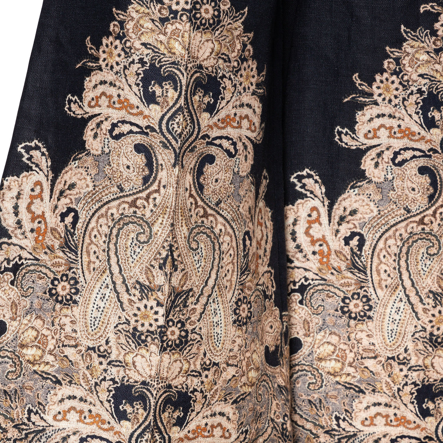 100% Leinen in Dunkelblau mit Paisley-Muster und ausgestelltem Saum. Sehr guter Erhalt.