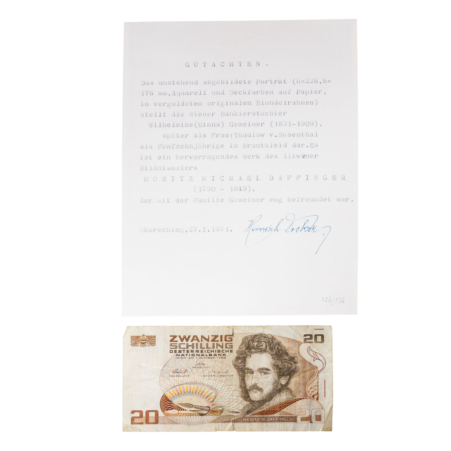 Aquarell mit Deckfarben gehöht auf Papier, es handelt sich wohl um ein Portrait als Geschenk an die junge Braut aus einer eng befreundeten Familie des Malers. HxB: 22,5/17,5 cm (34/28,5 cm mit Rahmen). Leichte Altersspuren. Dem Bild ist neben dem Gutachten ein 20 Schilling Schein beigelegt, welcher den Künstler im Portrait abbildet.Die Zuschreibung erfolgt durch ein beiliegendes Gutachten des Kunsthistorikers und Autors Heinrich Decker.
