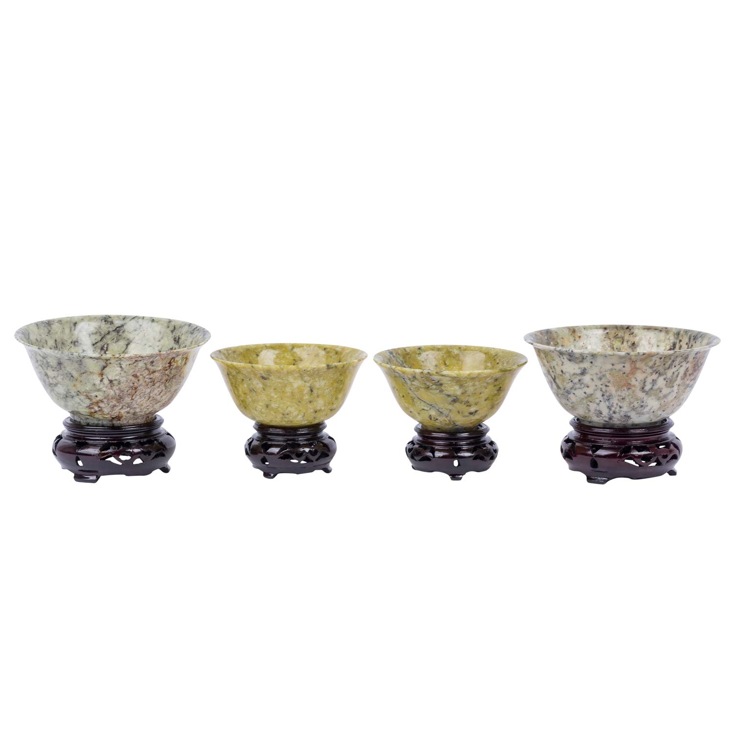 1.) Paar Jadeschalen, D: 10 cm, mit dazugehörenden Holzpodesten, im Originalkarton (besch.). 2.) Paar Jadeschalen, D: 12,5 cm, mit dazugehörenden Holzpodesten.
