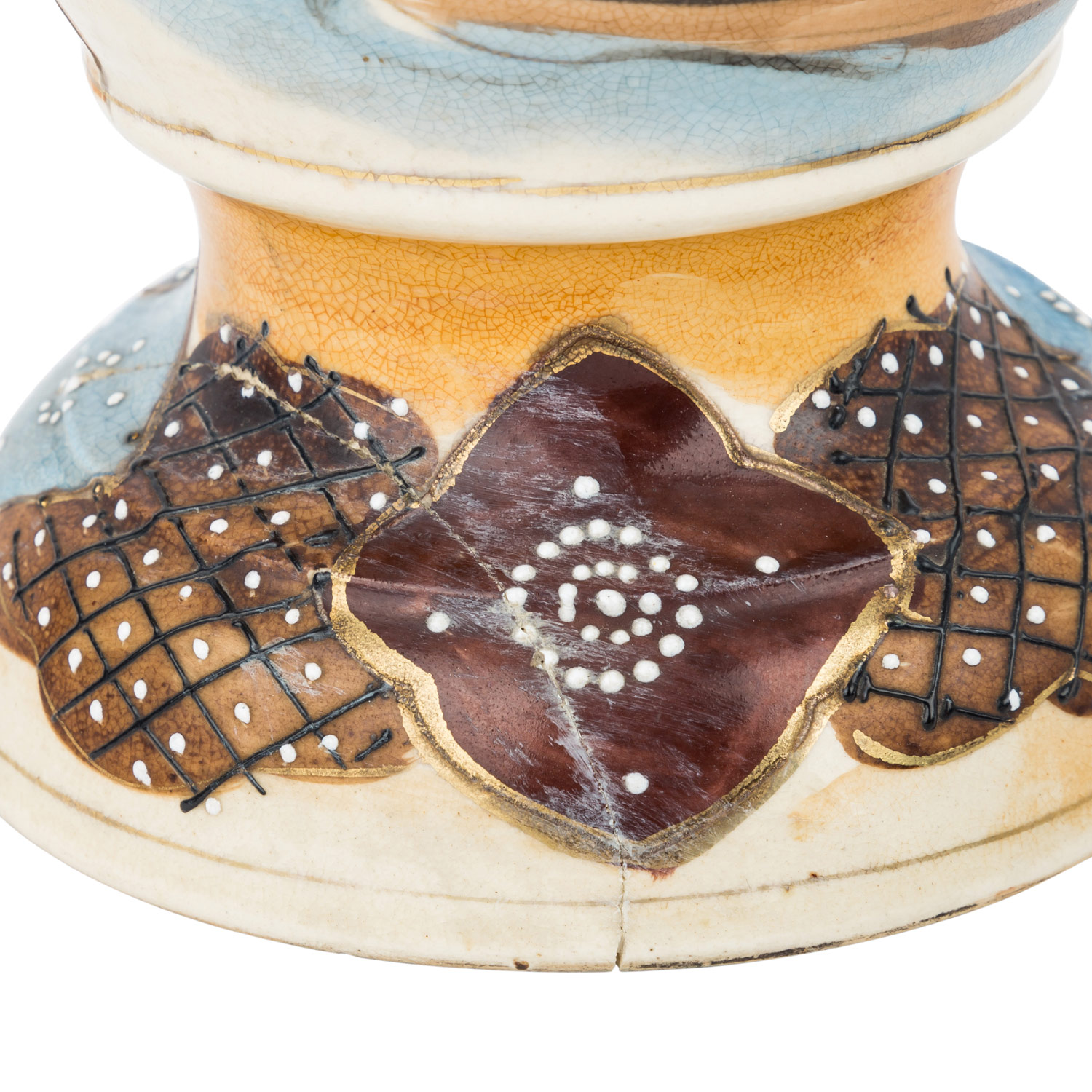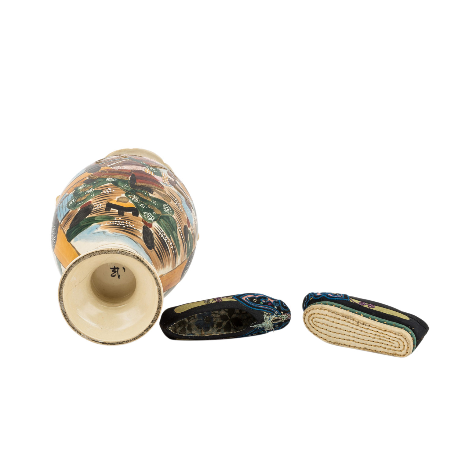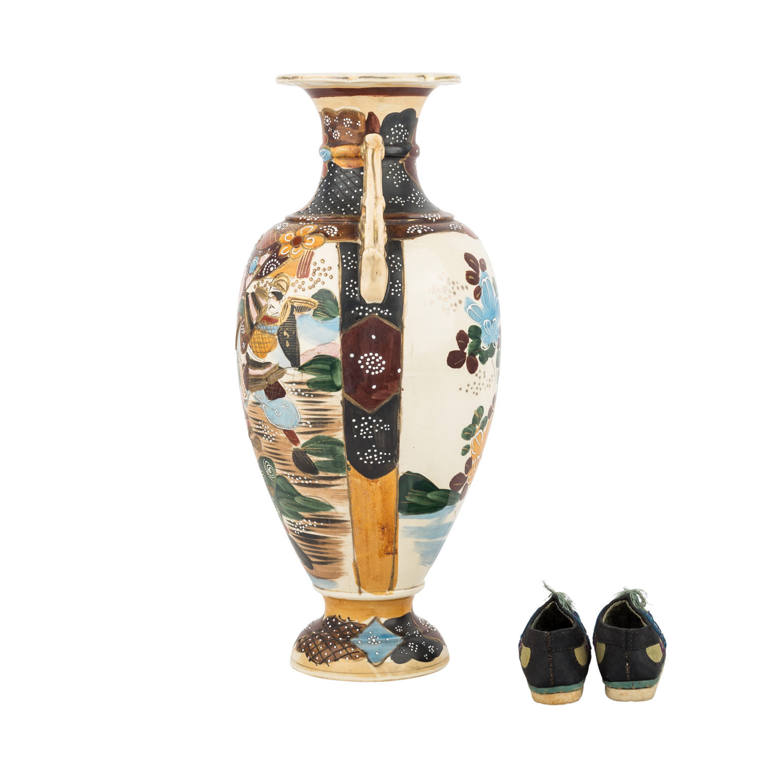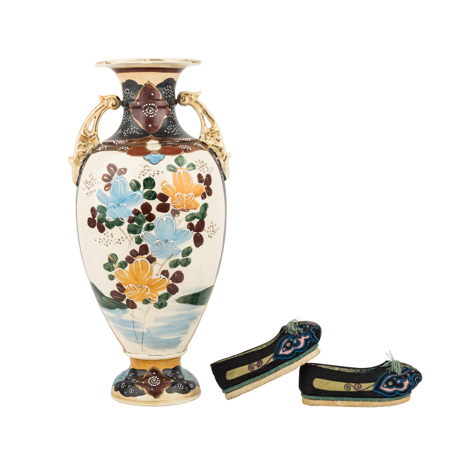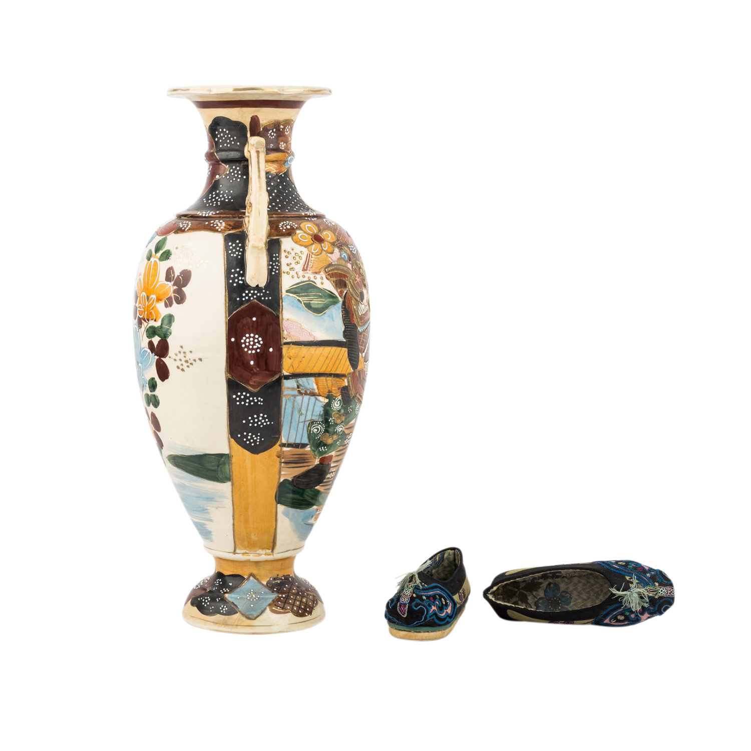 1 Henkelvase im Satsuma-Stil, H.: 47 cm, besch. und geklebt am Standfuß sowie 1 Paar Kinderschuhe aus besticktem Stoff, L.: 17 cm.